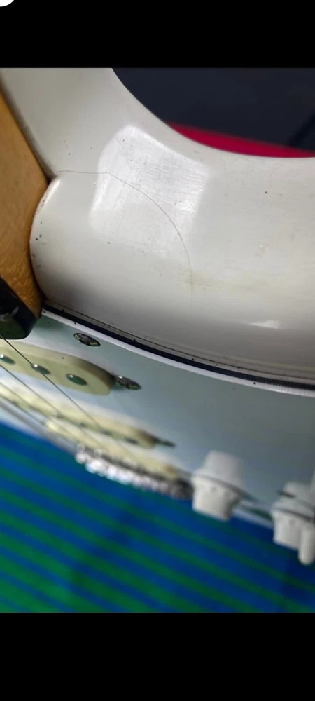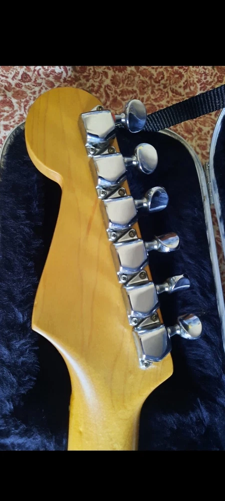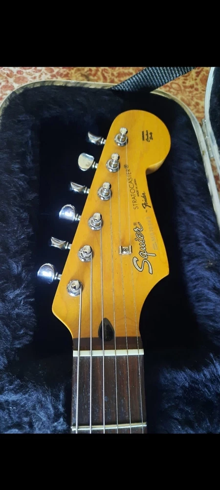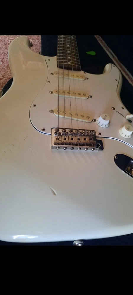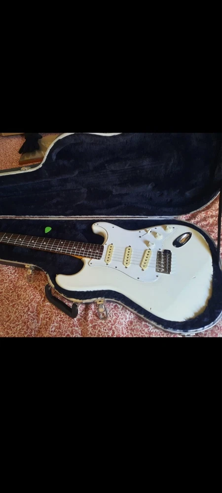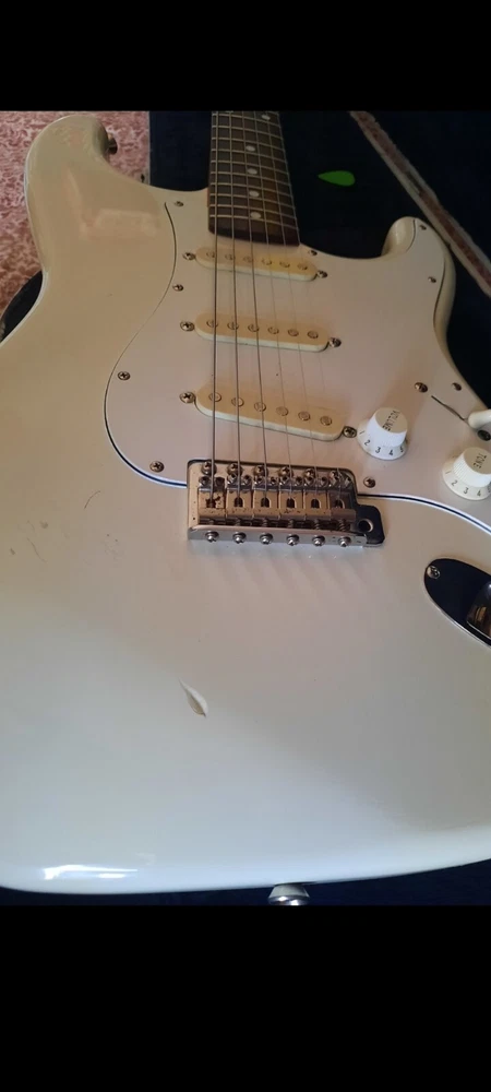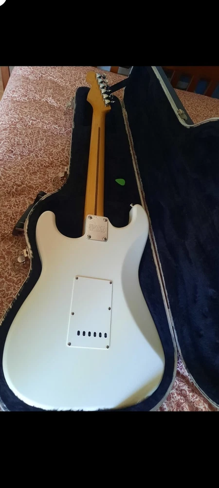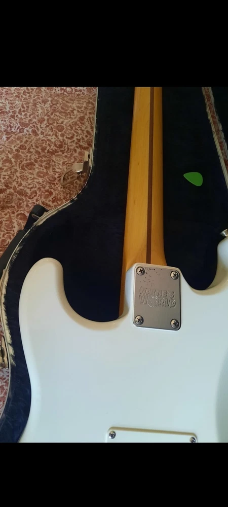 The "Wayne's World Fender Squier 92-93" is a professional-level electric guitar with a solid white body. This 6-string guitar is a model from 1993 and was manufactured in Japan. It features a right-handed configuration and is a part of the Fender Squier brand. The guitar is likely a limited edition model inspired by the movie "Wayne's World," known for its distinctive design and potentially collectible status. Party on.