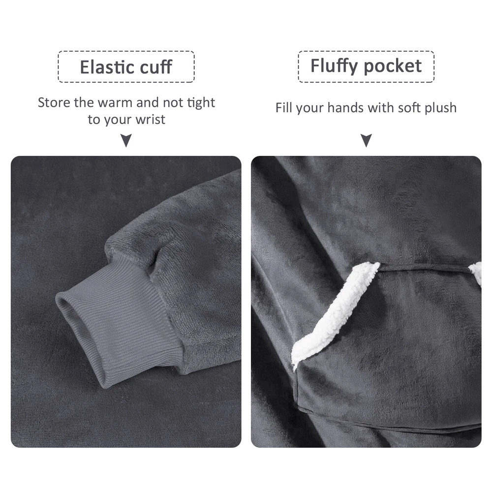 Preface Our wearable blanket combines versatility and comfort into one. You can go anywhere without feeling cold with our blanket hoodie. Blanket sweatshirt moves with you while providing mobility and cover. Features: Double-faced Fabric: Our wearable blanket uses double-faced fabric and provides you different touch feeling. The flannel fleece fabric is smooth and comfy. The sherpa fabric can provide you extremly soft and warm. One Size Fits All: The dimenions of the wearable blanket is 51x63 inches that means very fit to anyone. Adults, teenage boys and girls can wear it easily. Its also great gift idea for your beloved ones. Oversized Hood: The big plush hood can keep your head, ear, neck from feeling cold. The thickened design hood even can be used as a pillow. Elastic Cuffs: Loose sleeves can keep you stretch your arms at will. Tight and elastic cuffs prevent cold air from entering the cuffs. The material in wrists possesses high resilience and fits all, offer extra warmth and comfort, suits for those who have high demand for comfort. Large Pocket Our blanket hoodie is more convenient and practical than traditional hoodie blankets. There is a big pocket to hold remote, phone, snacks and so on. Leaving Your Hands Free. For Home and Outdoor Activities: Our blanket sweatshirt can not only be used at home, but also can provide you with warmth during outdoor activities. You can go out to climb mountains, picnics, and other entertainments with friends and family members. Specification Type: Fleece Sweatshirt Blanket Material: Flannel, Sherpa fabric Color: Royal Blue, Burgundy, Black and Red Plaid Size: One Size :51x63 inches Gender: Unisex Shoulder: 28.3 in / 72 cm Sleeve: 19.2 in / 49 cm Length: 34.6 in / 88 cm Style: Loose and Casual Package Content 1 x Fleece Sweatshirt Blanket