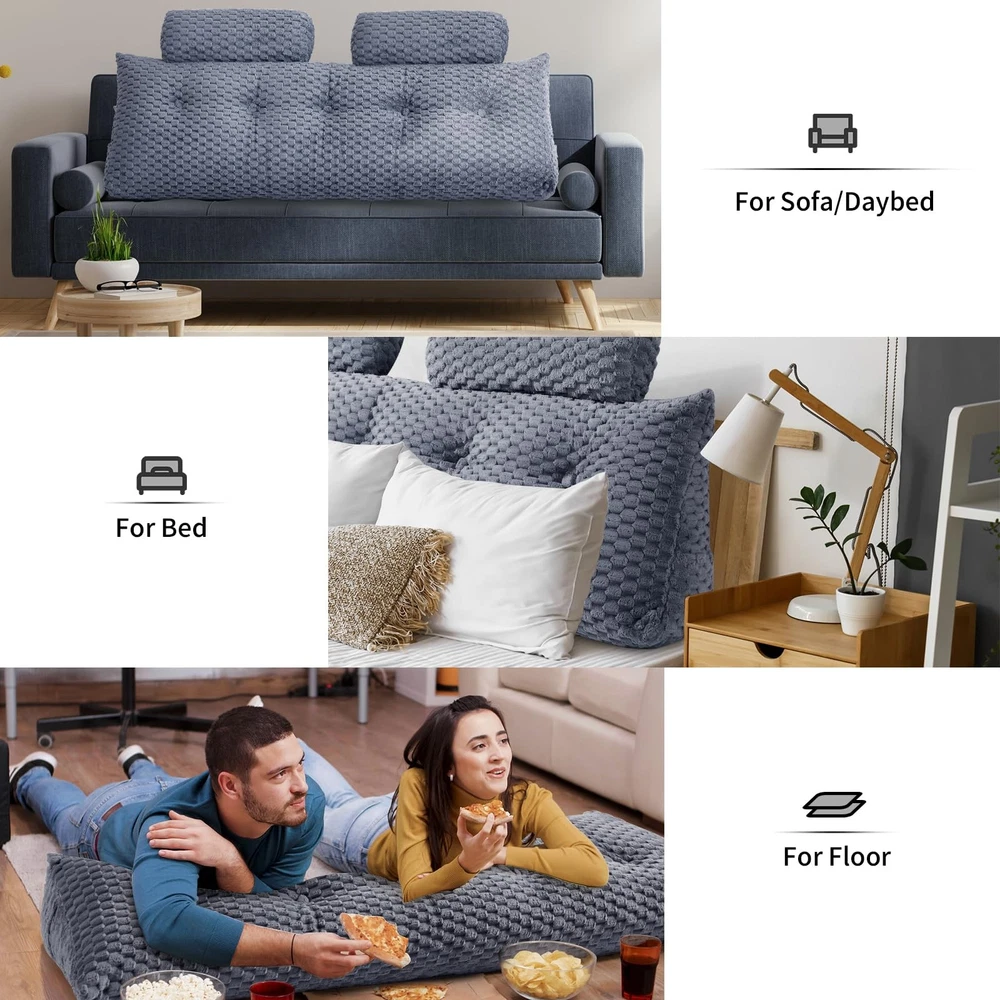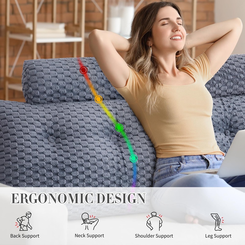 Bed Wedge Pillows - the perfect solution for those seeking ultimate comfort and back support while relaxing in bed. The four-point back support system is designed to fit the curve of your back, shoulders and lumbar area, keeping your body in the right position while effectively relieving back pain and soreness. Made with premium plush velvet fabric, our pillows are soft to the touch and provide a luxurious feel that will make you want to stay in bed a little longer. The additional head roll pillow adds even more comfort and support for your neck and head. Plus, with two side storage pockets, you can easily keep your phone, tablet, or book by your side. Firm attached buttons and top quality metal zippers ensure durability and longevity while the ergonomically designed to relieve your back pain and soreness, promoting better sleep and overall health. Whether you're reading in bed, watching TV, or simply relaxing, our pillows are versatile and ideal for all occasions. And when it's time for cleaning, our pillows are easy to maintain and keep clean. Say goodbye to poor posture and discomfort, and welcome the ultimate relaxation experience with Bed Wedge Pillows. [MADE FOR YOU] - Our package includes a triangular wedge headboard pillow and 2 roll neck pillow.The triangular pillow is as long as your mattress's width, offering an alternative to a headboard and perfect headrest.You can lean on any part of the headboard comfortably without moving pillow. ★NOTE: Please allow 48 hours for the pillow to restore its fluffiness after being removed from its vacuum bag. [HIGH QUALITY MATERIAL] - Our wedge headboard pillow is crafted from premium 3D velvet fabric that offers a plush texture and a luxurious feel. The 40D high-density polyester fiber fill offers excellent resilience, giving you long-lasting support when leaning against the headboard. Say goodbye to sore necks and backs with this comfortable and luxurious pillow. [ERGONOMIC DESIGN] - The headboard pillow is designed with your comfort in mind. The ergonomically shaped pillow conforms to the natural curvature of your back, providing the perfect support for your upper body, and easing the stress on your back and shoulders. Reading, watching and resting in bed will be more comfortable than ever with our headboard pillow. [MULTIPURPOSE AND OCCASSIONS] - The bed wedge pillow is perfect for a variety of occasions.Whether it's on a bed, daybed or floor, this pillow provides functional support for ultimate relaxation while watching TV, working on your laptop, or playing games. It's also a must-have for dorms and bedrooms, serving as both a decorative and comfortable addition to any space. [EASY TO MAINTAIN] - Our pillows are easy to maintain, featuring a convenient zipper closure. The cover is detachable and washable. Simply throw it into the washing machine for a quick clean-up, and it's ready to be used again.