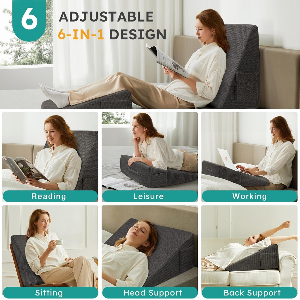 Wedge Pillow for Sleeping, 8 inch Bed Wedge Pillow, Elevated Body Pillow for Back Support, Acid Reflux, Leg, Neck Pain, Snoring, Triangle Pillow Wedge - Cooling Memory Foam Top, Black 2 Layers of Comfort Foam: Our wedge pillow features two layers of premium comfort foam. The top layer consists of gel-infused memory foam, keeping you cool and comfortable throughout the night. And high-density premium foam base offers sturdy support and durability. Breathable & Washable Cover: The pillow's breathable cover allows for optimal airflow, ensuring a cool and comfortable sleep experience. Plus, it's easily removable and machine washable for hassle-free maintenance. 2 Pockets & Portable Design: Our triangle pillow wedge features two built-in pockets, ideal for storing remote controls, phones, or glasses. Additionally, its portable handle allows you to take it with you wherever you go for on-the-go comfort and support. Upgraded & Certified: We've upgraded our foam wedge pillow to ensure the highest quality standards. Standard 100 certified by CertiPUR-US and Oeko-Tex, giving you peace of mind knowing you're purchasing a reliable and trustworthy product.