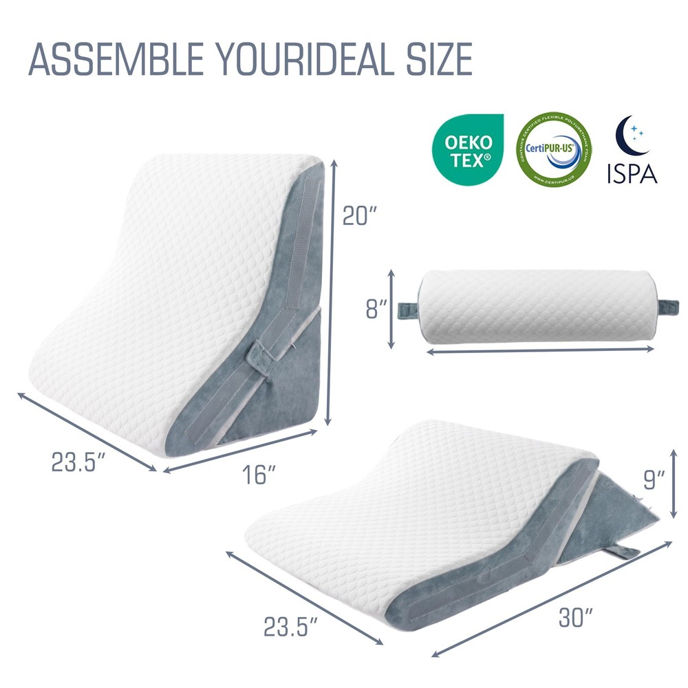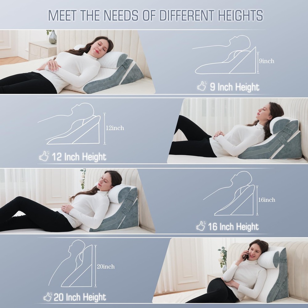 3PCS Bed Wedge Pillows for Sleeping Adjustable Memory Foam Pillow for Acid ADJUSTABLE MAGIC VELCRO - The wedge pillow set is your go-to for comfort and versatile support. Whether you need a cozy prop for watching TV, reading, or relieving body discomfort, this 3PCS adjustable wedge pillow delivers. Offering over 20 configurations, which can be used as head, back, or leg support, adapting to heights (9", 12", 16" or 20") and angles (30°, 45°, or 60°) to fit various sleep positions and relaxation needs. The pillow features lengthened and widened Velcro with an anti-hook design, preventing the material from catching on or damaging the pillowcase. IDEAL COMFORT - Featuring an upgraded 24" width, this pillow wedge is designed to wrap around your body, providing enhanced support and stability. The extra width ensures greater comfort for side sleepers, making it easier to turn over and find your ideal position without slipping off. This spacious design promotes a feeling of being cradled, helping to alleviate muscle tension and improve spinal alignment for a restful sleep or relaxation experience. SAFE CERTIFICATION - This bed pillows & positioners features a 45D high-rebound memory foam half-moon pillow at the headrest for superior contouring and comfort. The memory foam molds to the natural curve of your neck and head, providing tailored support that eases tension. The main body is made of 25D high-density support foam, ensuring firm, stable elevation that resists deformation over time while offering consistent full-body support. Moreover, our wedge pillow meets the highest safety standards, being certified by CertiPUR-US, ISPA, and Standard 100 by Oeko-Tex, making it a healthy choice for your sleeping needs. ERGONOMIC DESIGN - This bed pillow wedge cushion features a professional curved design to support the head, neck, back, waist, legs, and feet. Ideal for post-surgery recovery, it aids with snoring, acid reflux, heartburn, indigestion, nasal congestion, and more. Perfect for reading, watching TV, working, or relaxing, it promotes better sleep, reduces discomfort, and enhances overall health by providing targeted support for various conditions, including post-operative swelling and high eye pressure. EASY TO CARE - The diamond check pattern adds a beautiful, stylish touch that complements your décor, while the invisible zipper design provides a sleek, seamless look. The wedge pillow set features a removable, washable cover for hassle-free cleaning. For convenience, please close the Velcro before removing the cover, making it easier to take it off. The durable, high-quality materials maintain their shape and comfort even after multiple washes, ensuring long-lasting use. WARM TIPS - The wedge pillows are vacuum-packed for efficient transportation. We recommend placing the wedge pillow in a well-ventilated area for 24-72 hours upon receipt to allow it to naturally expand to its original shape, ensuring optimal performance. Always allow the pillow to fully dry before use to preserve its shape and support. Avoid exposing to direct sunlight for prolonged periods to maintain the fabric’s quality.