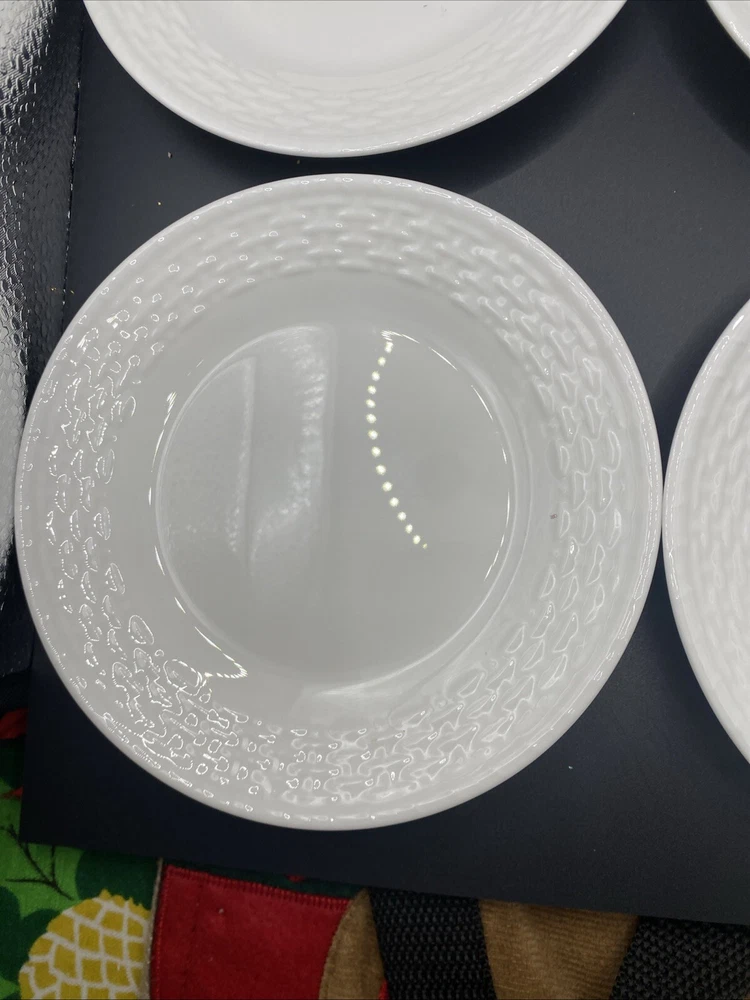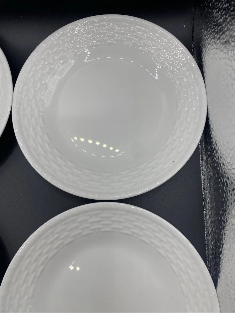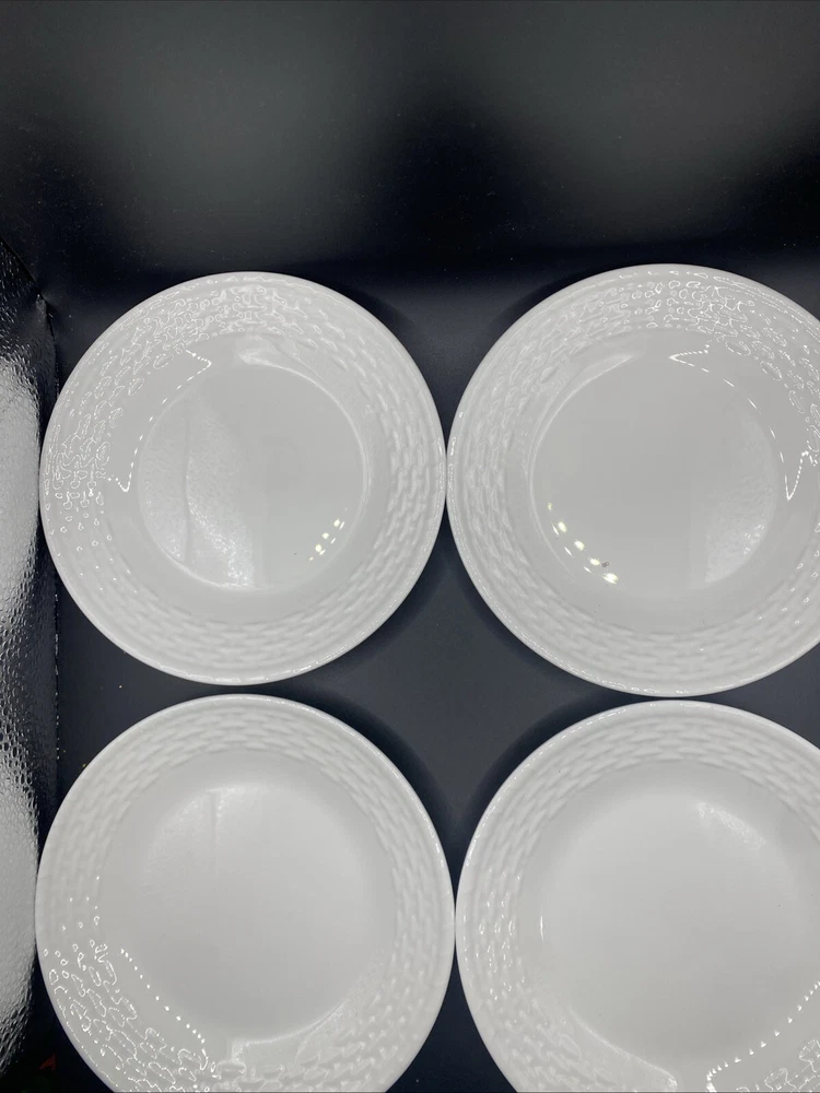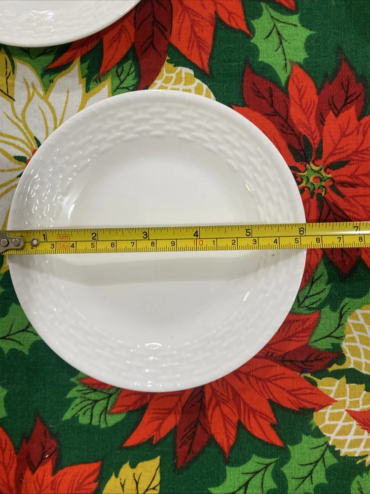 Add a touch of elegance to your dining table with this set of four Wedgwood Nantucket basket weave bread and butter plates. These plates measure 6 inches in length and width and feature a beautiful white bone china material with a painted backstamp. The plates are dishwasher safe, making them perfect for use on any occasion. The round shape and basket theme of these plates make them a great addition to any decorative cookware, dinnerware, or serveware collection. They were manufactured in England in 1986 and are an original Wedgwood product. This set includes four bread and butter plates and is perfect for all occasions.