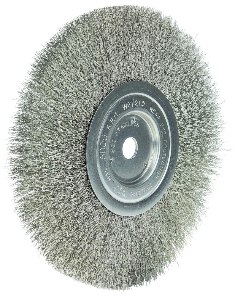 Weiler 01795 8" Narrow Face Crimped Wire Wheel, .0104" Stainless Steel Fill, 5/8" Arbor Hole, Made in The USA (Pack of 2) Product Details Size: .0104 Wire Size Style: Pack of 2 Brand: Weiler MPN: 01795 UPC: Does not apply EAN: Does not apply Material: Stainless Steel Brand: Weiler Grit Material: Stainless Steel Bristle Type: Stainless Steel Compatible Material: Stainless Steel;aluminum;brass;bronze;copper;high-nickel Alloys;inconel;pewter;platinum;titanium Package Dimensions : 8.58 x 8.46 x 2.24 inches; 1.3 Pounds Item model number : 01795 Date First Available : March 11, 2020 Manufacturer : Weiler Best Sellers Rank: #326,329 in Industrial & Scientific (See Top 100 in Industrial & Scientific) #446 in Abrasive Wheel Brushes #446 in Abrasive Wheel Brushes Customer Reviews: 4.6 4.6 out of 5 stars 18 ratings THE TRUSTED BRAND: For use on straight grinders, stationary bench or pedestal grinders, and buffing lathes REDUCED WIRE BREAKAGE: Crimped filaments help reduce wire fatigue caused by vibrations, bending, and flexing GREAT UNIFORM BRUSHING: Gives consistent brushing as filament tips expose fresh cutting edges with normal use NO CORROSION: Stainless steel fill brushes are great for working on stainless steel or aluminum surfaces MADE IN THE USA: Wheel dia 8 in, width 3/4 in, fill dia .0104 in, trim length 2-1/16 in, max rpm 6000 Weiler Wheel Brush, Narrow Face, 8 in Brush Dia, 3/4 in Face Width, 5/8 in Arbor Hole Size, Crimped Filament/Wire Type, 0.0104 in Filament/Wire Diameter, Stainless Steel Fill, 2-1/16 in Trim Length, 6000 rpm Maximum, Unthreaded Arbor Attachment. Weiler 8" Narrow Face Crimped Wire Wheel Brush provides a flexible brushing action and consistent performance for demanding light duty cleaning and deburring applications. 5/8" Arbor hole for use on bench/pedestal grinder, CNC/milling/automatic machines and straight grinders. At Weiler, we passionately embrace change to improve our products and our processes to move the company and our customers forward. By bringing new ideas and creative problem solving together in an open, collaborative environment, we will improve our customers’ productivity and create profitable growth. Weiler Abrasives is eager to create a collaborative partnership to overcome your toughest cleaning, grinding, cutting, de-burring and finishing challenges. Weiler manufactures precision brushes, abrasives, and maintenance products. The company was founded in 1898 in Germany, is headquartered in Cresco, PA, and is International Organization for Standardization (ISO) 9001 certified.