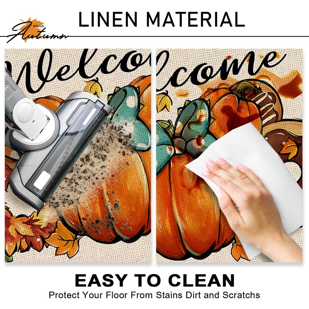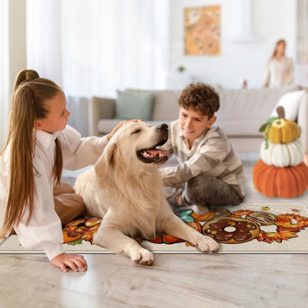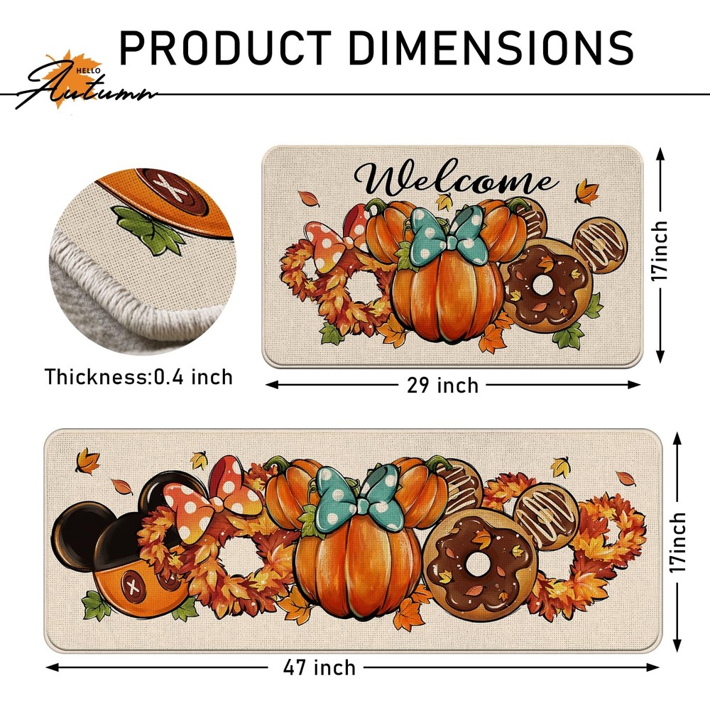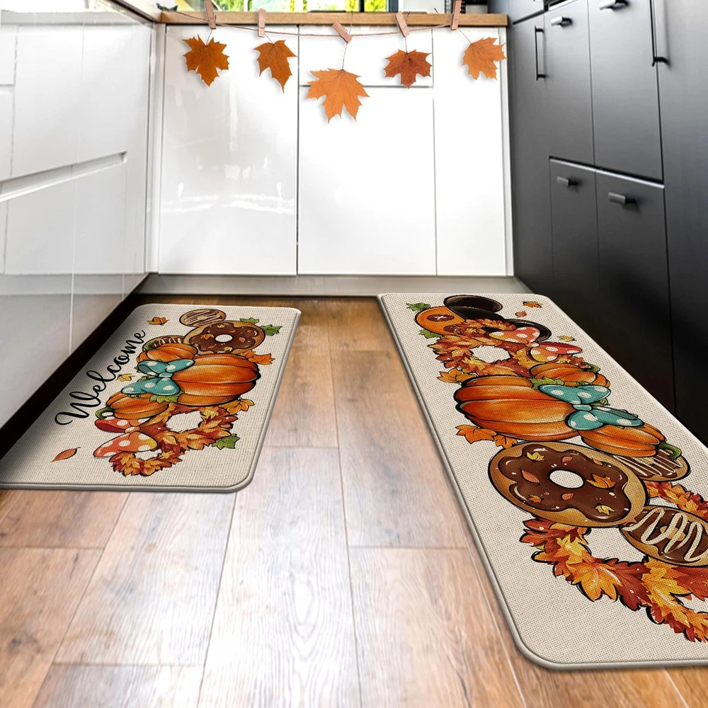 aims to uphold the core principles of high quality and helping customers. specializes in premium quality and stylishly designed home floor mats and rugs. Help customers decorate their dream houses. Durable and non-slip kitchen mat The anti-fatigue kitchen mat is designed with an attractive texture on the top, and the kitchen mat has a non-slip bottom to ensure the mat stays in place for added safety and stability. Water under the carpet may cause slippage, use it on a dry surface. Beautiful kitchen mat for home decor Our kitchen mats make a beautiful and warm addition to your kitchen, dining room, indoor entryways and craft rooms. This 2 pieces mats set is also suitable for outdoor entryways, balcony and office spaces. They are perfect mats set to brighten up your kitchen for less. Specifications: Material: Linen, rubber Color: Multi-color Set of 2:1PC 17" x 29" kitchen mat, 1PC 17" x 47" kitchen mat Notice: Due to manual measurement, the doormat size has an error of ±0.2. To keep it clean and beautiful, please clean it regularly. But please note that no machine wash is required, just rinse water. Attractive Unique Design: The non-skid doormat top was printed with pumpkin, wreath, doughnut patterns. Not only is it a beautiful and creative way to decorate your home, but it also brings you a deeply cheerful festive atmosphere in fall, autumn, Thanksgiving, Friendsgiving Comfort Standing Kitchen Mat: This cushioned switch mat features non-slip recycled rubber on the back and low-profile linen felt on the top to reduce chances of tripping. Besides, the low-profile rug has a high-quality durable construction that effectively resists stains 2-Piece Kitchen Rug: There is a door rug and a long kitchen runner rug in the package, which measures 17" x 29" and 17" x 47". One short and one long make these padded mats (alfombra para cocina) be the perfect size for kitchen Perfect For Home Decor: The seasonal floor rugs are perfect for indoor kitchen, sink floor, living room, bathroom, office, laundry, foyer, entryway, doorway, outdoor, porch, deck, patio entrances, veranda, balcony, restaurant kitchen, holiday decor. Just place it anywhere you want. Add pop colors to decor your home and protect your floors, too Easy To Clean: Cleaning of kitchen carpets is quick and easy, just spray with a hose or use a sponge and mild detergent to remove dirt. Do not bleach or dry clean, do not wring and let it air dry. Our washable kitchen rugs are rigorously tested to ensure they last for a long time and retain their shape after washing