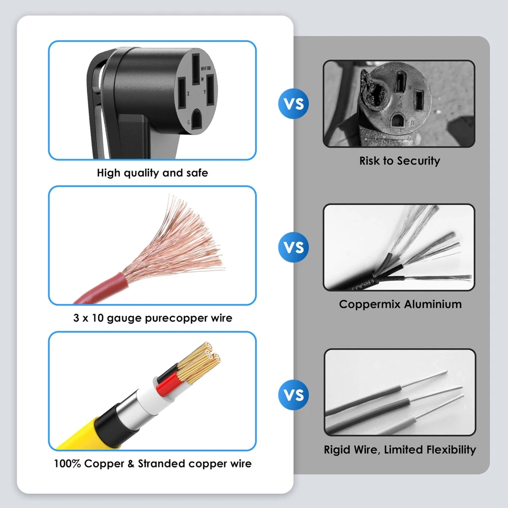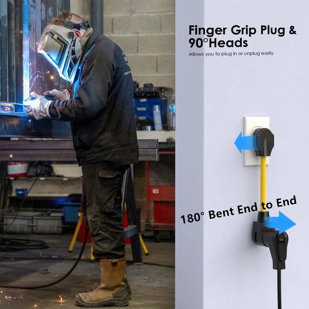 Male Plug: 50 Amp NEMA 14-50P male plug connected to RV or generator power socket Female Socket: 50 Amp NEMA 6-50R female socket connects to your NEMA 6-50 welder plug Upgrade: Both plugs are right angle, 90-degree bent design, 50 Amp, 250 Volt, Max wattage 12500 watts, 12 Inch Sturdy: 8 AWG pure copper cord with PVC in UL 62 standard for overheating resistance, and plug-in UL 817 standard; good conductivity, and more flexibility, especially flame retardant, heat, and UV resistance ETL Listed: Our cords are ETL Listed and have undergone thorough testing to ensure their quality and reliability