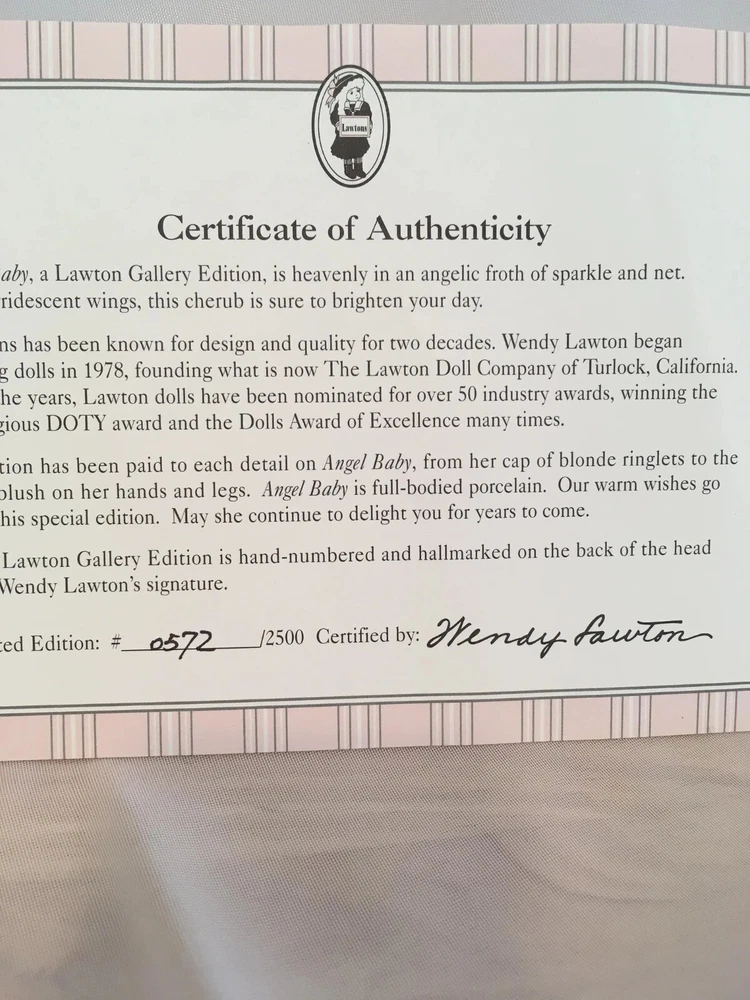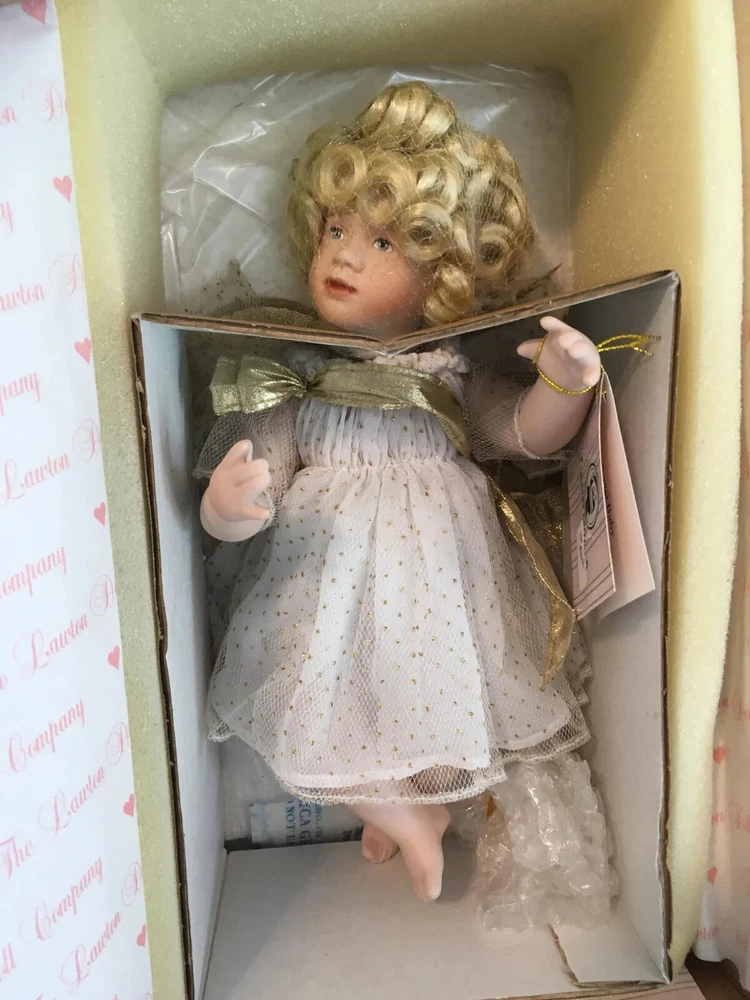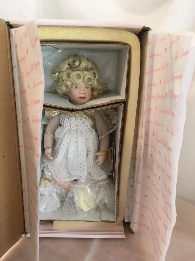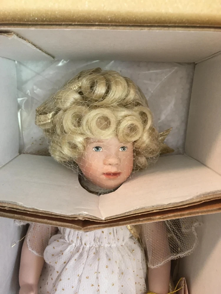Never removed from box # 572 of 2500 12" artist doll, mint NRFB; never removed from box Wendy Lawton Doll Company Full body porcelain , Jointed at neck, arms and legs Blonde wig Blue eyes Gold lame' wings Painted face and eyes Doll is signed on back by Wendy Lawton. She is complete in her outfit. Doll and clothes are new. Slight blush on hands and legs, blonde ringlets, gold sparkle and netting. If you like detail, this little lady is for you; adorable. Look close; ask questions Thank you