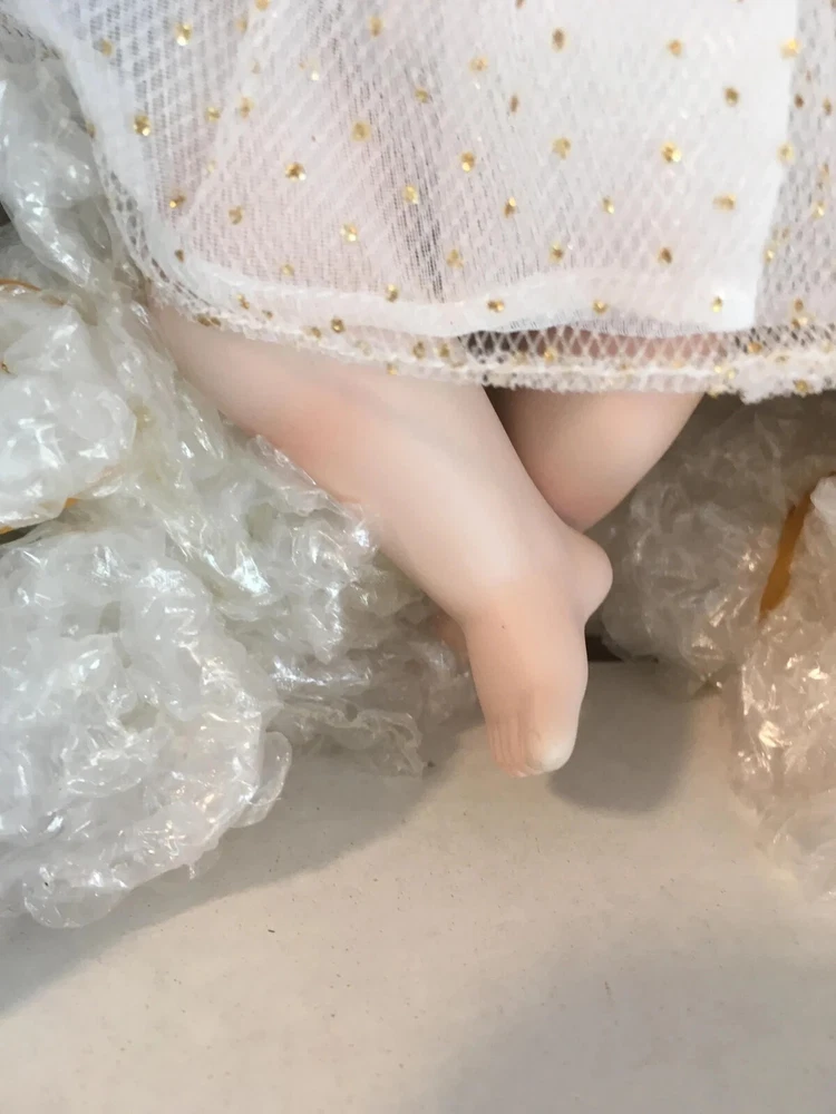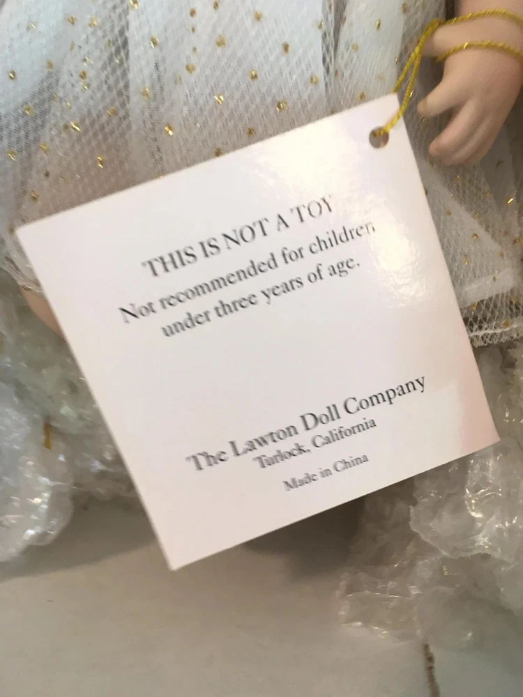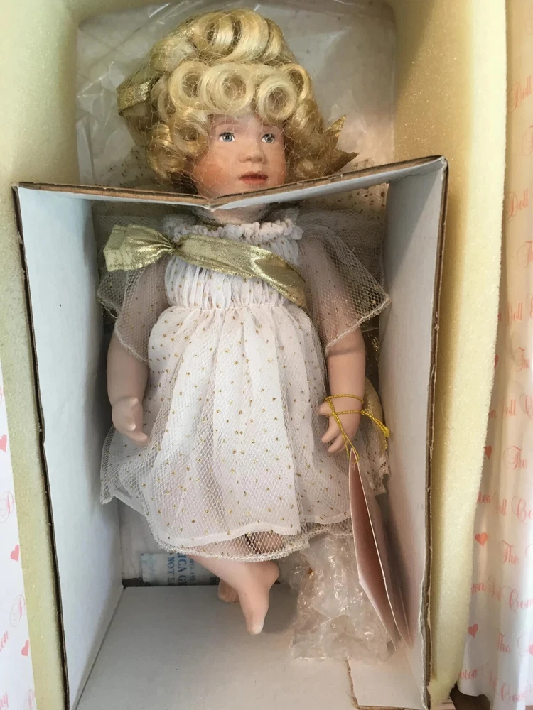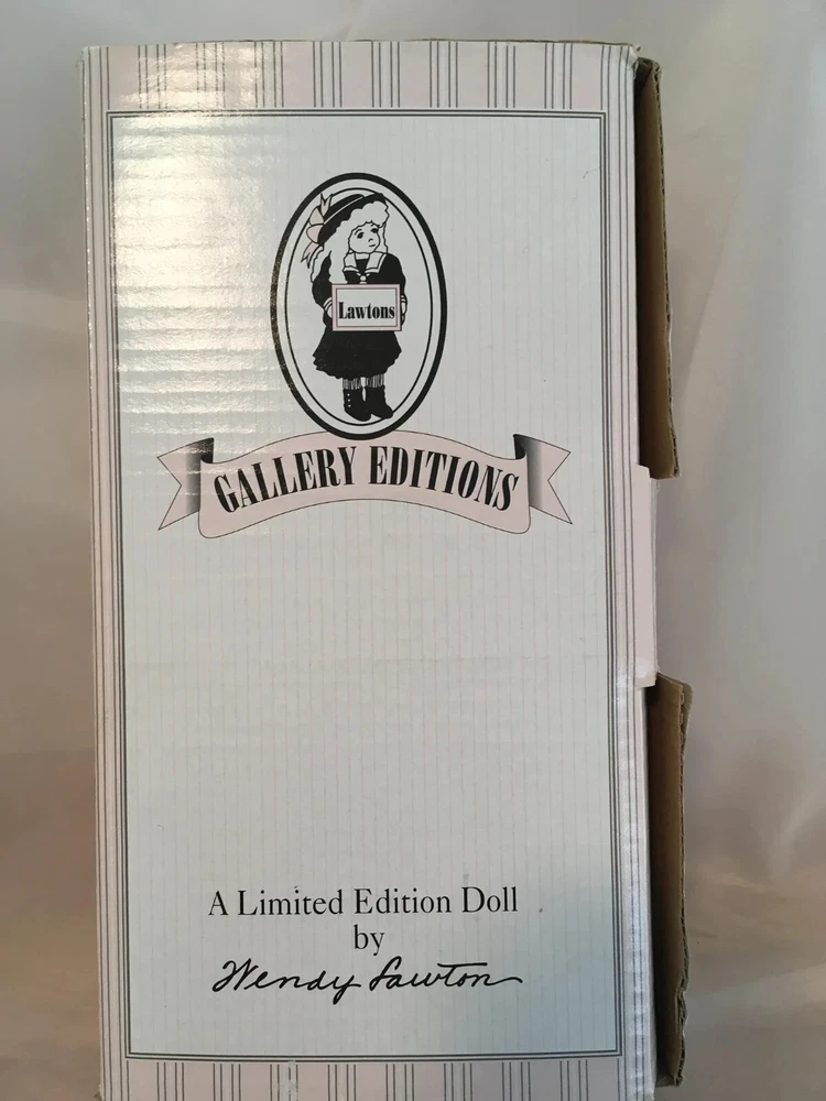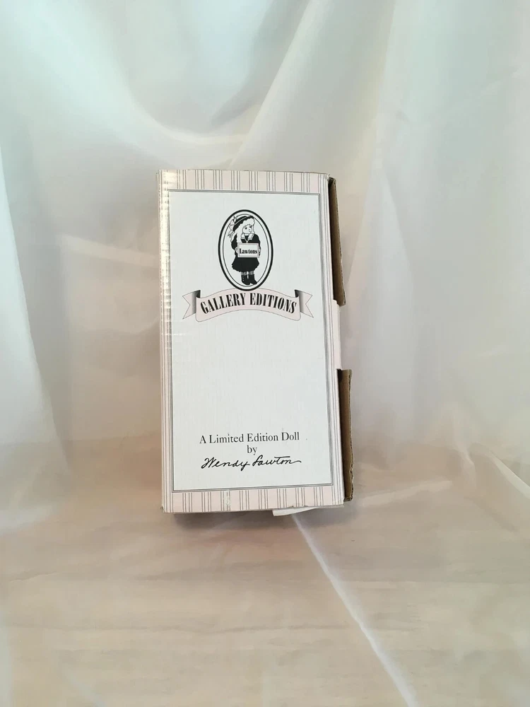 Never removed from box # 572 of 2500 12" artist doll, mint NRFB; never removed from box Wendy Lawton Doll Company Full body porcelain , Jointed at neck, arms and legs Blonde wig Blue eyes Gold lame' wings Painted face and eyes Doll is signed on back by Wendy Lawton. She is complete in her outfit. Doll and clothes are new. Slight blush on hands and legs, blonde ringlets, gold sparkle and netting. If you like detail, this little lady is for you; adorable. Look close; ask questions Thank you
