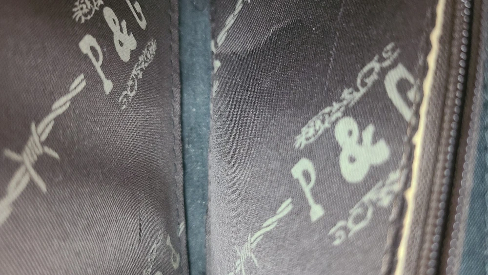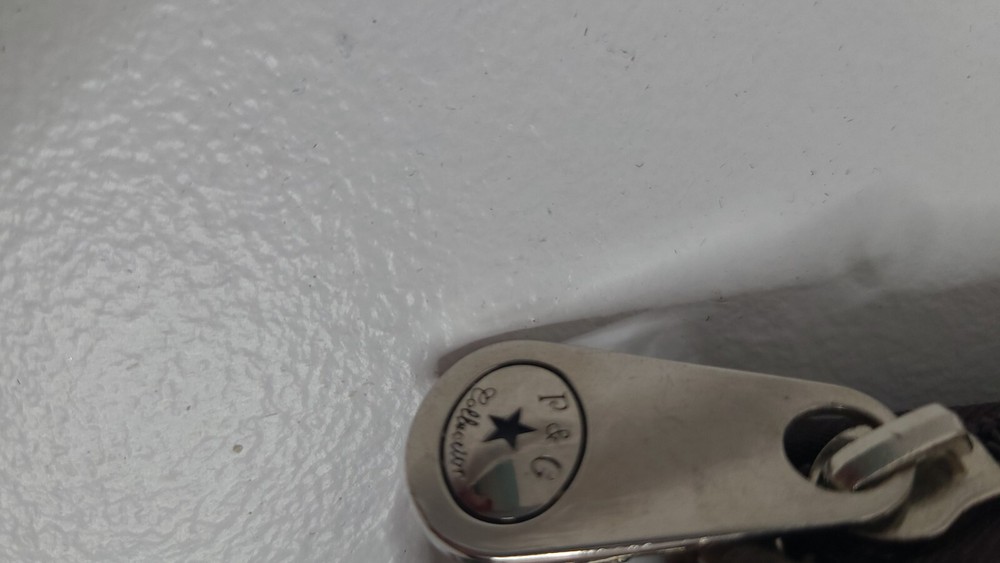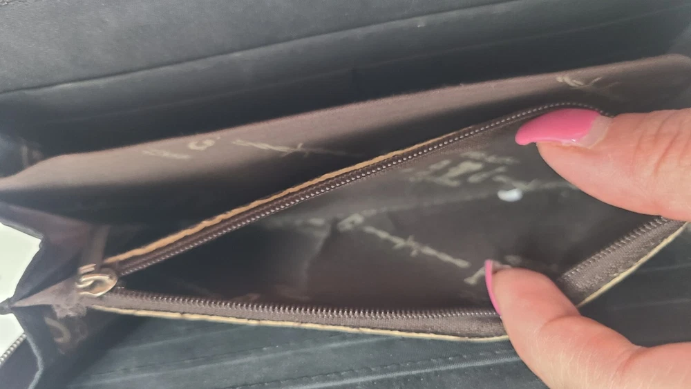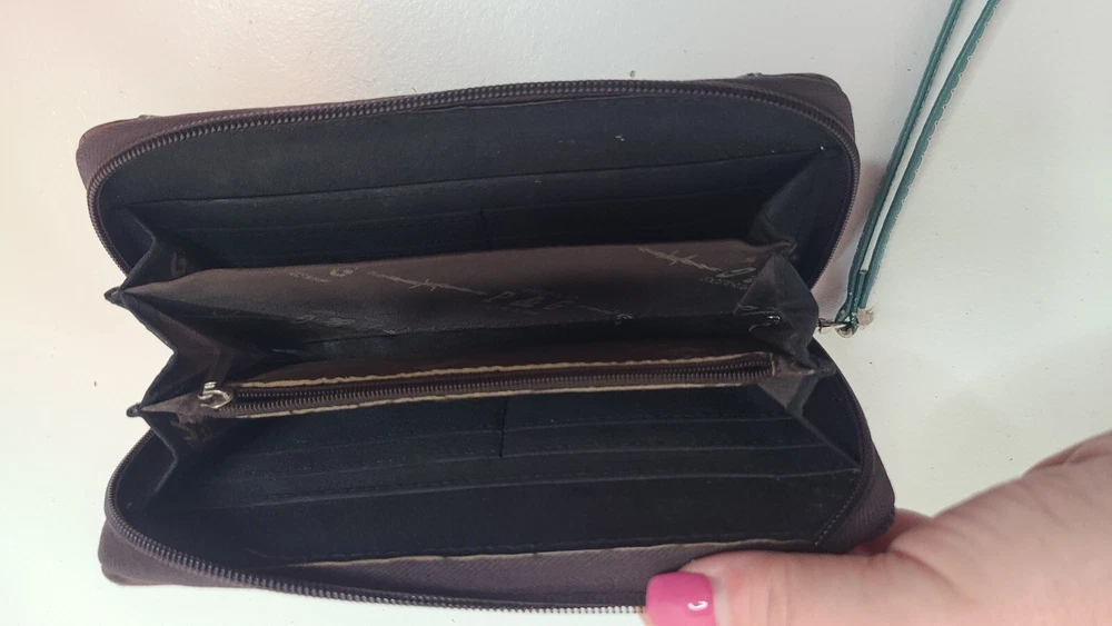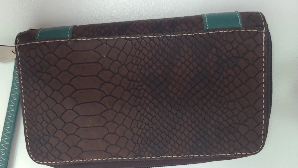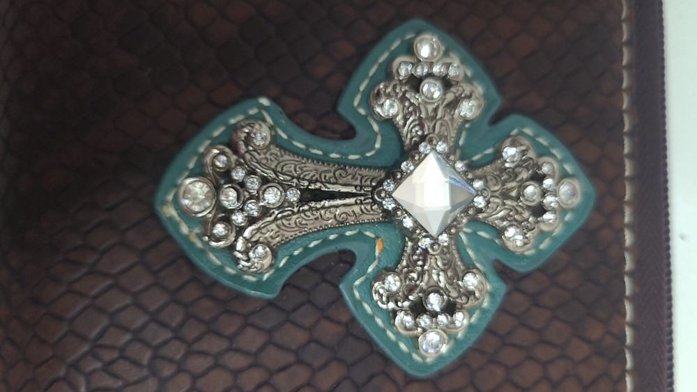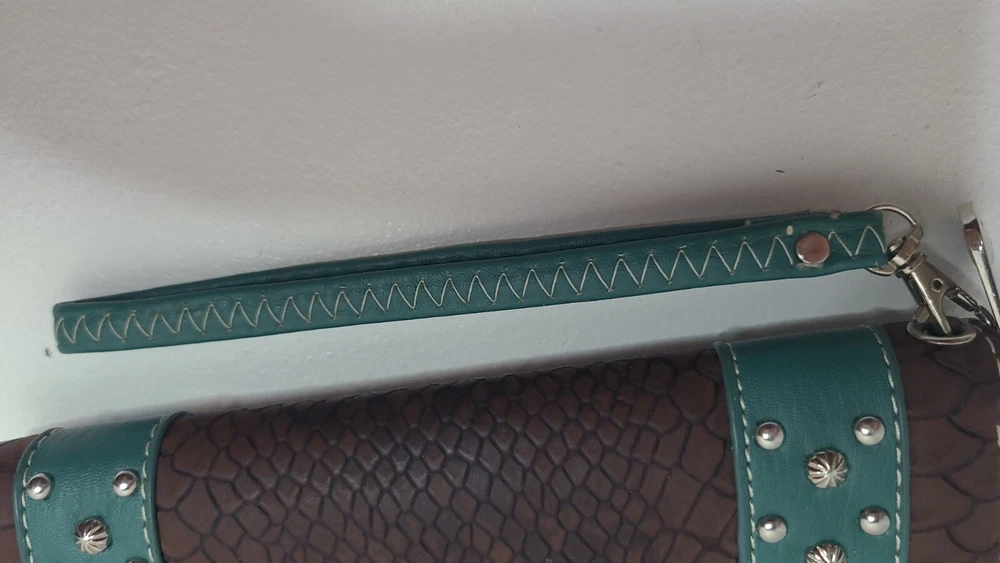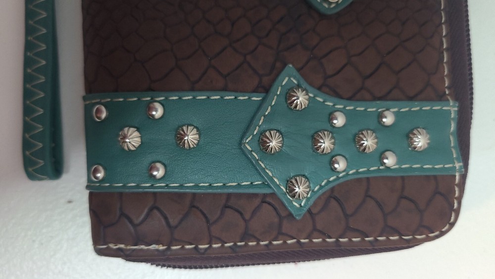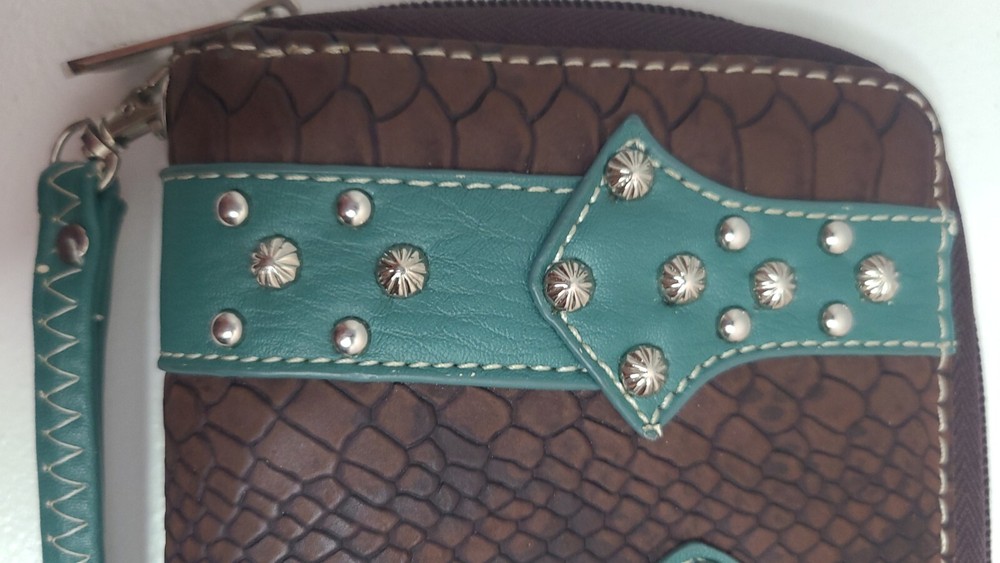 Add some sparkle to your western style with this blingy P&G Collection clutch wristlet wallet. The wallet features a textured faux leather material in a brown hue with studded and rhinestone accents. It's perfect for women on the go and comes with credit card features to ensure all your essentials are safe and secure. The wallet is designed with a turquoise brown cross pattern that adds a western touch to your outfit. The wristlet style allows for easy carrying, making this wallet a perfect accessory for any occasion. Flaw pictured on strap.