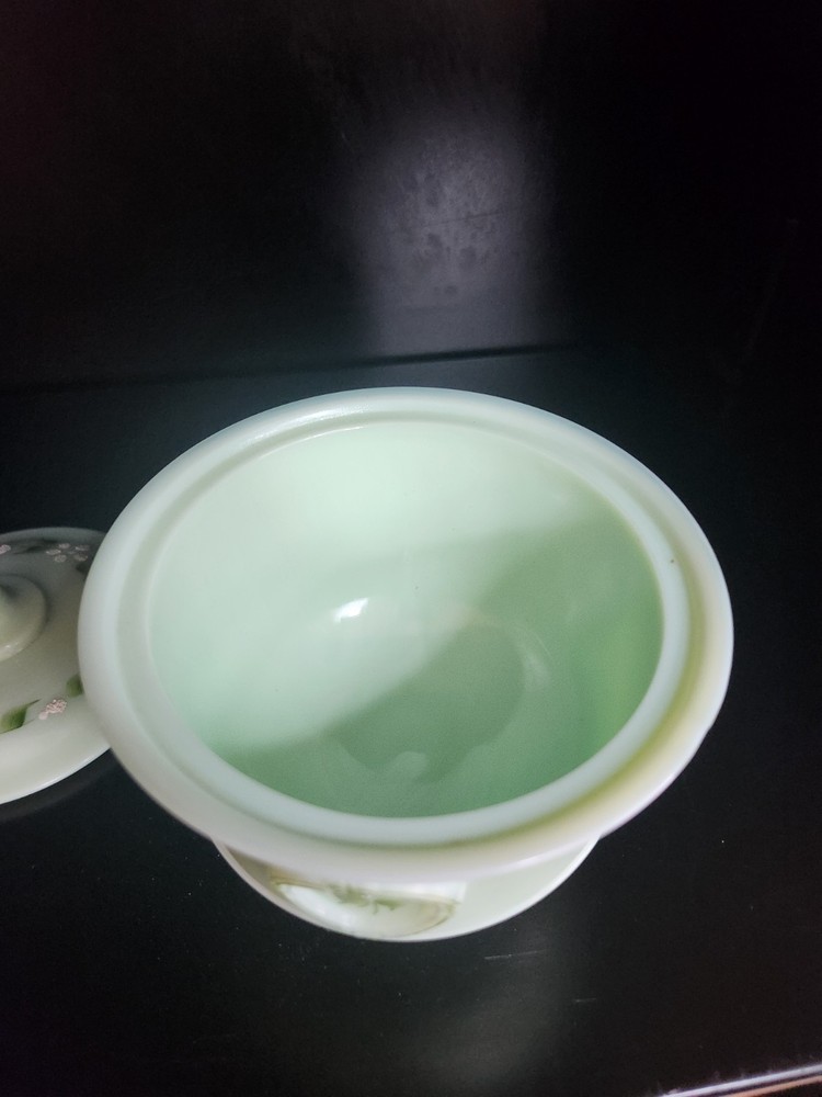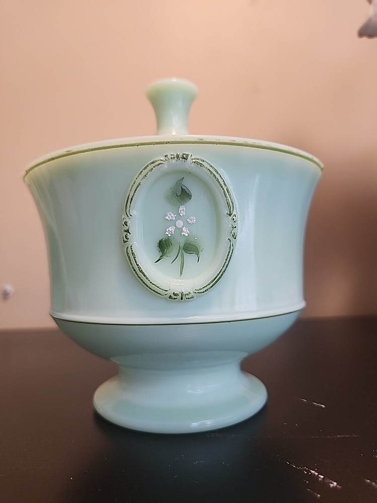 This vintage Westmoreland candy dish is made of green opaque glass in the Jadeite style. It features handpainted details and a covered design. The dish has one compartment and is artist signed. Produced between 1970-1979, this collectible piece is a beautiful addition to any home decor. 5" Round x 5-1/2" High