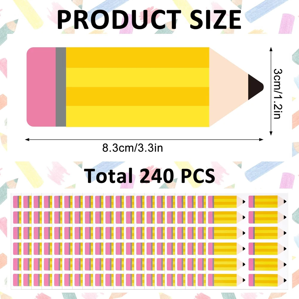 Features & Benefits: 240pcs name stickers, shaped in school pencil, vivid and delicate, great decoration for classroom bulletin board, blackboard, etc... Large enough and durable, can be embellished on the edge of blackboards, whiteboards, windows, turning a blank bulletin board into a beautiful place in the classroom. Specifications: Size: 8.3x3cm/3.3x1.2inch Color: colorful Material: coated paper Package includes: 240 x Name Tag Stickers A Set Includes - You will receive 20 sheets of pencils name label stickers, each sheet has 12pcs, totally 240pcs, sufficient to meet your different needs. Proper Size - Each piece of the name stickers is about 8.3x3cm/3.3x1.2inch, leaving enough space for writing student's names, numbers and other information, very useful. Premium Material - Made of good quality coated paper material, easy to write names, sequences, numbers, suitable for sticking on notebooks, diaries, school bags, school uniforms. Easy to Use - Peel off the cute pencil name tags stickers directly, then you can easily stick them to wherever you want. Self-adhesive stickers are ideal on paper, table, plastic bags and most other surfaces, a nice choice to decorate classroom and so on. Classroom Decoration - Suitable for decorating bulletin board, blackboard, phone board, guestbook, children's craft supplies, can be embellished on the edge of blackboards, whiteboards, windows, turning a blank bulletin board into a beautiful place in the classroom.