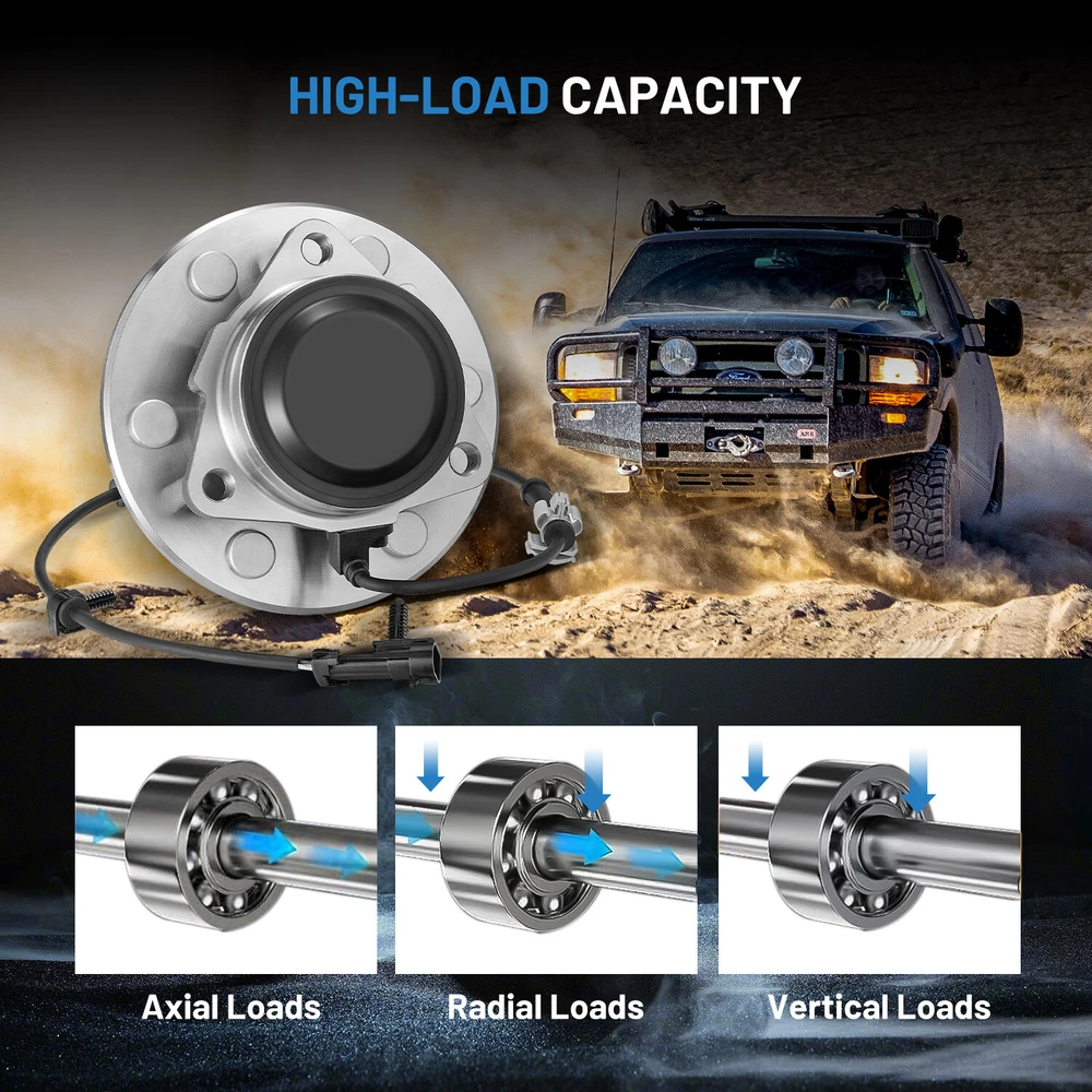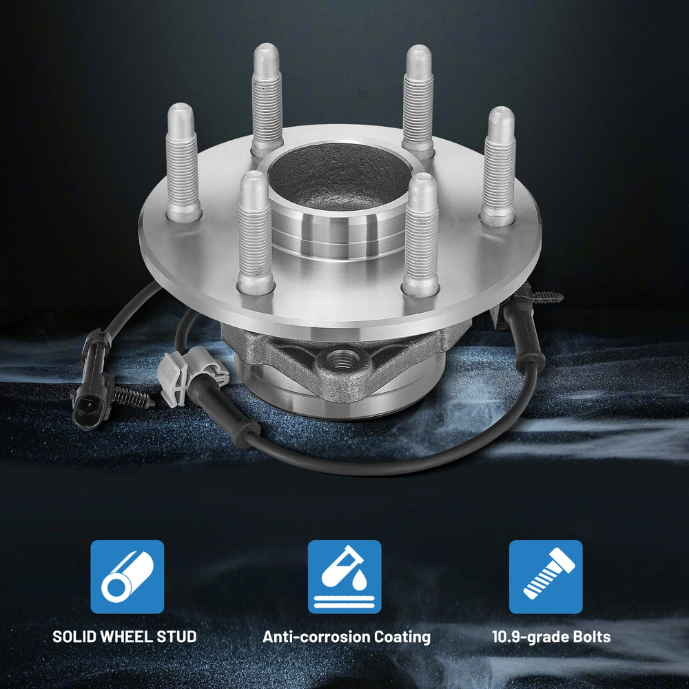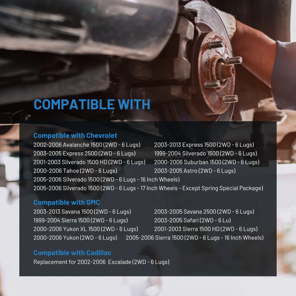 Specifications: Position: Front; Lugs: 6 Bolt; ABS Type: Sensor Wire; Flange Type: 3-Bolt Triangular OEM Part Number:515054 Fitment: Replacement for 2002-2006 Cadillac Escalade (2WD - 6 Lugs) Replacement for 2002-2006 Chevrolet Avalanche 1500 (2WD - 6 Lugs) Replacement for 2003-2013 Chevrolet Express 1500 (2WD - 6 Lugs) Replacement for 2003-2005 Chevrolet Express 2500 (2WD - 6 Lugs) Replacement for 1999-2004 Chevrolet Silverado 1500 (2WD - 6 Lugs) Replacement for 2005-2006 Chevrolet Silverado 1500 (2WD - 6 Lugs - 16 Inch Wheels) Replacement for 2005-2006 Chevrolet Silverado 1500 (2WD - 6 Lugs - 17 Inch Wheels - Except Spring Special Package) Replacement for 2001-2003 Chevrolet Silverado 1500 HD (2WD - 6 Lugs) Replacement for 2000-2006 Chevrolet Suburban 1500 (2WD - 6 Lugs) Replacement for 2000-2006 Chevrolet Tahoe (2WD - 6 Lugs) Replacement for 2003-2005 Chevrolet Astro (2WD - 6 Lugs) Replacement for 2003-2013 GMC Savana 1500 (2WD - 6 Lugs) Replacement for 2003-2005 GMC Savana 2500 (2WD - 6 Lugs) Replacement for 1999-2004 GMC Sierra 1500 (2WD - 6 Lugs) Replacement for 2005-2006 GMC Sierra 1500 (2WD - 6 Lugs - 16 Inch Wheels) Replacement for 2005-2006 GMC Sierra 1500 (2WD - 6 Lugs - 17 Inch Wheels - Except Spring Special Package) Replacement for 2001-2003 GMC Sierra 1500 HD (2WD - 6 Lugs) Replacement for 2000-2006 GMC Yukon (2WD - 6 Lugs) Replacement for 2000-2006 GMC Yukon XL 1500 (2WD - 6 Lugs) Replacement for 2003-2005 GMC Safari (2WD - 6 Lugs) Package Includes: 1 x Front Wheel Bearing and Hubs Assembly - 515054