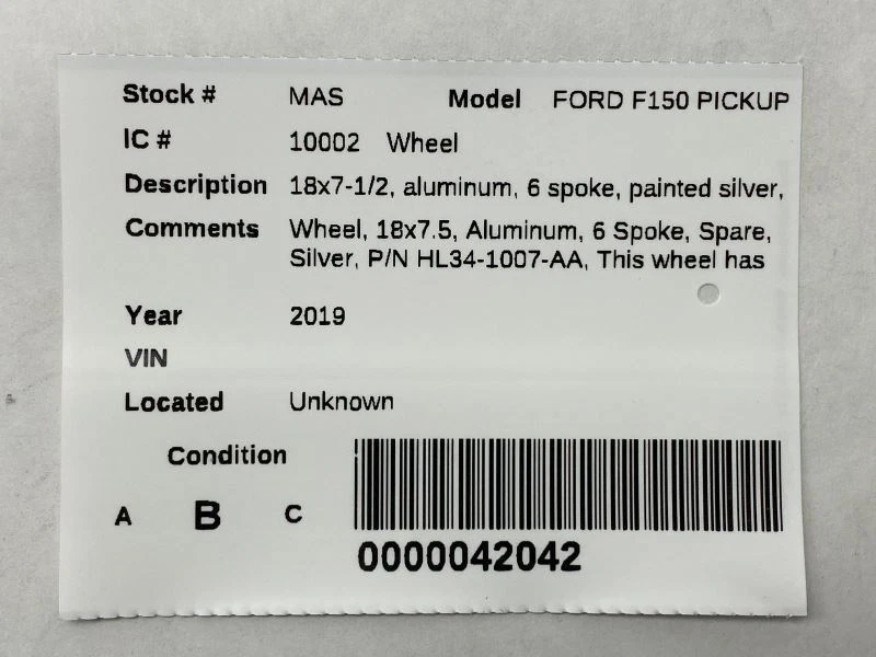 Hollander Welcome to our eBay store! Wheel Rim 18x7.5 Aluminum 6 Spoke Spare Silver Fits 2015-2020 Ford F150 83873 Description This listing is for a used Wheel. The part pictured is the actual item you will receive, no other parts are included. This wheel has some scratches and the paint is chipped. Please see part fitment information below and please match part numbers before buying this item. If you have any questions please let us know. Donor Vehicle Model : F150 Year : 2019 Mileage : 0 (0 = not available or unknown) Stock Number : MAS Notes : WHEEL, 18X7.5, ALUMINUM, 6 SPOKE, SP 12125 This Part Will Fit These Makes And Models With These Options FORD F150 PICKUP 15-20 18x7-1/2, aluminum, 6 spoke, painted silver, spare, (ID FL34-1007-PA) About Us Payment Shipping Returns Warranty About Us Please contact us with any questions BEFORE purchasing. If you are unsure if this part will fit we are happy to verify fitment for you prior to purchase via your vehicle's VIN (Vehicle Identification Number). We try to answer all messages in 24 hours. Please note that orders are sent to the shipping department throughout the day therefore we cannot guarantee adjustments to orders after payment is received. Our hours of operation are: Monday - Friday 8:00AM - 5:00 PM CST Saturday - Sunday Closed Payment All orders must be paid in full prior to shipment. Payments are processed through eBay. We accept credit card and cash for Local Pickup orders. If payment is not received, an Unpaid Item case will be opened for the sake of seller fee reimbursement. Sales tax will be collected by eBay where applicable. Shipping We ship items via UPS, USPS, or LTL Freight Carriers. Tracking information is uploaded to the order once the item is shipped. Larger items such as Engines, Transmissions, Doors, Tailgates, Trunk Lids, Rear Axles etc. will ship via freight. Freight items are unable to be shipped until we have all the necessary information required by the carrier. Typically that includes a valid business name, address, valid phone number, and hours of operation. Be sure to provide us with all necessary contact information with your order as well. Freight charges are for zoned commercial addresses with a forklift or loading dock. If the location requires the assistance of a lift gate there will be an additonal fee. If a commercial address is not able to be provided we can ship the item to your residence for an additional fee. Add $100 for Residential delivery Add $85 for Liftgate delivery Most orders are shipped within one business day. If there is an issue with your order or item we will reach out to you before we ship the order. Once payment is received for a freight item we will send a message asking for additional information needed for the freight carrier. Without this information we will not be able to ship your item. If a USPS or UPS item is damaged during shipping please keep all packaging and loose parts complete with the package. Send us a message through Ebay with some pictures and your invoice number. We will work on getting a replacement item to you while handling the UPS claim as well. Please Inspect all freight shipments before signing for them at time of delivery! If there has been any damage to the item during shipping inspect the item to see if you can still use it or not. If you can still use the item, notate the damage on the delivery ticket that the driver is keeping then hand it back to them. Send us a message with a copy of your receipt and the delivery ticket you kept. We will take care of the damage claim with the freight carrier. If you cannot use the product simply decline the shipment send us a message and we will work on getting a replacement or refund to you. It is very important to not sign for any damaged product without notating it on the delivery ticket or denying the shipment. You have the right to inspect the package for obvious signs of damage prior to signing and accepting the delivery. If a delivery driver is refusing to let you inspect the shipment before you sign for it, do not sign, refuse the shipment and contact us through eBay messaging. When you sign for the delivery on the carrier's Bill Of Lading (BOL) it is accepting the merchandise as is and in good order. So please inspect your package before signing for it. We do understand that sometimes there will be damage that is missed, don’t worry we will still be able to help you. If you do find concealed damage after you sign for the package let us know through messages and send some pictures as well. We will get with the freight company and start a claim. We are not responsible for any delays incurred by the shipping company. No International shipping is available outside of the eBay Global Shipping program. We do not ship to PO Boxes, Hawaii, Alaska, Puerto Rico, APO, FPO, AA, AE, AP and U.S. Territories outside of the continental U.S. International orders are shipped via eBay’s Global Shipping Program. Customer pickup at our location is also available. Please contact us prior to your purchase to arrange pick up. Returns If you need to return an item for any reason please contact us first to obtain a RMA number (Return Material Authorization). All returns must be authorized by us before being shipped back. Any items returned must include an RMA number clearly written on the side of the packaging. If you are returning a part because you bought the wrong one or no longer need it the original shipping charges are not refunded and you are responsible for the return shipping. All returns must be made within 30 days of the date of purchase. All parts must be returned in their original condition to receive full credit Once you obtain an RMA number, ship the item back to: Frontier Auto Parts, 2199 Ranger Hwy, Weatherford, TX 76088 Warranty All parts we sell through eBay Motors come with a 30-day warranty and a 30 day return period unless otherwise stated. No labor warranty is provided. In the event a part sold with a warranty 
