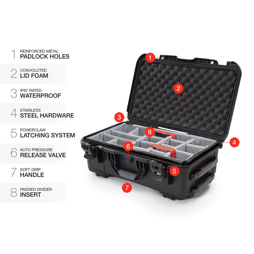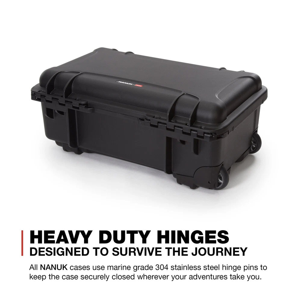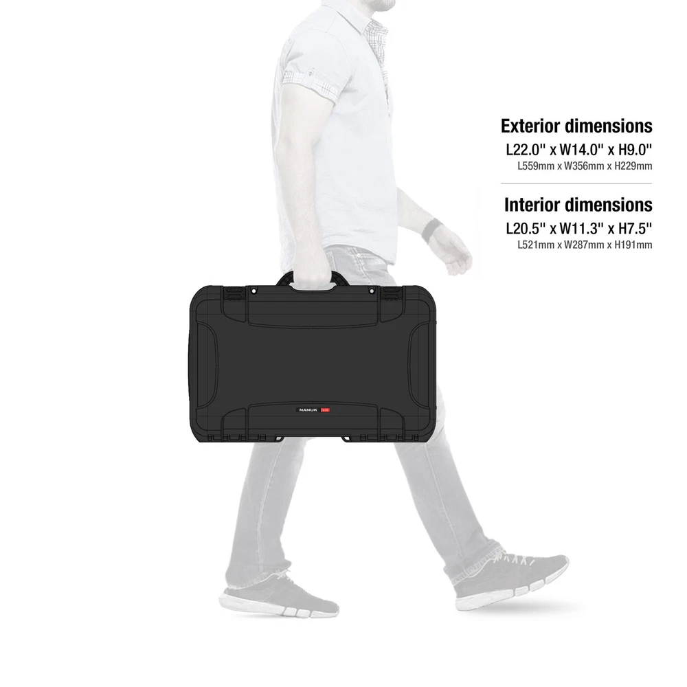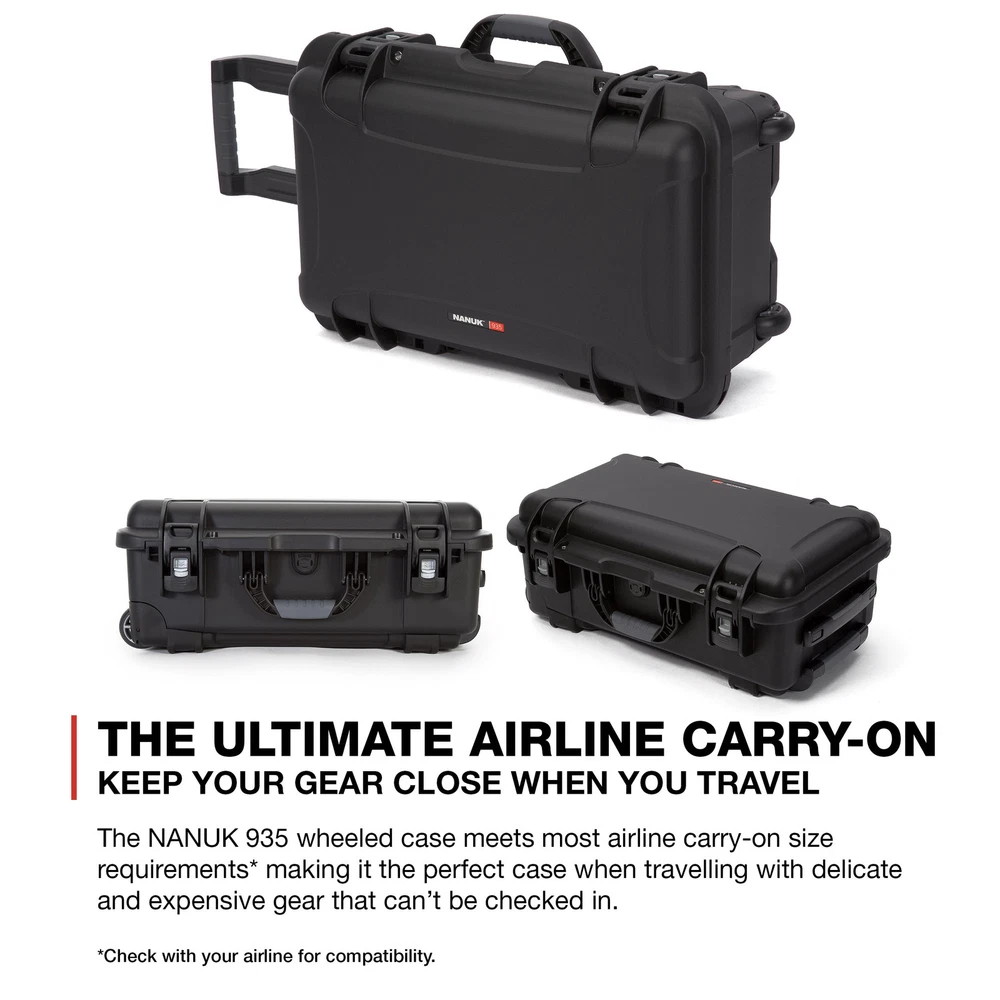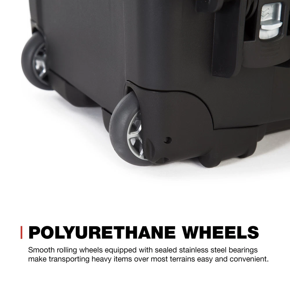 stainless steel hardware High performance gasket Automatic pressure release valve Molded-in bezel system Integrated lid stay Stackable Meets airline carry-on regulations Exterior Dimensions - 22.0" x 14.0" x 9.0" Interior Dimensions - 20.5" x 11.3" x 7.5" 935: Three soft-grip handles make this wheeled case one of the most convenient on the market, but that’s only the beginning. Polyurethane wheels withstand rough terrain while the one-handed retractable handle makes it easy to use and versatile. No matter where you’re headed, you’re guaranteed a smooth and hassle-free trip