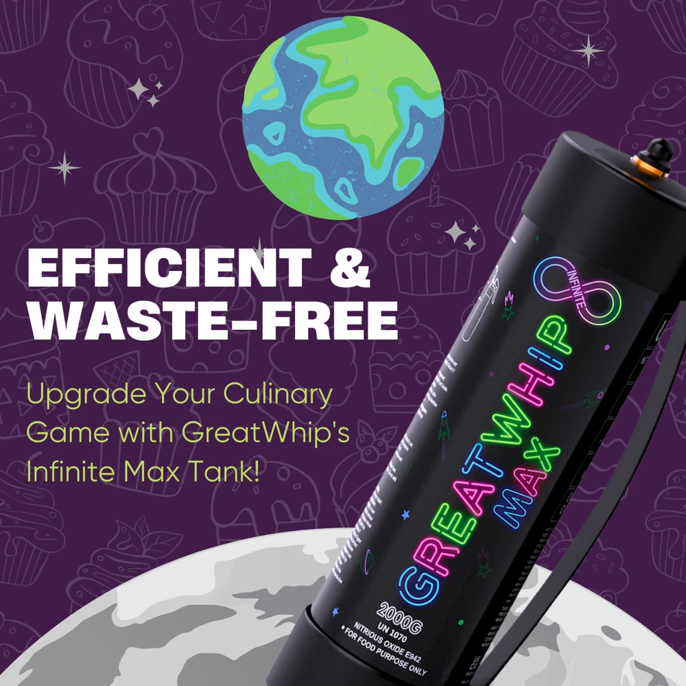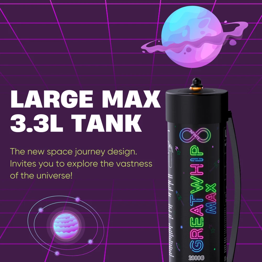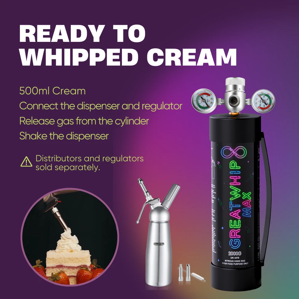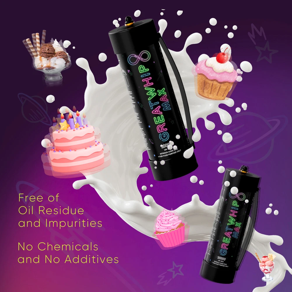 GreatWhip The Most Recommended Seller / Advance Cleaning Tech / Reliable Supplier Whipped Cream Charger MAX 3.3L CANISTER 2 Tanks in 1 Case Net Weight: 2000G / Tank 1 Free Plastic Nozzle per Tank Included * Fresh & Pure * * Larger Capacity * * More Convenient to Carry * * Recommended for Restaurants, Bars, Cake shops, and Parties * FAST & FREE SHIPPING Discreet Packaging ★★★ FEATURES ★★★ ✔ SAVE MONEY AND TIME With the large capacity, it is more efficient for you to make delicious cream desserts, cupcakes, etc i n busy times. It will be the perfect helper in your kitchen business, and save you money and time! ✔ FOOD-GRADE & LONG SHELF LIFE GreatWhip whipped cream chargers are made with food-grade compliance, and production standards: ISO/CE/GB/DOT. Each cream charger has a long shelf life of 5 years so you can use them over a period of time. ✔ LEAKAGE DESIGN The cream charger has a treated closed structure that ensures gas will not leak in the shelf period of the cartridges and make you create more cream. ✔ SHOW YOUR CULINARY TALENT Each cream whipper is filled with the purest, highest quality N2*. That is why you will not have a hard time making chocolate or vanilla, mint, or Bailey's flavored cream whipper. Cocktail foams, airy sauce, mousse, and hot or cold foam can be made easily, too. ✔ UNIVERSAL COMPATIBILITY Compatible with all professional whipped cream makers including iSi, Whip it, Liss, and Kayser. From now on, you can easily finish the whipping cream making in a few seconds and without leaving odors or contaminants in the dispenser. ★★★ Friendly Reminder ★★★ 1. You will have to use the 3.3L charger with a pressure reducing valve. 2. The 3.3L product is suitable for experienced cream chefs. If you are the first time making whipped cream with N2* chargers, we strongly suggest you purchase the 8G chargers instead. Otherwise, you may fail to make whipped cream, if you can not release the gas accurately. This product is only intended for catering services and sale to adults over 18 years old. By placing an order, the buyer represents that, he or she is at least 18 years old; the product(s) will only be used in accordance with the manufacturer's instructions. GreatWhip assumes no liability associated with product usage. The buyer is liable and responsible for any loss, damage, or expenses of any kind, arising out of the use or misuse of any item. Contact us for a better price for bulk savings. What is GreatWhip SHIPPING Payments Excellent Customer Service Contact us What is GreatWhip GreatWhip is the home of premium gas including N20 , CO2 , Helium , N2 , Argon , Oxygen , etc at the very best prices, and ranges within the USA, AU and DE markets. We own and produce the highest products in our ultra-modern manufacturing facility, sold to CAN, USA, Europe, Asia, and Australia. We hold large stocks all year. We can offer you the highest quality products, at the lowest possible prices! Please feel free to contact us if you want to purchase stock in large volumes. We pride ourselves on providing the best quality customer service in wholesale pallet orders. We hope you enjoy your shopping experience with us. SHIPPING The item(s) you order will be delivered to the address you give when you place your order. Note this cannot be changed. Warehouse INFO: PA, FL, CA We usually shipped from the warehouse which is closest and fastest to you. We will endeavor to dispatch on the same day, depending on our delivery agent. Every effort will be made to deliver the goods as soon. Payments Please make payment within 24 hours, and ensure your telephone contact number is up-to-date as our Courier may call you before making the delivery. - PayPal payment accepted / eBay managed payments. Excellent Customer Service GreatWhip customer service team works hard to make sure you have a good shopping experience with us. Our customer service team also helps and answers all your questions about the product within 24 hours. Contact us Click Here to contact us via eBay.