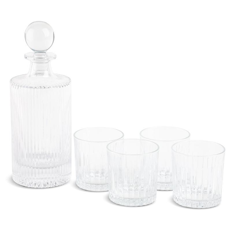 Thyme & Table Whiskey Decanter Set, 5-Piece is a part of Thyme & Table's Specialty Barware Collection. This whiskey decanter set is ideal for the at-home bar enthusiast. The decanter has an airtight seal to preserve freshness. The decanter capacity is 27 ounces and the whiskey glasses hold 10 ounces. The set includes one decanter and four whiskey glasses. For care and use, please hand wash in warm water with light dish soap and a soft sponge. Avoid abrasive cleaners. Towel dry. Do not use in a dishwasher 5-Piece set, includes decanter and 4 whiskey glasses Perfect for home bars Hand wash recommended Decanter holds 27 ounces Glasses hold 10 ounces
