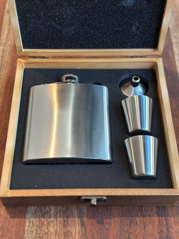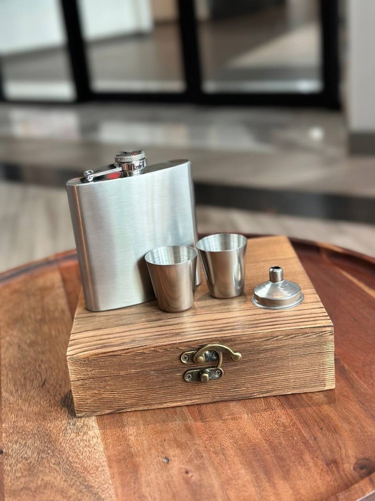 π Product Description: Elegant Metal Flask Gift Set with Wooden Box β Perfect for Whiskey Lovers & Groomsmen! Celebrate in style with this classic 6oz metal flask set, beautifully presented in a rustic wooden gift box. Ideal for best man gifts, groomsmen, birthdays, or any whiskey lover in your life. π Measurements: Wooden Box: 7.5" (L) x 6.75" (W) x 1.75" (H) Flask: 3.75" (L) x 0.81" (W) x 4.25" (H) β holds 6oz Shot Glasses: Each holds 1oz (30ml) β¨ Features: Durable stainless steel flask Two 1oz shot glasses included Handsome keepsake wooden box Makes a perfect wedding or groomsmen gift Personalization available β message us to customize! π Give the gift of great taste βwhether it's for a celebration or just because. This stylish, compact set is a timeless favorite for whiskey fans and party hosts alike!