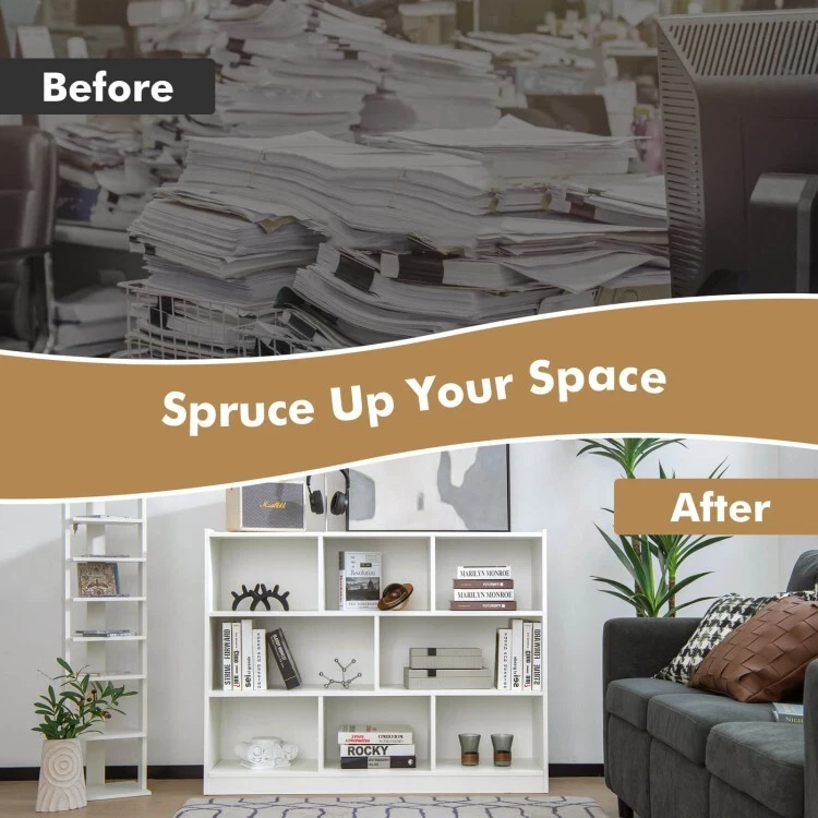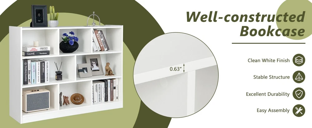 3-Tier Open Shelf Wooden Bookcase 8-Cube Freestanding Storage Toys Shelves White ● Large Storage Capacity: The freestanding 3-tier bookcase boasts a wide cabinet top and 8 cubes, offering ample storage space to organize your books, ornaments, photos, potted plants, baskets and more. In addition, the open design ensures that everything is within reach. ● High Sturdiness and Stability: Made of thickened board with sturdy screw connection, the wooden bookcase is built to last. To cast a firmly constructed bookcase, there is also back reinforced design to enhance support and 2 anti-toppling kits for higher stability and safety. ● More Well-made Details: Raised edge on top prevents your items from falling off. Elevated base will keep the books on the shelf away from floor water. Plus, the non-slip foot pads at bottom not only add overall stability but also protect the floor from scratches. ● Modern Style, Wide Use: Featuring clean lines and contemporary style, the 3-tier bookcase will be a gorgeous addition to various occasions, like living room, kid's room, bedroom, study and more. Apart from being used as a bookcase, it also works great as a toy storage organizer. ● Easy to Assemble and Clean: By simply following our detailed illustrated instructions, you can quickly assemble this bookcase. At the same time, the easy-to-clean surface allows you to easily wipe the stains or dirt off with a wet cloth, which makes daily cleaning a breeze. Color: White Material: Engineered wood, MDF Overall dimension: 48" x 12.5" x 36.5"(L x W x H) Dimension of large cube: 23" x 12" x 10.5"(L x W x H) Dimension of small cube: 15" x 12" x 10.5"(L x W x H) Net weight: 72.5 lbs Weight capacity of top: 132 lbs Weight capacity of each cube: 44 lbs