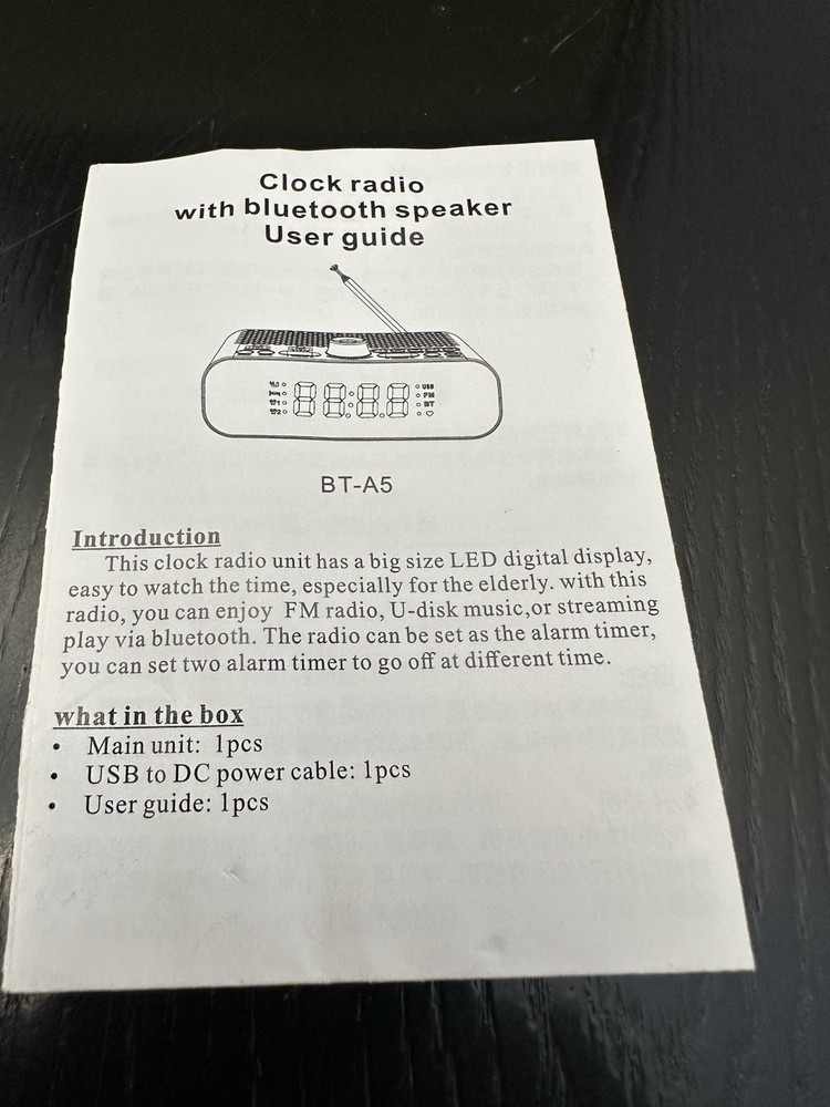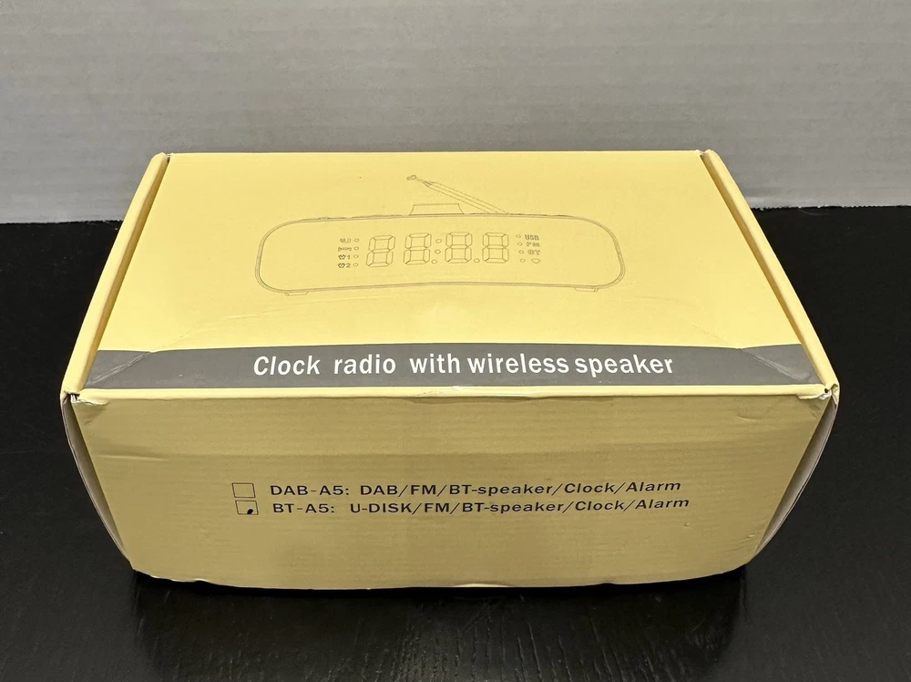 Type:Clock RadioDisplay Type:DigitalCountry/Region of Manufacture:ChinaRoom:Bedroom, Home Office/StudyColor:WhiteFeatures:Alarm, Radio, DigitalStyle:ModernBrand:UnbrandedModel:BT-A5Shape:Rectangular