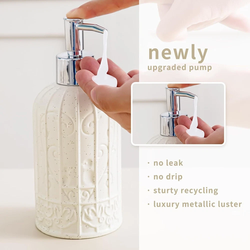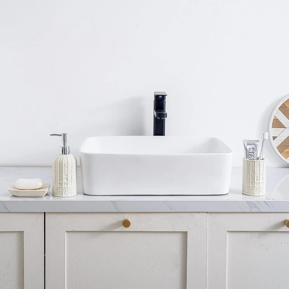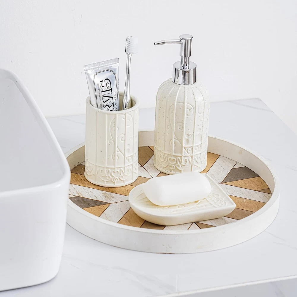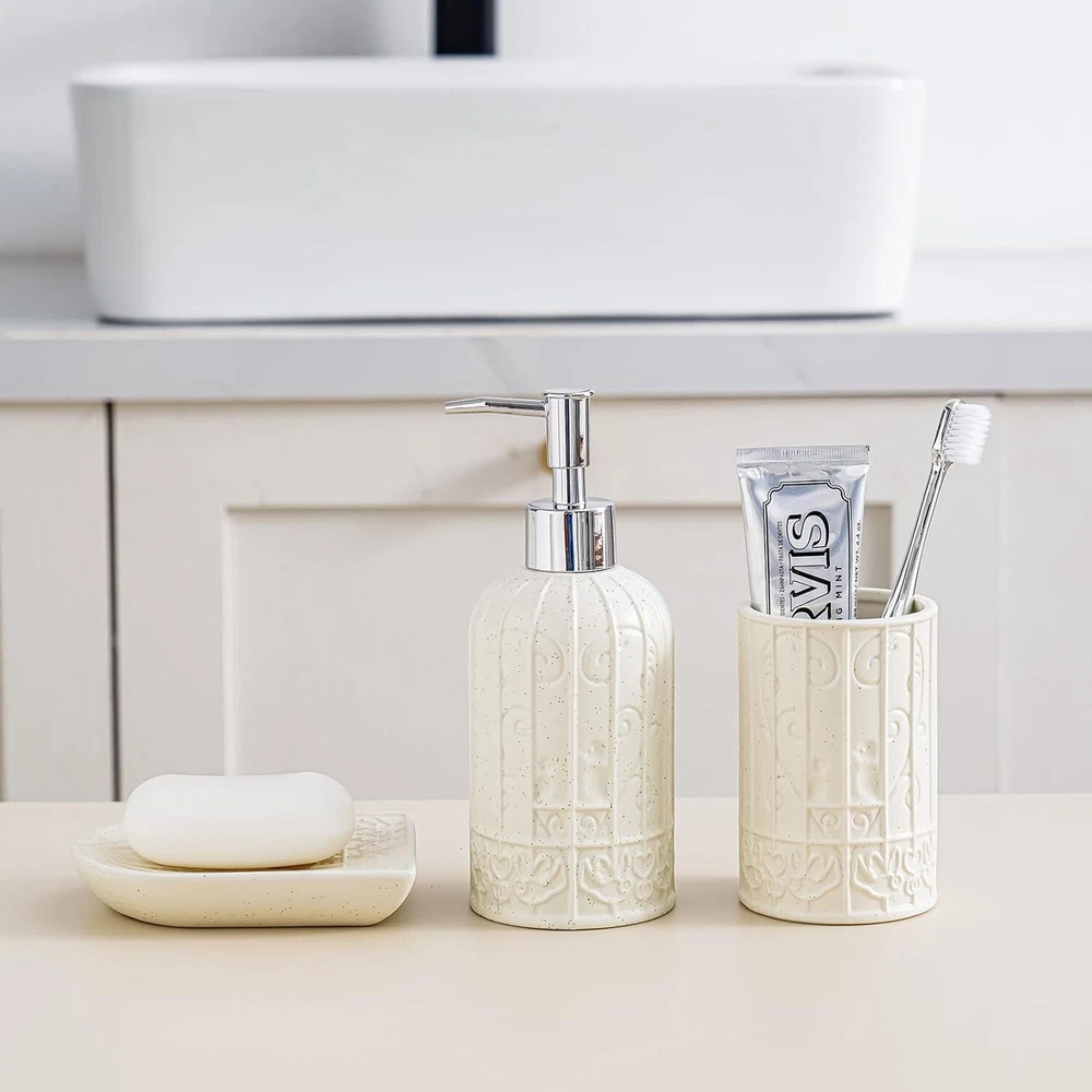 White Bathroom Accessories Set, Ceramic Set with Product Details Number of Pieces: 1 Finish Type: Polished Manufacturer: RZCNC Package Dimensions: 9.69 x 8.43 x 3.9 inches Item Weight: 1.85 pounds Item model number: 68220021 Fabric Type: Ceramic Finish types: Polished Batteries required: No Material: Ceramic Color: White Brand: RZCNC Style: Modern Included Components: Soap Dispenser, Toothbrush holder/Tumbler, Soap Dish Ceramic Elevate your bathroom decor with our Bathroom Accessories Set of 3, featuring a sleek Birdcage Design in a stylish White and Beige color scheme. Crafted from high-quality ceramic, this set includes a Soap Dispenser, Tumbler, and Soap Dish, offering a perfect blend of functionality and elegance. Organize your essentials in style with this bathroom accessories set, adding a touch of modern sophistication to any countertop or vanity. Perfectly complementing each other, the soap and toothbrush holder set is not only practical but also serves as a stunning focal point in your bathroom.