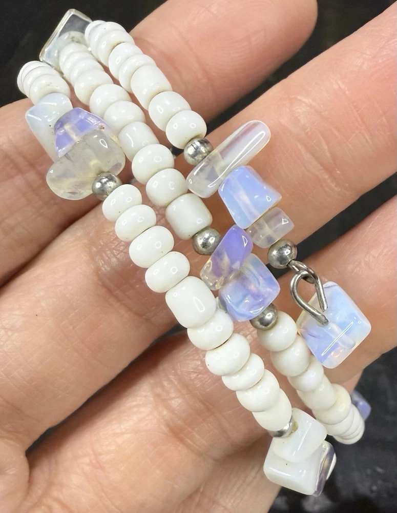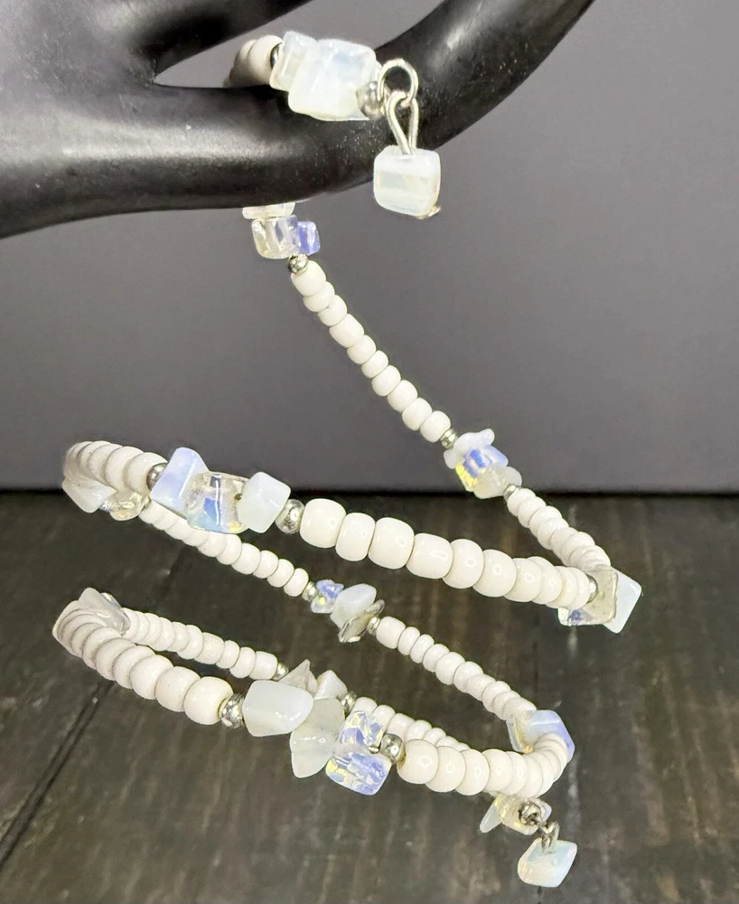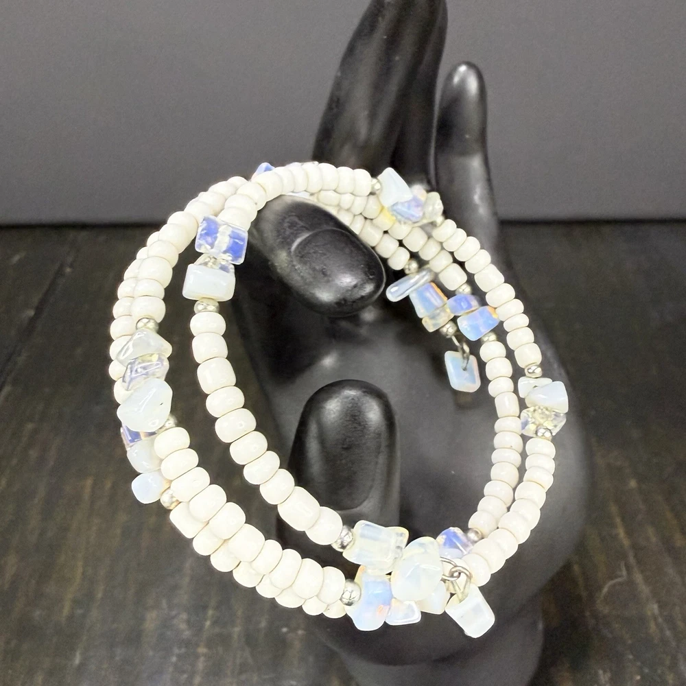 White Beaded Wrap Bracelet Stretch Memory Wire w/ Opalites Silver Tone Pre-owned. Very good condition. Photos are part of the description. If you purchase more than one fashion jewelry from my shop please message me so I can adjust the shipping fee. Thanks!