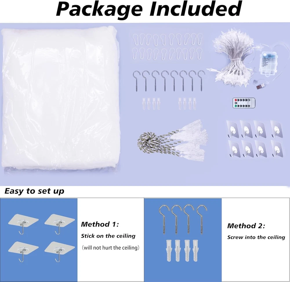 Polyester Bed Canopy with Star String Lights: Hanging the white canopy bed curtains with warm white star string lights in a girl's bedroom will create a warm and cozy atmosphere, promoting sweet sleep. Every bedroom can be transformed into a princess room 8 Lighting Modes: Combination, In waves, Sequential, Slo-glo, Chasing/flash, Slow fade, Twinkle/flash, Steady on. Canopy string lights can be controlled with remote. You can set up the time (6 hours on/18 hours off) and adjust the brightness of the lights USB/Battery Powered: Updated star string lights can be powered by USB or 3 AA batteries (Not Included), making it more convenient to use and light up the whole night easily. please note that only one of the power supply modes should be selected for use Ideal Gifts for Girls: This princess canopy comes in a gift package, which will surprise your girls. It also includes 100 shining stars accompany you to sleep, glowing in the dark at night Fits Most Size Beds: 82 x 79 x 98 inch, suitable for single, twin, full, king and queen size bed. Bed tent is great for dorm, outdoor camping, hammock, tree house or traveling in the tropics. It provides a comfortable and cool space to relax Easy to Install: It only takes minutes to hang the lighted bed canopy with the provided wall sticker or hook. Or hanging it on the corners of your four-post bed. 4 satin gold & silver braided rope ties with tassels are provided to tie up the four corners Material: The canopy curtains is made of 100% polyester, soft, lightweight and breathable. High-dense holes, yet allows a cool breeze in - for proper air circulation, natural protection and a peaceful night's sleep Product Description Obrecis bed canopy with LED warm white star string lights, which is the perfect decorations for princess bedroom! Specifications Color of canopy: Black/White Light color:Warm White Length:82 inch Width:79 inch Height: 98inch WARM PROMPT Ventilate the bed canopy outdoors for 24 hours before first time use. Package Included 1 X Bed Canopy 4 X Hanging Kit (Metal Hooks,anchors) 4 X Ropes 20 X Pins 1 X LED Star String Lights LED Star Lights 4 Tassels Ropes Gift Packaging