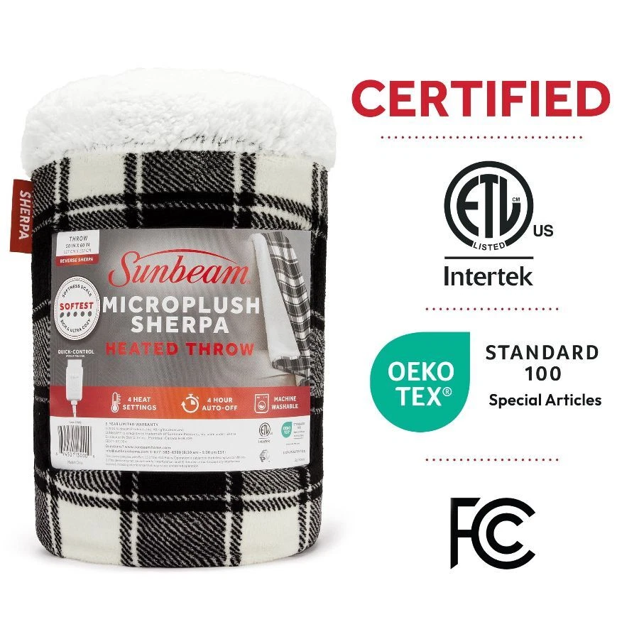 Sunbeam White & Black Buffalo Microplush Sherpa/Faux Shearling Heated Throw wraps you in luxurious warmth, perfect for those chilly cold nights. Imagine sinking into the rich and ultra-cozy microplush with reverse Sherpa/Faux Shearling fabric, keeping you toasty and comfortable while you relax. The stylish 50" x 60" electric blanket makes a great accessory while relaxing on the couch, bed or your favourite chair and the white & black buffalo plaid adds a stylish to any décor. This throw features an easy-to-use push-button controller with 4 adjustable heat settings, so you can find your perfect temperature. The 4-hour auto shut-off function ensures added peace of mind. Premium heated wires are equipped with advanced technology to ensure continuous even heat distribution. When it’s time to clean, simply detach the controller from the throw and place in the washing machine and dryer for easy care. It stays silky soft wash after wash. Sunbeam is an American brand trusted for over 125 years in electric home appliances. All Sunbeam electric bedding products are ETL certified. On Dec 26, 2024 at 18:53:42 PST, seller added the following information: