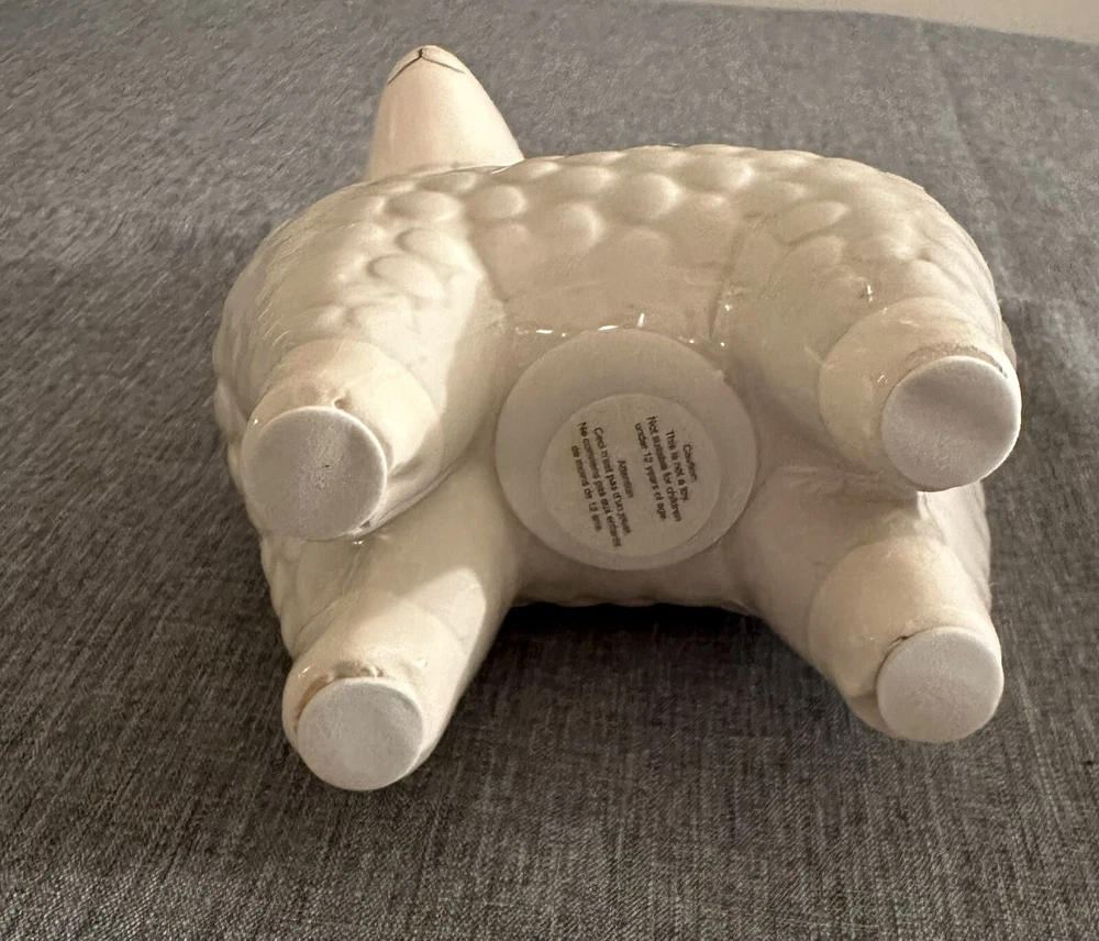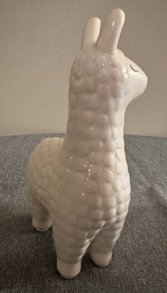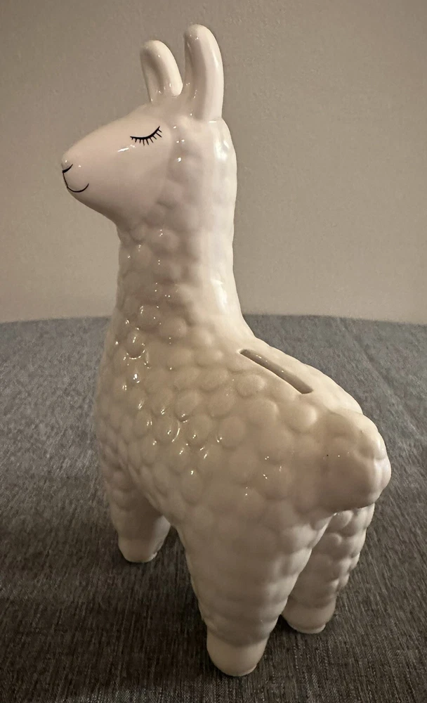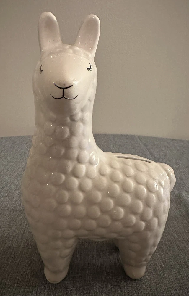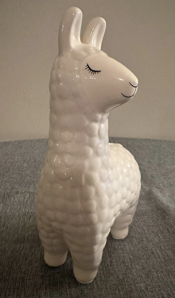 Add a touch of whimsy to your nursery or decorative room with this adorable white ceramic Llama Coin Bank. Measuring 8.6" in height, 5" in width, and 3" in depth, this bank is perfect for storing loose change or as a decorative piece. Made from high-quality ceramic, this bank is durable and will last for years to come. The charming design of this Llama Coin Bank is sure to bring a smile to your face and to your guests. Adult owned, used as decor only, excellent condition.