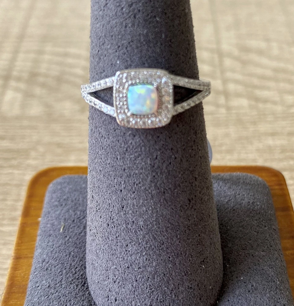 925 sterling silver ring , it features a square-shaped opal with inlaid cubic zirconia stones. The ring is hallmarked and comes in a elegant white colour. The ring is available in a size N All rings come in a gift bag