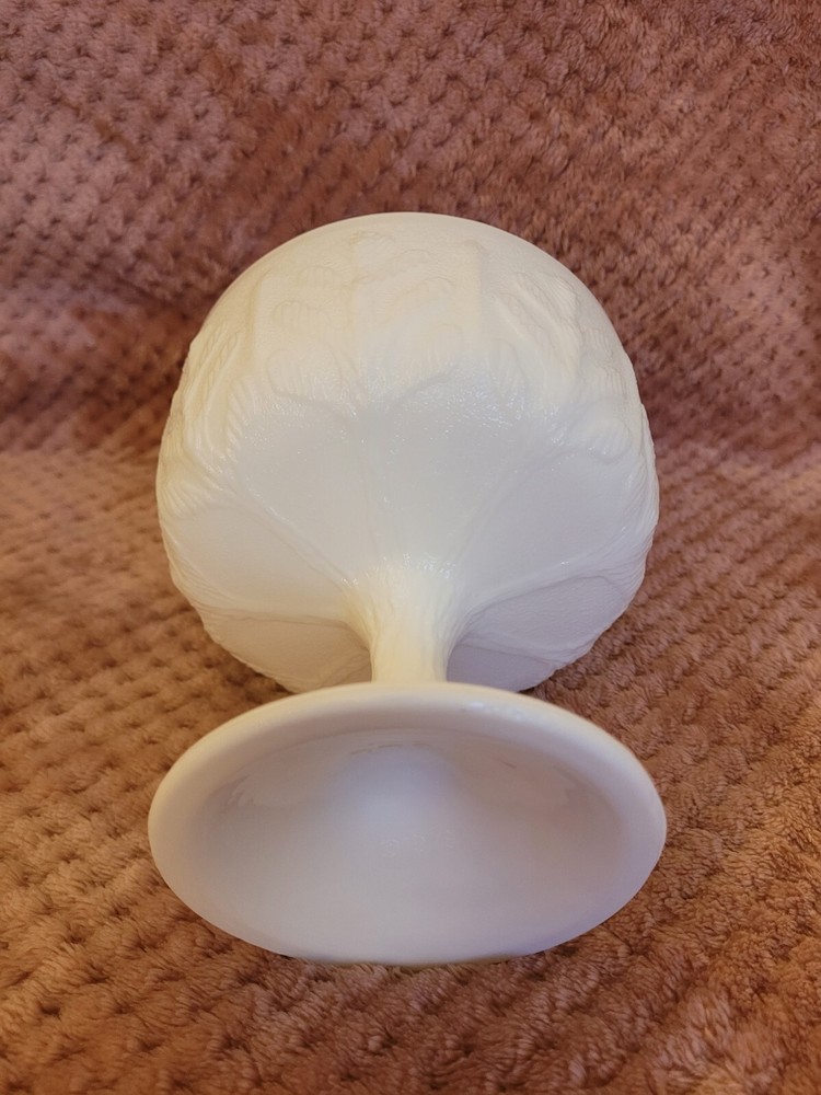 This vintage F.T.D. milk glass compote bowl features a classic white color with a leaf design, making it a charming addition to any table setting. The bowl is made of glass and has a pedestal base, measuring 5.5 inches in diameter and width. It is part of the Colony product line and is an original vintage piece, ideal for serving candy or displaying decorative items. Perfect for all occasions and is in perfect condition.