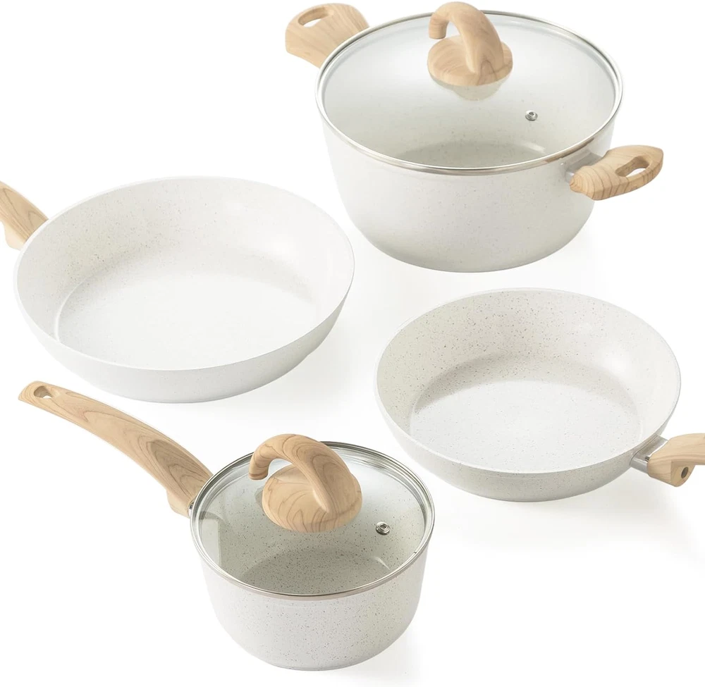 Store New Arrivals Add to Favorite View Feedback Contact White Pots and Pans Set Non Stick, Ceramic Cookware Set with Granite Pattern Kitchen Cooking Sets Induction Pot and Pan W/Frying Pans, Saucepans, Casserole, Non-Toxic, Ptfe/Pfoa/Pfos-Free Description Closure Material Glass Color White Material Ceramic Material Type Ceramic Volume 3E+1 Quarts Is Oven Safe Yes Handle Material Bakelite Size 6 pcs white Material Type Free PFAS Free, PFOA PTFE Free Is the item dishwasher safe? No Compatibility Options oven, electric stove, gas dishwasher, induction Included Components 9.5' frying pan, 11' 1.5-quart sauce pan with Lid, 5-quart stockpot Lid Enjoy a tasty and safe cooking experience with the Vkoocy Series Set! This 6-piece cookware set includes a 9.5" frying pan, 11" frying pan, 1.5-quart sauce pan with Lid, 5-quart stockpot with Lid. Made with non-toxic ceramic and free of harmful chemicals, this set contains all the tools you need to fry, sear, roast, and simmer your favorite dishes without worry. Plus, It's also specially decorated with patterns to make your kitchen blend with nature; Healthier & Safe Cooking: The set features a ceramic nonstick coating made without PFAS, PFOA, PFOS & PTFE that allows for effortless food release and an even easier clean up. High magnetic conductive stainless steel base allows our non stick kitchen cookware to work on all cooktops, like Electric, Halogen, Ceramic, Gas, Induction, Glass and Oven. The Extended and Thicken Bottom Design also makes the cookware durable and heats up quickly and evenly; Easy To Clean: Rivetless interior to prevent snags and food buildup. Just wipe it with a paper towel or rinse it with water, The pot body is also suitable for dishwashers (recommended without handle cleaning); Your dinner table serveware centerpiece. Modern, glossy, strong and an excellent heat retainer, our ceramic cookware is made to be involved in every part of the meal from prepping to laughing around the breakfast, lunch and dinner table; By our family for your health. At Vkoocy, our products are our integrity. That's our promise to you – we'll make decisions with your family and your health in mind as we would our own. If you encounter any problems, please feel free to and we will solve them perfectly for you. Product Description Enjoy a tasty and safe cooking experience with the Vkoocy Ceramic Cookware Set! Handcrafted with non-toxic pure ceramic and free of harmful chemicals, this set contains all the tools you need to fry, sear, roast, and simmer your favorite dishes without worry. Plus, it's sustainably made—perfect for cooking up a storm with peace of mind. Your kitchen's best buddy - Vkoocy Nonstick Ceramic Pots and Pans Set The video showcases the product in use. The video guides you through product setup. The video compares multiple products. The video shows the product being unpacked. While both ceramic and granite cookware are excellent choices, ceramic's balanced benefits of superior performance, health profile and longevity cement it as the ultimate non-stick kitchen solution. True non-stick cookware set, safe, healthy, and easy to clean. Don't hesitate anymore, take me home YOUR DINNER TABLE SERVEWARE CENTERPIECE Modern, glossy, strong and an excellent heat retainer, our ceramic cookware is made to be involved in every part of the meal from prepping to laughing around the breakfast, lunch and dinner table. Specification Color Black, White, Gray, Pink, (with Granite pattern) Material Die-Cast Aluminum, Ceramic Contains 9.5" & 11" frying pan, 1.5QT sauce pan with cover, 5QT stockpot with Lid(also fits 9.5" frying pan) Handle Material Bakelite Closure Material Glass Material Type Free PFOA FREE, PTFE FREE Granite cookware vs Ceramic cookware Granite coating is very slick, while ceramic's glass-like finish also prevents sticking. However, ceramic tends to retain and distribute heat more evenly than comparable granite pans due to ceramic's superior insulating properties. Is ceramic better than granite? Yes, Ceramic is better than Granite (Non Stick) , ceramic coatings are more expensive but safer and are the first choice of most health-conscious people. Is Vkoocy PTFE free? PPG Fusion Pro is Vkoocy's ceramic nonstick coating, and is PFAS- and plastic-free. You won't find PTFE, PFOA, lead or cadmium in our coating either. Is ceramic cookware non-toxic? Yes, ceramic pans are naturally nonstick and generally produced without PTFE, PFAS, and PFOAs. Quality ceramic pans will last a few years with proper care, and will only need to be replaced if the nonstick coating wears out. Will PTFE be banned in America? The European Commission (EC) is proposing that all PFAS be banned because it says they are persistent, can be toxic, and can bioaccumulate in organisms; Relevant bills have also been introduced in the US, and banning PTFE is the general trend Star products by Vkoocy Add to Cart Add to Cart Add to Cart Customer Reviews 4.5 out of 5 stars 1,743 4.5 out of 5 stars 243 4.7 out of 5 stars 92 4.5 out of 5 stars 1,743 4.5 out of 5 stars 243 4.5 out of 5 stars 316 4.8 out of 5 stars 18 Price $55.47 $ 55 . 47 $55.99 $ 55 . 99 $79.99 $ 79 . 99 $31.99 $ 31 . 99 $42.99 $ 42 . 99 $34.39 $ 34 . 39 $31.99 $ 31 . 99 Material: Ceramic Ceramic Ceramic Ceramic Ceramic Ceramic Ceramic Pattern: Granite Dot Solid / Granite Dot Granite Dot Granite Dot Solid / Granite Dot Granite Dot Solid / Granite Dot Include: 6pcs 9pcs 12pcs 3pcs 5pcs 3pcs 2pcs Lid Include: ✔ ✔ ✔ ✔ ✔ ✘ ✔ Color: Black, Pink, White Pink, Gray, Cream, Green Tan Beige Pink, Gray, Cream, Green Black, White Pink, Gray, Cream ABOUT US We offer the best prices around on high quality products. Our E-store includes media such as books, movies, music and games while offering electronics, toys, sporting apparel, clothing, tools, general home, garden items and more. SHIPPING We are always working hard to ensure your package arrives as soon as possible. Please understand that some factors like weat