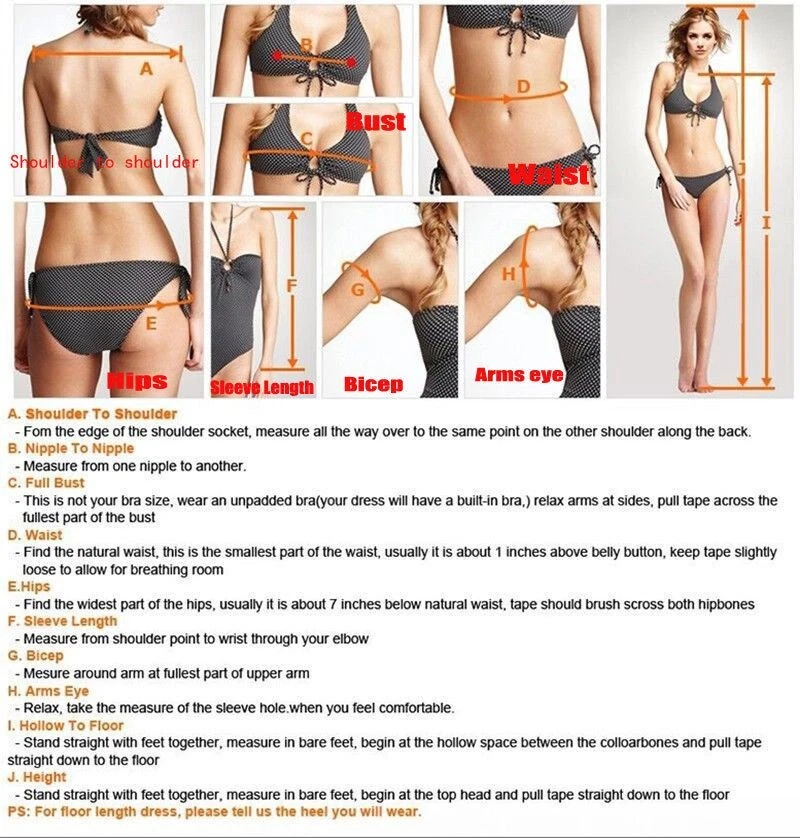 Welcome to my eBay store Measuring Instructions this dress is custom made according to your measurements. Here is the info we need, please complete them and send it to me,thank you :) 1.Dress color =___(as picture or Color Chart) 2.Dress back:zipper or lace-up or Button ? 3.Full Bust=___ 4.Waist =____ 5.Hips= ____ 6.Shoulder to Shoulder= ____ 7.Shoulder to waist = ____ 8.Waist to floor (without shoes) =____ 9.Shoulder to floor (without shoes)____ 10.Height =_____ 11.Height of Heels _____ 12.Bicep =__ 13.Arms eye= ___ 14.Arm Length =___ 15.Your Contact Telephone Number: ___ 16.You need dress at the latest delivery date ______ How to measure Color Chart Note: A: The item we list include the jacket,pants. Not include the shirts. B: Since computer screens have chromatic aberration, especially between CRT screen and LCD screen, we can not guarantee that the color of our products will be exactly the same with the photographs you saw. C: Before ordering, please read this listing carefully and ask all your questions. To send an email, please click on the link, "Ask seller a question" at the top right hand corner of this listing. We will answer your questions within 24-48 hours. If you do not receive a reply please resend your email. D: Import duties, taxes and charges are not included in the item price or shipping charges. These charges are the buyer?s responsibility. We accept Paypal or any credit card or bank card. If you want to pay by any other way, please mail to me before you bid. Shipping 1.We can ship items to worldwide. 2.We usually sent items via EMS,Aramex,Worldwide (5-12 days)! If you need the item very urgent ,please choose the expedite shipping way. Such as DHL or UPS,and you will need to pay some extra cost. 3.We can not ship orders to alternate addresses.We may only ship items to the primary address on file for your Paypal account for Buyer-Seller Paypal Protection. Return Policy 1. Before delivery the item ?we must check the size and confirm item perfect. when you receive the item , if you find any question ?please contact us within you receive the item 48 hours. 2.We appreciate your patience & understanding. If you not satisfy the dress or service. Please contact us before you leave neutral or negative feedback. We are very glad to solve all problems. 3. If the dress not fit you, you can sent the item back within 14 days , we can refund your dress cost (not include postage) , or exchange item from us ,we can free make for you again. Feedback Y our 100% satisfaction is our goal. Your Feedback and seller details rating is very important for us, If you plan to leave Negative feedback / neutral feedback or low DSR, please kindly contact us first about your any questions in transaction, we will try our best to help and solve your problems. A.We do our best to make your online purchase as pleasant as possible, if you have any concerns please do not hesitate to contact us as we truly want every customer to be a satisfied customer! B.It would be highly appreciated if you could leave us a positive feedback, which will be a great encouragement for us!! C.We know the dress for your Special Day! We will do our the best to make you the best dress and provide you the best service. If you have any questions please feel free to contact us, due to different time zone we will reply your questions within 12 hours.Thanks for your understanding. Contact us Our work time: AM 8:00 to PM 6:00 (Chinese time) If is not in this scope, you can leave a message, I will reply you in 12 hours.please feel free to contact us. :)
