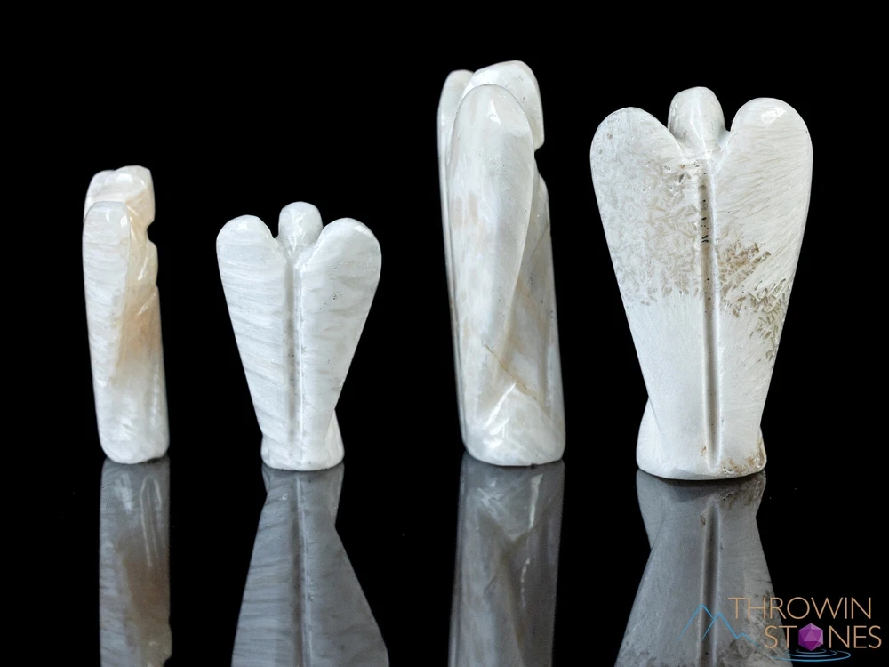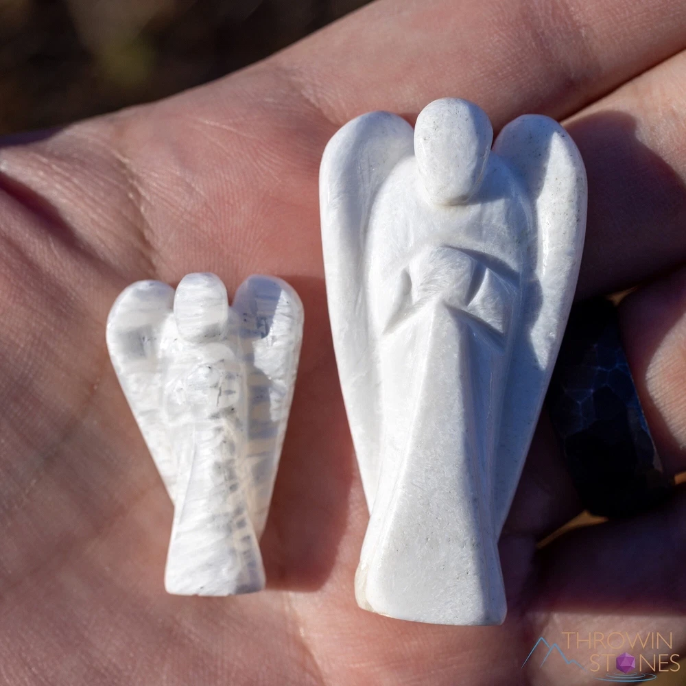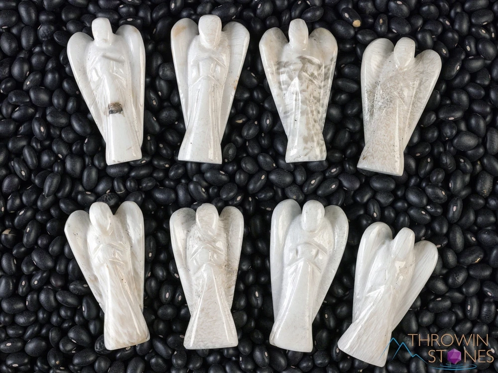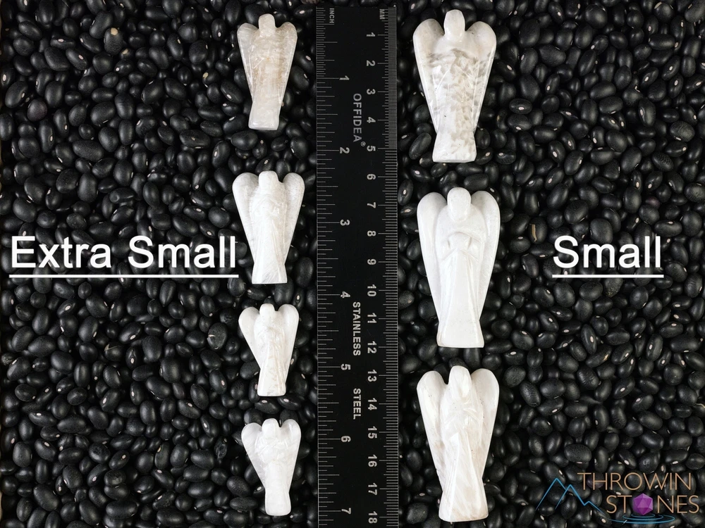 White SCOLECITE Crystal Angel - Healing Guardian Angel Figurines, Decor, E2078 Approximate Height: Extra Small: 1 - 1.5 inches (25 - 39 mm) Small: 1.6 - 2.4 inches (40 - 62 mm) Medium: 2.5 - 3.2 inches (63 - 82 mm) Large: 3.3 - 4.1 inches (83 - 105 mm) Extra Large: 4.2 - 4.9 inches (106 - 126 mm) Approximate Weight: Extra Small: 5 - 10 grams Small: 10 - 25 grams Medium: 30 - 55 grams Large: 40 - 70 grams Extra Large: 55 - 90 grams You will receive 1 stone angel. This listing uses professional photography that samples our collection. YOU WILL RECEIVE A SIMILAR STONE(S), BUT NOT AN EXACT STONE(S) IN THESE PHOTOS. Each stone is unique and beautiful so please expect slight variations in color, texture, and size. Please add a note to your order with any specific requests and we will do our best to fill it from the stock available. Some listings have multiple sizes. Please refer to the size ranges and note whether they are in inches or centimeters. 1 inch = 2.54 centimeters. Macro photography is used to show detail but can make items appear larger than their actual size. The ruler photo shows possible variations of the size and quantity you will receive. Gems and crystals are great for altars, grids, terrariums, pocket stones, gifts, home decorating, collecting and more! They are also wonderful additions to meditation, reiki, and chakra work. Healing crystals are not a replacement for traditional medical treatment. Please scroll down and read our Policies before you purchase. Feel free to contact us with any other questions. Thank you for supporting our small business! ! ABOUT US Hello! Throwin Stones is a family owned and operated business based in the Appalachian Valley of Asheville, North Carolina. We have travelled the world extensively and developed reliable and ethical sources for mineral specimens, crystals, and lapidary rough on every continent. We have been procuring and selling top grade and hard to find healing crystals, minerals and supplies for crystal enthusiasts, artisans, designers, metaphysical healers and collectors internationally for 20 years. We are proud to offer all types of metaphysical and healing crystals and minerals from around the world in our store in addition to beautiful, handcrafted jewelry, cabochons, rough and tumbled stones! If you are looking for pure, high energy crystals, you've come to the right place! As you browse our shop, you'll find the best of the best in Quartz, Sugilite, Garnet, Fluorite, Calcite, Jasper, Amethyst, Citrine, Agate, Garnet, Jade, Turquoise, Lapis, Moonstone, Ruby, Sapphire, Tiger's Eye, Lemurians, Tumbled Stones, Crystal Sphere, Merkaba, Chakra Set, Crystal Healing, Crystal Cleansing, Yoga, Meditation and more! Throwin Stones has exhibited at many of the major minerals shows worldwide including Tucson, Denver, Hong Kong, Tokyo, and Munich. Currently, we are putting our attention towards online platforms by offering worldwide sales of our diverse stone collection, which continues to grow daily! Our focus has always been on finding the new, rare, unique, uncommon and most desirable rocks & minerals. We travel to the Source to obtain our offerings! Have a look around our collection here and feel free to contact us with any questions. We appreciate your visit and from all of us at Throwin Stones, thank you for your business! Sincerely, Rusty & Nicole SHIPPING POLICY We ship worldwide! Shipping occurs five to six days a week from Asheville, North Carolina, USA. Our standard shipping options are: Domestic orders = USPS 1st Class or USPS Ground Advantage; our choice International orders = GlobalPost If you pay for a shipping upgrade, we will use that service. For jewelry and cabochon/gemstone orders over $500, we require signature confirmation. For all orders over $750, we require signature confirmation. We offer discounts for combined shipping. If Ebay does not combine your shipping, please try again from a desktop browser. If Ebay still does not combine your shipping, please contact us. Make sure your ADDRESS IS CORRECT AND COMPLETE. If your package arrives at someone else’s address because you gave us an incorrect address, we are NOT responsible for replacing your lost package. If we receive the package returned to us, you are responsible for the second shipping charge and will be billed before we can reship your package to the correct address. If we do not receive the package returned to us, you may place another order. In order to see shipping options and cost, you may have to complete the purchase process past the payment method in order to view and select shipping options. Shipping carriers may take longer than their service declares. We are not responsible if the shipping carrier is unable to achieve their delivery schedule. If you receive your package and it was damaged during shipping, you must be able to provide a photo of the damaged packaging and/or the damaged item in order for us to have everything we need to file an insurance claim. A refund may not be provided if you are unable to provide photos of the damaged packaging and item for insurance purposes. INTERNATIONAL SHIPPING While we have a quick processing time and ship your order within 1-2 days of receiving it, sometimes tracking will not begin for several days. If your tracking number does not show any movement on your package, please be patient. Carriers will often be in possession of packages but not show updated tracking information, even though the package is indeed moving. As we only have the same tracking information you have, please be patient and wait for your tracking to show movement before contacting us asking where your package is. On average, GlobalPost takes 10-14 days for packages to arrive at their final destination. HOWEVER, sometimes services can have delays, and we have experienced on rare occasions it can take 8 weeks or longer, depending on your country and your customs office. Be patient and please do not leave negative or neutral feedback with