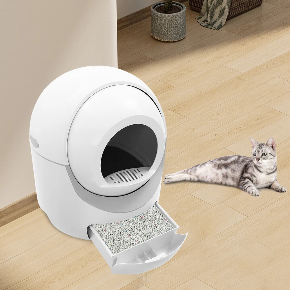 White Smart Cat Litter Box APP Automatic Self-Cleaning Litter BOX Snap-on Filter Welcome to my store ♥♥ Description This smart cat litter box can alleviate the daily chores for pet owners. Its capacious interior offers an opulent haven for your cats to conduct their business in utmost comfort. Its multiple safe mechanisms envelope your cherished pets in a cocoon of meticulous protection. It stands as a testament to the harmonious fusion of technology and pet care, endowing both you and your feline friends with an unparalleled experience of convenience and luxury. Key Features Selected Materials: It is made of high-quality PP and ABS, which are not easy to wear, rust, and deform, and can be used for a long time. Spacious Interior Space: The large internal space(54.48Qt) can accommodate cats up to 22 lbs to enter and turn around, providing your cat with a more comfortable use experience. Automatic Cleaning: Through the built-in intelligent sensing system, it automatically identifies the situation of cats entering and leaving the basin, and automatically cleans up after cats leave for 3-6 minutes, completing the immediate burial and regular cleaning of cat feces, eliminating the need for manual daily shoveling and greatly reducing the daily burden of pet owners. Convenient to Use: It supports mobile phone apps to achieve remote control, which is convenient for you to adjust the settings and monitor the cleaning status and the cat's use of the toilet anytime and anywhere. The detailed English manual allows you to quickly understand how to use it. High Safety: It features a roller design that keeps the bin opening always open, effectively preventing stuck cats. The built-in gravity sensor can accurately identify changes in external forces, so you don't need to worry even if your kitten enters accidentally. Low Noise Operation: Designed with full consideration of the feelings of pets and family members, the noise during operation is low to avoid disturbing sensitive cats and to ensure the tranquility of the home environment. Simple Maintenance: The clever detachable design, one-touch emptying design, pull-out litter box, and small brush improve your efficiency and convenience in cleaning. Fashionable Appearance: Classic white and simple round design make the product more modern. It can be well matched with any kind of room decoration and add a sense of exquisite to your room. Details Sand Leakage Pedal: This design can effectively prevent the cat litter from being taken out. Snap-on Strainer: The professionally designed filter is easy to remove and compatible with various cat litter. Application This product is suitable for cats weighing 2.2-22lbs. It can be used in families, cat houses, pet shops, pet hospitals, and so on. Specification Color: White Shape: Round Style: Modern Material: PP, ABS Target Species: Cat APP Support System: Android, IOS Remote Control: APP Plug Type: UK Standard Input: AC100-240V, 50-60Hz, 0.6A Output: 12V, 1000mA Applicable Cat Weight: 1-10kg/2.2-22lbs Barrel Capacity: 60L/54.48Qt Cat Feces Box Capacity: About 10L/9.08Qt Cat Litter Bin Capacity: 5-6L/4.54-5.44Qt Product Size(D*H): 56.5*66cm/22.24*25.98inch Package Size: 70*58*58cm/27.56*22.83*22.83inch Gross Weight: 15kg/33.07lbs Net Weight: 11kg/24.25lbs Package Included 1* Smart Cat Litter Box 1* English Manual 1* Small Brush 1* Adapter 1Roll* Garbage Bag Notes Please prepare your own UK-to-US standard conversion plug. Please check the size carefully before ordering. Please note that cat litters are not included. Please note that the base of the main unit and the top cover contain electronic components, please do not wash them, just wipe them with a damp towel. Please note that this product does not support large granule pine cat litter and crystal cat litter. Please allow the slight color difference caused by the shooting light and the 1-3 cm error due to manual measurement, and make sure you do not mind before ordering. Welcome Payment Delivery details Terms of sales About us Contact us Payment We accept ebay payment 。 Fees such as import duties, taxes are not included in the item price or shipping costs. These charges are the buyer's responsibility. Delivery details Shipping: 2-9 working days to: USA Terms of sales We maintain high standards of excellence and strive for hundred percent customer satisfaction. Feedback is very important to us. We hope that you contact us immediately before you give neutral or negative feedback, so that we can address your concerns. It is impossible to address issues if we do not know about them! About us Your satis faction is our ultimate goal. We work hard to earn your trust and future business. Our certified technicians have tested each item before shipping. The unit comes with 1 year limited warranty on all manufacturing defects. a) If you receive a defective item, you may return it or ask for a discount. Please contact us within 14 days after you receive the package. b) What you returned must be intact and in its original packaging as re? u. Customer is responsible for shipping costs of the returned item. c) We will cover the cost of shipping back t with the shipping rate indicated in the registration page. We will send you a new unit or refund the full payment you paid. Thank you. Contact us Business Hour Business Hour: Monday To Friday: 8:30 AM to 5:00 PM (Beijing China time) Due to time zones, our reply to your questions may not be immediately. But within above working time, we will reply your email within 24 hours. If it's non-workdays, please kindly be patient and wait till Monday. Please contact us with ebay message. Please feel free to contact us if you have any questions. Monday To Friday: 8:30 AM to 5:00 PM (Beijing China time) Due to time zones, our reply to your questions may not be immediately. But within above working time, we will reply your email within 24 hours. If it's non-workdays, please kindly be patient and wait till Monday. Please contact us with e