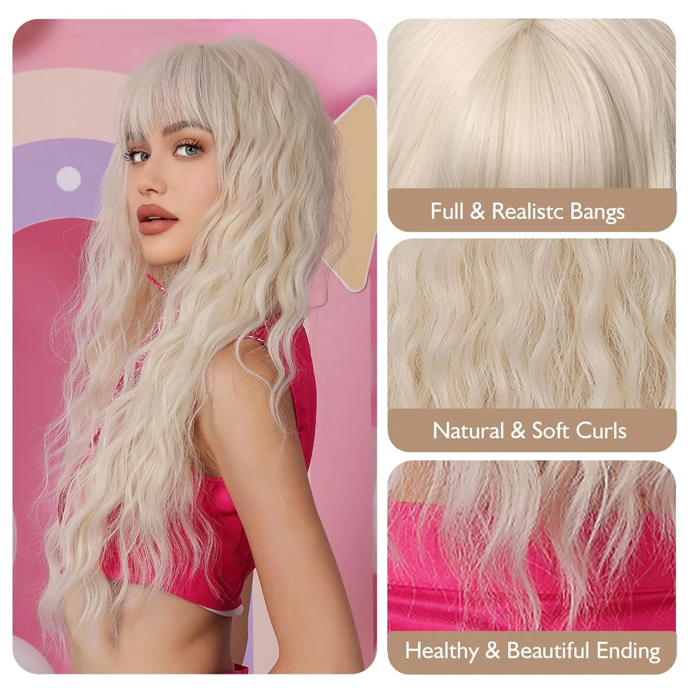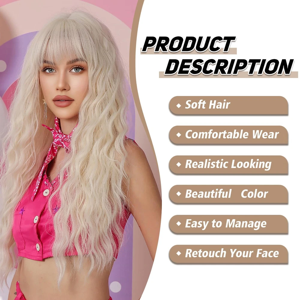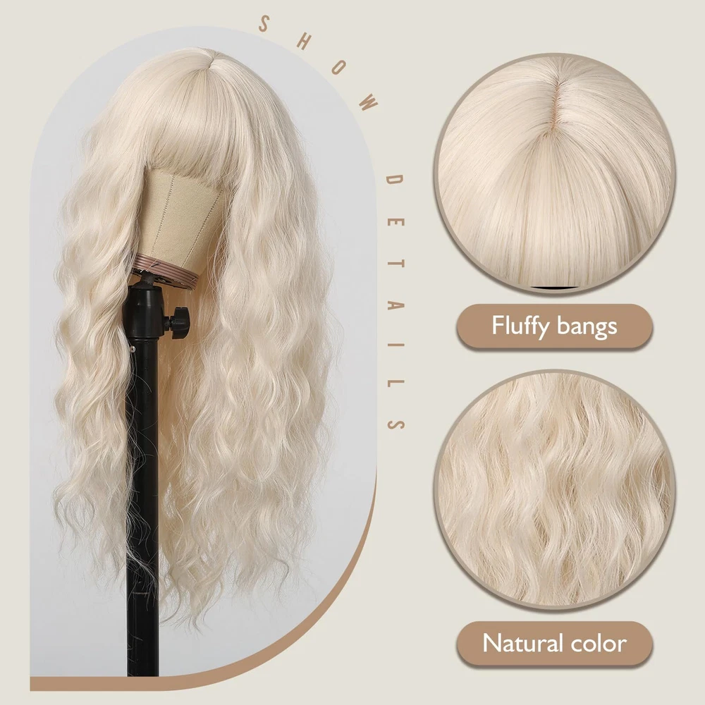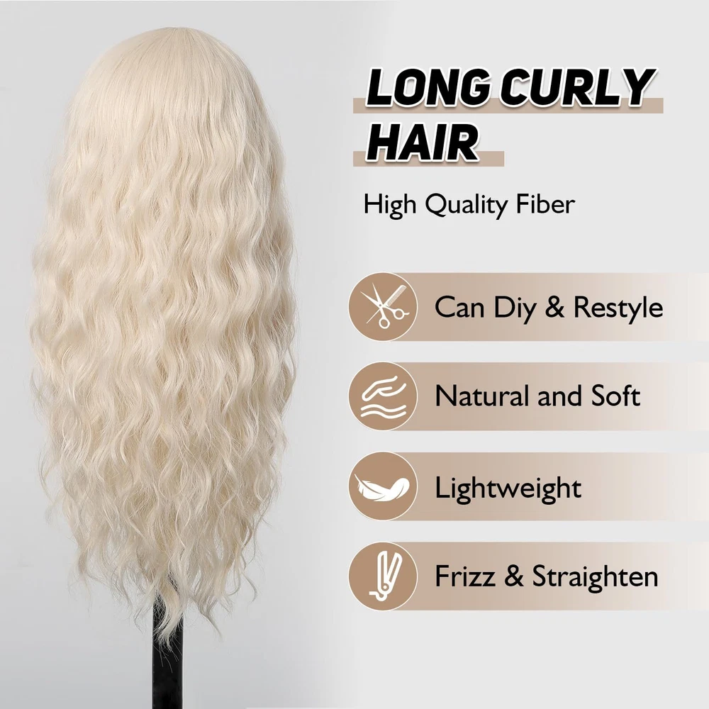 How To Wear the wigs? - Comb your own hair into a ponytail or updo - Put on the wig cap and make sure your own hair in it - Wear the wig on,the hooks are towards back.You could also adjust the hooks to the right size - Move the triangular cap tip on both sides to your temple - Comb the hair with your fingers to the style you like.You could also use spray and hair tools.The wig is suitable for many occasions MATERIAL: The long platinum blonde wavy wig is made of high-quality heat resistant synthetic fiber wig and stands heat up to 150°c(300°f). soft touching even better than your own hair, skin-friendly and soft hair made the white wig very comfortable.More durable,You can easily wear it all day.And Has a realistic look. Wig Type: This long white curly wig with bangs, length of 26 inches wigs for white women hair has a color that is popular among women's wig. Compared with other curly hair wig, the curl is more beautiful and fluffy. It has cute bangs that can better modify your face shape.Hair is softer and more like human hair. CAP & SIZE: Our white wig with a cap size of 21-23 inches. Soft straps adjust up to a 1-2 inch in either direction to achieve a more comfortable and secure fit.The wig cap is soft and breathable.It is very convenient to wear. You only need to spend 1-2 minutes before going out to wear a beautiful curly wig. Occasion: The long blonde wig with bangs is perfect for any occasion,daily,halloween,concerts,theme party, weddings, dating,christmas,working and so on.Bring you confidence in any occasion.Use your finger or wide-tooth brush to comb it when you first wear it will better. Warm Tips: The picture is taken by the camera, there is a slight color difference under different computer and mobile phone monitors.We do try our best to accurately represent colors on all of our products.And all synthetic wigs will slight shedding and tangling which is normal.We recommend that you spray some hair care solution before wearing it, which can reduce tangles.