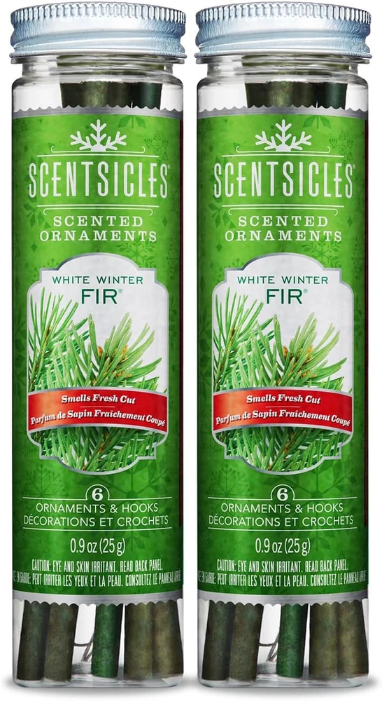 Bottle with 6 Scented Ornament sticks and hooks. White Winter Fir scent features notes of Douglas Fir Needles, Snow Covered Pine, and White Cedar. Made of sustainable, biodegradable, recyclable paper. Make holiday trees and greenery smell fresh-cut for 30 days. Hides discreetly, making your Christmas tree smell real! Scentsicles White Winter Fir Scented Ornament Sticks (2 Bottles, 12 Total Sticks). White Winter Fir captures the very essence of a fresh-cut Douglas fir and will fill your home with the smell of Christmas.