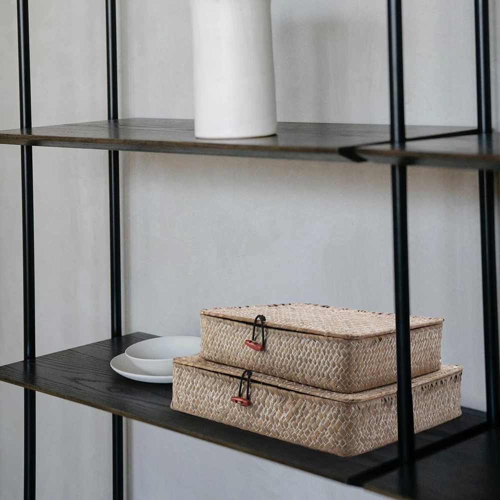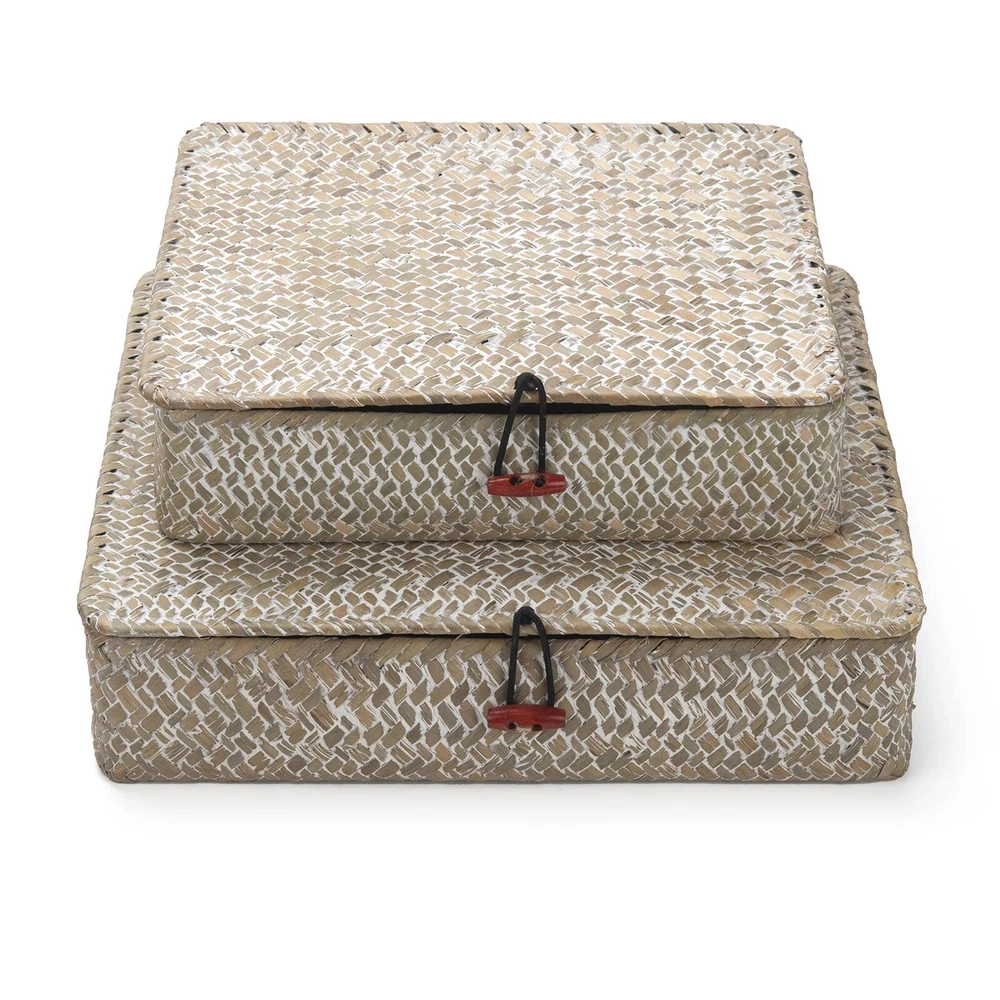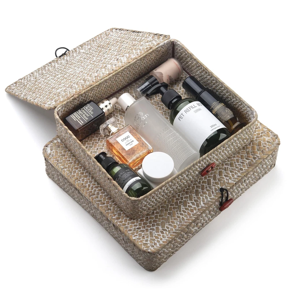 100% seagrass, include set of 2 pieces(S+L), Size: L: 12.6"x11"x2.4"H; Size S: 27*23*6, 10.6"x8"x2.3"H The organizer baskets can hold chargers, data cable, makeups, socks, underware to place on coffee table, shelf, kitchen, bathroom vanity, TV bench, wardrobe and dresser; The flat shape make it very flexible to be inserted to different places of your home. Neatly hand-woven natural seagrass baskets with lid, help you keep important things in one place and make your home clean and organized; The lid help to hide all clutter inside, make your home tidy and neat The warm brown color add a natural elegance and warmth feel to your home Premuim Material: 100% seagrass, adding a natural and genuine expression to any space. Include set of 2 pieces(S+L), Size: L: 12.6"x11"x2.4"H; Size S: 27*23*6, 10.6"x8"x2.3"H. All-Occasion Storage: The wicker baskets with lids can hold chargers, data cable, makeups, socks, underware to place on coffee table, shelf, kitchen, bathroom vanity, TV bench, wardrobe and dresser. Home Decor: Woven Storage Baskets are a great way to add storage or decorate your home or other living spaces. The flat shape make it very flexible to be inserted to different places of your home. Practical Use: Neatly hand-woven natural storage with lid, help you keep important things in one place and make your home clean and organized. Elegant Style: Natural seagrass baskets not only have the storage function, but also integrates the natural charm into the home life, The warm brown color add a natural elegance and warmth feel to your home.