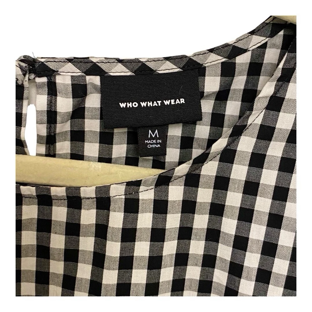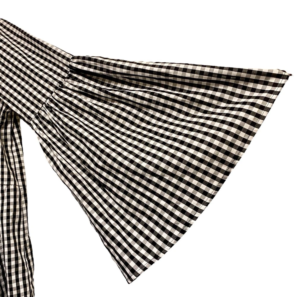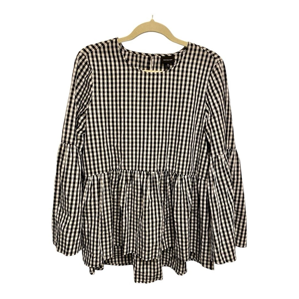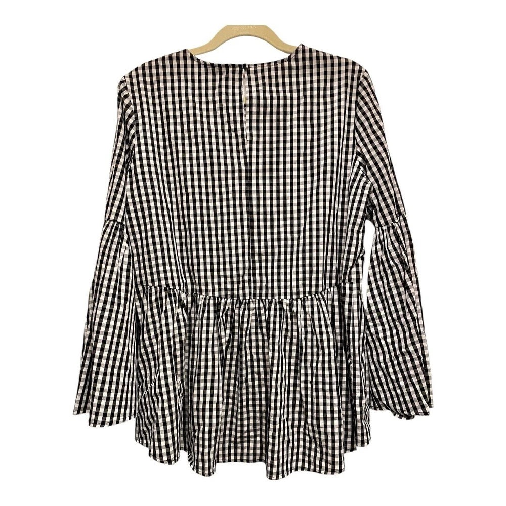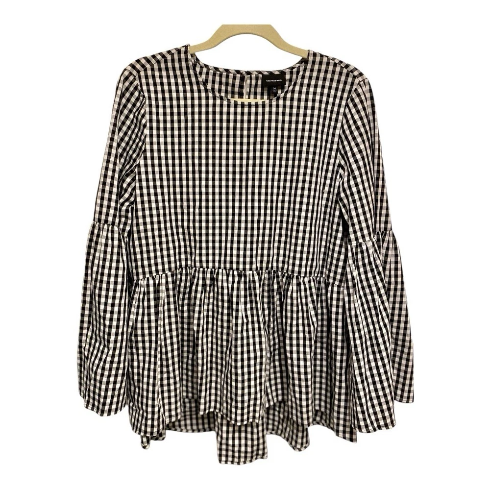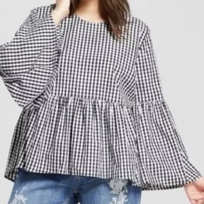 This crisp, high-contrast blouse is in wonderful, pre-owned condition with no visible flaws. Who What Wear Blouse Women's Blouse Size Medium Black and White Gingham Peplum Hem Bell Sleeves 100%Cotton Machine washable *Shipping with USPS Ground Advantage