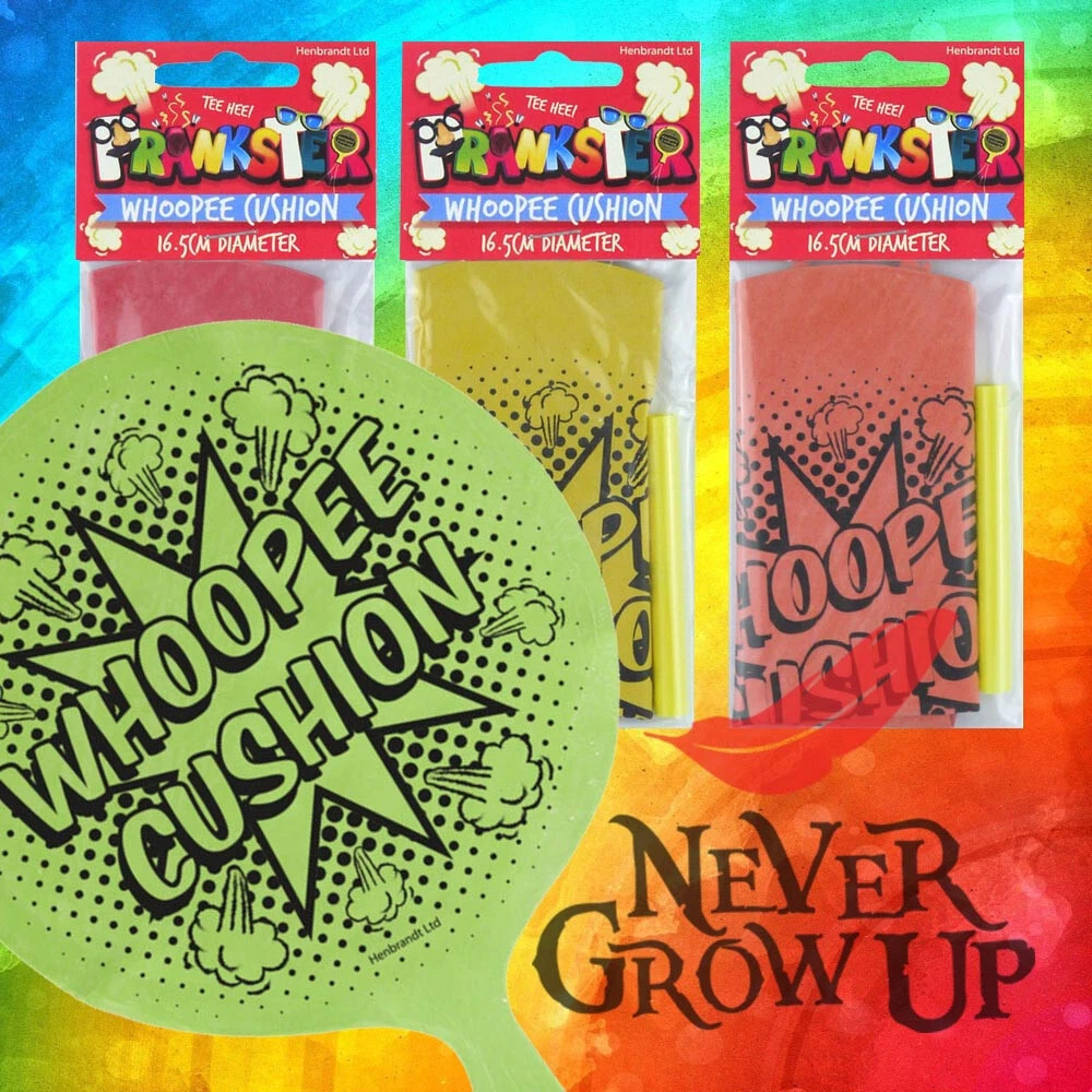 {Title} Whoopee Cushions (16.5cm) 4 Assorted Colours These whoopee cushions are ideal party favours and lucky dip prizes, and are perfect novelty presents that are a must have for any prankster! Size: 16.5cm. 4 assorted colours Select the quantity you desire from the drop down menu on the listing page. Product: wc Stock Code: -- carton quantity: -- Inner pack: --