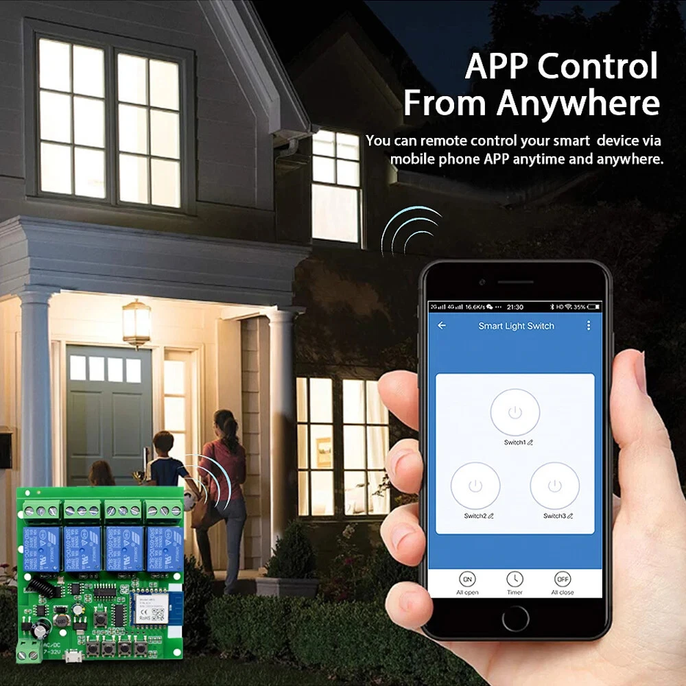 Tuya smart WIFI Wireless Smart Home Switch Remote Control with Amazon This product is a wireless switch, supports inching /self-locking mode. Users can add the device to the APP Smart life in order to remotely control connected home appliances or devices. 1、In self-locking mode, customers can remotely turn on/off connected devices immediately. 2、When in inching mode, customers can have two wiring ways to select, and you can set the inching time in APP . 3、WIFi control model, no need to program. No matter where you are, you only need to download a APP to connect the wifi and control the cloud. 4、RF mode , you can control the board with RF433 remote controller. Tuya 1/2/4CH Wifi Smart Switch Use for 1.Remotely give a pulse signal to turn on/off Lights,Lamps and other home appliance. 2.Remotely give a pulse signal to turn on/off Garage Door,Door Access. 3.Remotely give a pulse signal to control DC Motor,AC Motor to Forward and Reverse. Features: *App Support: Free iOS and for Android mobile Tuya APP/Smart Life APP. *Sync Status: Real-time device status provided to App. *Remote ON/OFF: Turn 4 electrical devices on/off remotely from anywhere. *RF Remote control: Turn on/off by 433MHz RF Remote indoors. *3 Working Modes: Switch among interlock/self-locking/inching modes. *Independent control: Control each gang separately in Tuya APP/Smart Life APP. *Supports remotely turn on or off connected appliances, for example light, electric kettle, electric rice cooker, electric curtain, Garage door opener,Motor,etc. *Timing: Supports 8 enabled countdown/single/repeat timing tasks to turn on/off at specified time. *DIN Rail Mounted: Great for industrial control. *Voice Control: Compatible perfectly with Amazon Alexa, for Google Home, for Google Nest,IFTTT. *Share Control: Control your smart home together with your family. Note: Please make sure to select the right model before buying ,or leave us a message before shipping Noted : Your have the correct wif password. Your smart phone or tablet must have access to APP store or google play. Your router is MAC-open. Your smart phone or tablet has connected to a 2.4g wifi with internet. Default inching time 1s , you can set inching time from 2s to 3600s in APP ( smart life / tuya smart). Features: Input voltage : DC/AC 7-32V , AC 85-250V,Micro USB 5V input. Max current : 2200W/10A. WiFi standard : WiFi 2.4 ghz b/n/g. Size : 1CH 69*41*20mm,2CH 10*35*20mm,4CH 78*74*20mm. The life of Relay Model is more than 1,000,00. Default inching Function: Press the open relay by mobile phone, then cut off the pull-on imediately, you can set the inching time in APP , it has the timing-share function at the same time. Self-locking when press the inching and locking button with the light on. Press open relay to pull-on, press close relay to cut off. Include: 1* wifi module 1* manual Overview: This product is a 4 channels universal WiFi wireless smart switch with RF 433MHz module, for your smart home system to remotely and automatically turn on/off home appliances and electronic devices by phone APP. It also can be controlled by RF remote controller indoors. It can connect and control four appliances on APP at the same time, and you can independently turn on/off each of the four gangs. It also supports timing turning on/off the appliances at a specified time, and share to others so that you can control your smart home together with your family. You can also voice control your home appliances by Amazon Alexa, and for Google Home/Nest,IFTTT, and enjoy intelligent life and make your home smarter.