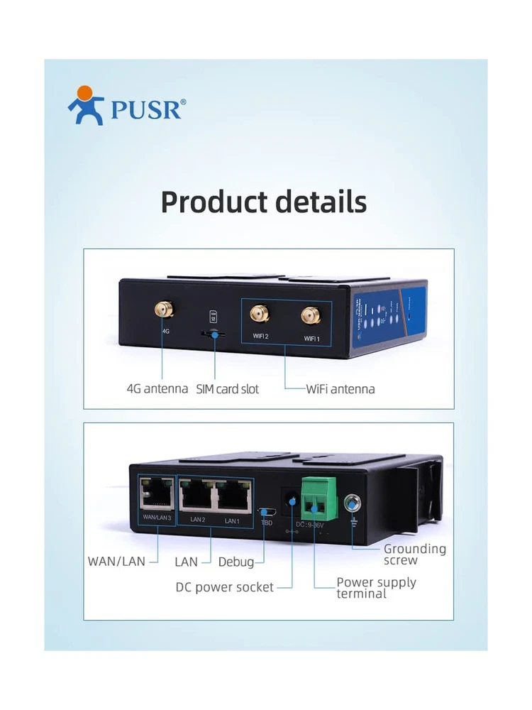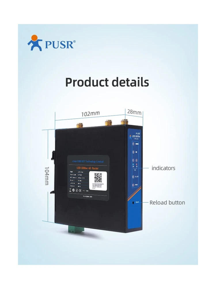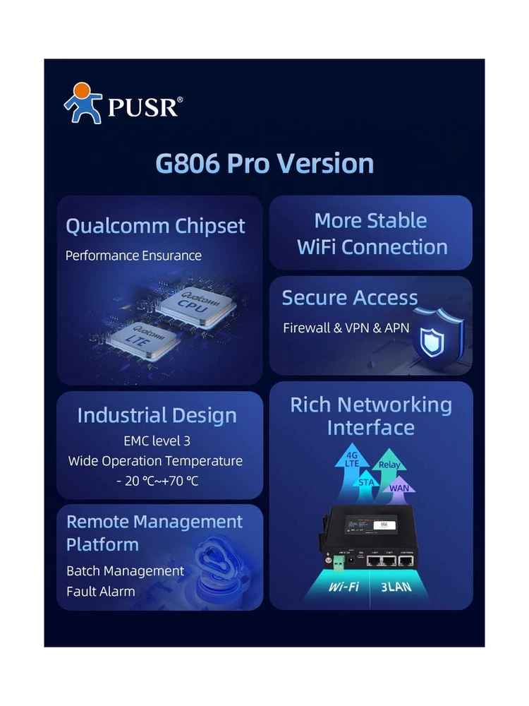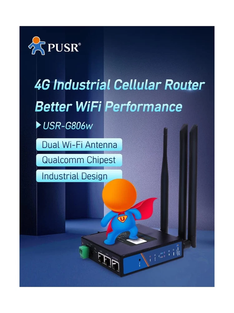 WiFi Enhanced IoT Industrial Cellular 4g Router with 2G/3G/4G Enhanced OpenVPN Design USR-G806w-G Global Version Product Details Brand: PUSR Special Feature: 远程访问 Frequency Band Class: Dual-Band Wireless Communication Standard: 802.11b Compatible Devices: 个人电脑 Recommended Uses For Product: Business Included Components: LTE Rubber antenna*2, power adapter*1, USR-G806W-G*1, Wi-Fi Rubber antenna*2 Connectivity Technology: Ethernet, Wi Fi, LTE Antenna Type: Fixed Security Protocol: WPA-PSK, WPA2-PSK Package Dimensions: 10 x 7 x 3 inches Item Weight: 2.2 pounds Item model number: G806W-G Date First Available: September 20, 2023 Manufacturer: PUSR Country of Origin: China Embedded hardware watchdog, self-recovers from malfunctions, maintaining high device availability. Supports 2G/3G/4G network all over the world ,supports APN/VPDN sim card. Equipped with strong Wi-Fi capability,802.11 a/b/g/n,2.4G Wi-Fi,2*2 MIMO, up to 300Mbps,Support AP/STA/repeater mode Supports PUSR cloud platform to facilitate remote monitoring and central management of large-scale device networks. Supports IPsec VPN, PPTP,L2TP, OPENVPN,GRE etc., ensuring secure data transmission. Supports firewall functions including NAT, access control, DDoS defense, IP-MAC binding, etc., protecting the network against external attacks. Supports APN automatic inspection ,mode switch ,SIM information display, supports private sim card. Allows multiple network management methods including SSH, WEB, TELNET and a network management platform. Supports firewall, NAT,DMZ,black and white list of access control Failover between 4G and WAN, ensures automatic switch to alternative backup connection,effectively ensuring uninterrupted data transmission. USR-G806w is the pro version of our all-time bestseller G806 that inherited its' best features, including industrial design, compact size, multiple connection interfaces. It delivers high performance for mission-critical cellular communication in rigorous environments. Equipped with 4G LTE, Wi-Fi, and three Ethernet ports, this router offers unstoppable connection continuity with a backup through automatic WAN failover. The Wi-Fi is functional in: Access point, Station mode and repeater mode. USR-G806w is an excellent fit in various IoT and M2M solutions that require easy setup, reliable network, and remote accessibility, such as service robot, inspection robot, unmanned vehicle networking, massage chair networking, AGV car and other industrial application scenarios. Payment Back to Top We accept Paypal and All Major Credit Cards. Shipping & Handling Back to Top Item will be shipped FREE standard shipping in 1 business day after payment is received. Express Shipping services are available. Tracking number will be provided. Return Policy Back to Top Items can be returned for exchange or full refund within 30 days from the date you receive your merchandise. Please contact us before starting a return request, so we can resolve any issues and provide free returns if needed. Return shipping is the responsibility of buyer unless the return is a result of our mistake (i.e., your receive the wrong item). Contact Us Back to Top If you have any questions please contact us. We will respond within 1 business day or less.