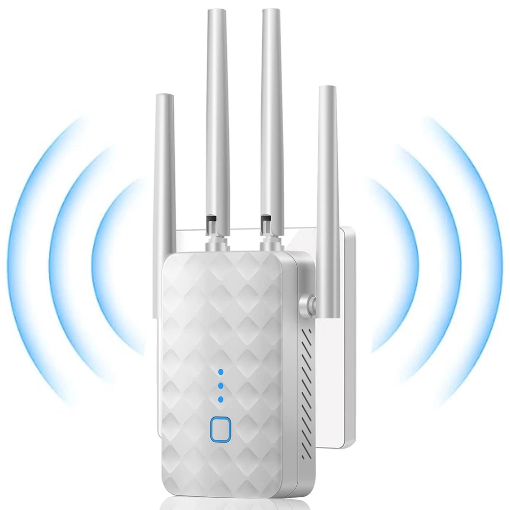 【1200Mbps Dual Band Gives 360° Full Coverage Signal】:This WiFi extender signal booster with all-new dual band technology can provide up to 300Mbps for 2.4GHz, up to 867Mbps for 5Ghz, totally rate of about 1200Mbps. This WiFi extender can expand the existing wireless network to hard to reach areas,covering up to 360 degrees, up to 10000 square feet and 55+ devices and farthest reduces the loss of data transmission, creating a stable network for you to enjoy fast speeds internet mode. 【Plug and Play -One-Tap Setup】: This WiFi repeater can extend WiFi signal easily by pressing the WPS button. You can also choose to use your mobile phone or PC to setup, connect to WiFi, enter the password to complete the setting. Or set up via browser website(192.168.11.1) on almost any devices, including Windows/Android/iOS mobile platforms. No challenging installation process. And an user manual also can help you to set it up quickly. So excellent WiFi extenders signal booster for home ! 【3 Modes : Repeater / AP Mode / Router Mode with 2*Ethernet ports】The WiFi extender can instantly switch 3 modes - Repeater/AP/ Router Mode to meet your different needs. The 2*Ethernet ports can make wired network to be expanded into a wireless network and connect to any wired Ethernet devices such as smart TV. NOTE:Set up the extender NEAR the router, or the installation may fail due to weak signal caused by long distance. After finishing the setup, you can re-plug extender to other places. 【Universal Compatibility up to 55+Devices-with 4 antennas】The WiFi extender signal booster easily connect to all brands of router, keep a strong connection for your devices like Roku, Fire Stick, xbox/PS, doorbell cameras, garage doors, smart plug etc. The 4 Powerful high-gain external antennas also greatly enhance signal, gives you a fluently internet enjoy. NOTE: Keep the antenna as vertical as possible to the ground for great signal. 【WiFi Extender Signal Booster Placement&Secure Network Access Protocol】:This all-new WiFi booster extender uses the Bionic Encryption Module processor to provide the latest WEP / WPA / WPA2 security protocols for additional security and privacy features, which can ensure your network safety, perfectly solve privacy problems of WiFi. Our team offers 180 days return or replacement quality warranty & 7*24H lifetime technical supports. Pick us and you will have a wonderful shopping experience!