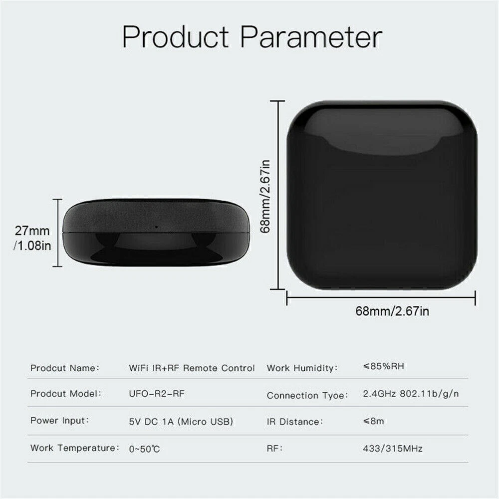Product Description If you have any questions, please contact customer service first, do not open disputes easily, thank you! Features: 100% Brand New and High Quality! Newest version with RF and IR highly compatible:All-in-one IR and RF remote control devotes to activating Air conditioners, TVs, fans, DVDs, STBs, TV BOXes etc Infraed devices and even RF appliances as RF light,RF switch, RF roller blinds etc with one single remote control;storage of thousands of IR codes.(Support IR 38KHZ and RF 433/315MHz) Multiple remote control RF protocol ensures a better user experience for controlling different 433MHz RF devices as curtain\shades motor,light switch;Local IR code for faster response. WiFi/4G App Remote Control from Anywhere:Equipped with MOES new smart controller,you may control IR and RF devices with free mobile "Smart Life/Tuya" App anytime from anywhere(Compatible with for Android & for iOS).Control your appliances in advance when you are away from home.Turn your smart phone into a universal remote in an easier way. Hands-free Voice Control: for Alexa,set A/C to 77 degrees Fahrenheit. A simple voice command can activate the controller to remotely control most Infrared and RF Control Devices,such as A/C, FAN ,TV, DVD, STB, TV BOX and RF protocol devices.(Furthermore compatible brands or devices ,please check attached list or Smart Life App.) Customized DIY Copy Function: If you can not find device brand in "smarlife"App, Programable DIY learning function may help to copy same function from original remote. Most IR and RF remote control Devices will be applicable such as fireplaces, heater, ceiling fans. Specifications: Power Input: DC 5V/1A(Micro usb2.0) Model: RF-R1 Stand-by Power: ≤0.4W Controlling Distance: Horizontal direction ≤8m, Opposite Direction ≤15m(Finally effect by environment) IR control direction: Multiple Way Operating Temperature: -10℃~50℃ Operating humidity: ≤85%RH Connection type: 2.4GHz 802.11b/g/n Carrier: 38KHZ APP SUPPORT: for Android 4.0/for iOS 8.0 above Wireless Frequency: 2.4GHz RF:433/315MHz Dimension: 7*7*4.8mm/0.27*0.27*0.18in Package Includes: 1* Universal IR remote control 1* power cable About Us We accept all payments authorized by eBay. About Us We accept all payments authorized by eBay. powered by