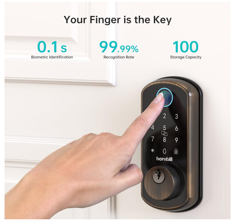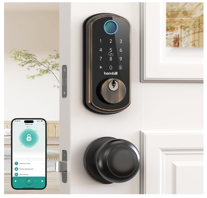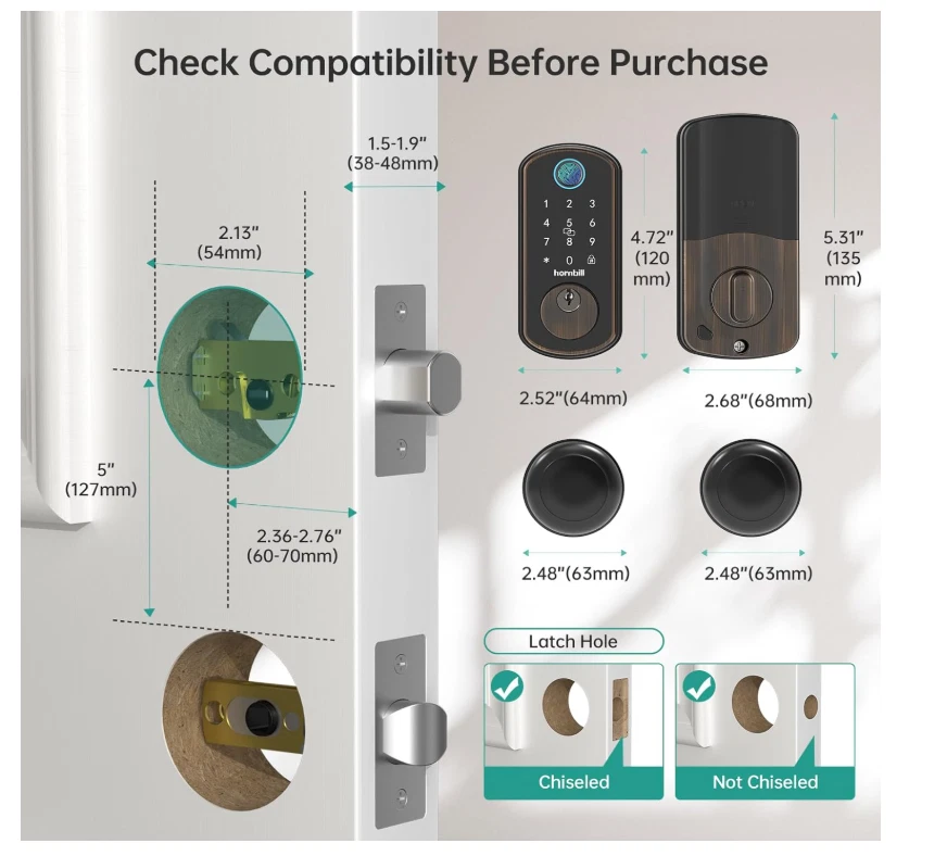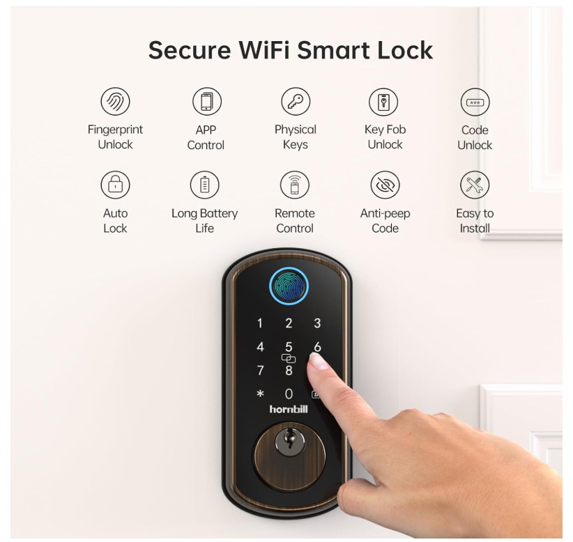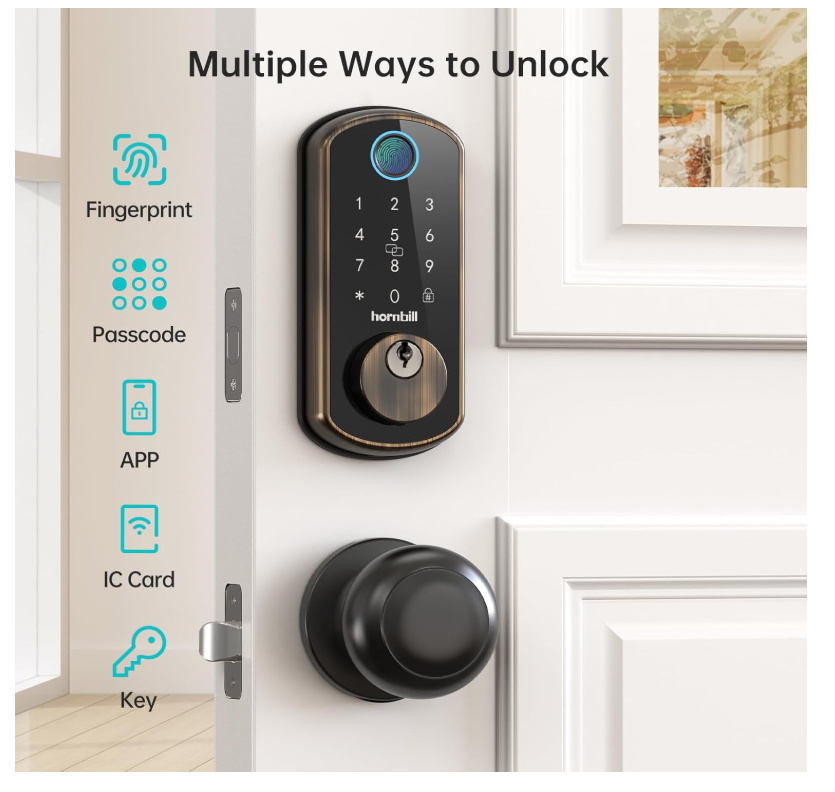 Keyless Entry Door Lock: This smart lock offers the utmost convenience and security for your home, providing multiple access options including Fingerprint, Passcode, Bluetooth App, Physical Keys, IC card, Alexa /Google Voice and Remote Access. Allowing you to control your door lock easily and securely. WiFi Remote Access: Our smart WiFi deadbolt, paired with an additional WiFi gateway, allows you to remotely lock and unlock your door. Enjoy the convenience of Receive real-time notifications, remotely share or modify passcodes for visitors, and view lock history, check door electric usage logs. 250+ Multiple Passwords: Smart door locks can generate and share Time-Limited, One-Time, Dynamic, Custom code ,Anti-Peeping Code Suitable for families, Airbnb, Motel, Hotel, Apartment and different visitors or Your Friends. Note: The system locks up for 2 minutes after 5 consecutive failed attempts to use password/fingerprint/IC card authentication. Long Life: The WiFi door lock is powered with 4 AA batteries (not included) that can last up to 6 months. The Smart Life APP will remind you to replace the batteries when they're low alarm, and you can also check the status in the APP at any time. Emergency use of the backup power supply TYPE-C is also possible. Use TYPE-C in emergencies to plug in a backup power supply. Lock Knob Dimensions: No additional hole drilling is required for the smart lock installation. The door handle also features an adjustable screw hole, allowing for easy adjustment of the previous door handle. the installation process takes just 15 minutes. The stainless-steel adjustable latch with a backset measure either 2-3/8" or 2-3/4" (60mm or 70mm), ensuring compatibility with US Standard doors ranging in thickness from 1-3/8" to 1-3/4" (35mm to 45mm). Reliable Service: Hornbill smart locks for entry doors offer 12 months replacement, along with a lifetime of troubleshooting. After receiving the front door lock sets, a follow-up email with instructions will be sent to ensure their proper functioning. Any questions such as app or installation issues, please contact us at any time.
