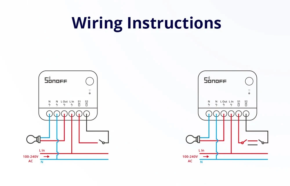 【Super Tiny Size】 Its compact size allows it to be installed in various mounting boxes, including the smallest European standard. 【External Switch Control】 Easily connect to the momentary switch, door exit switch, SPDT switch, latching switch, and even dry contact sensors. 【Detach Relay Mode】 MINIR4 has “detach relay” mode, which means the states of external switches and relay are separated, so operating the external switch button won’t affect the relay state. 【eWeLink-Remote Control】 MINIR4 is a smart switch with the gateway function of “eWeLink-Remote”. You can add “eWeLink-Remote” sub-devices, R5 and S-MATE, after pairing with MINIR4, both R5 and S-MATE can act as remote controllers to control MINIR4 locally through the eWeLink-Remote signal. The combination of S-Mate2 and other devices with the gateway function of “eWeLink-Remote” can meet various home automation needs for your family, such as two way control, no neutral wire solution, etc, making your life more convenient. 【Safe & Reliable】 TÜV, CE, and FCC certifications ensure a safer and more reliable product. MINIR4 is a mini extreme WiFi smart switch equipped with ESP32 chip, that turns traditional switches into smart switches, automating lights and electronic devices, and tiny size fits in various mounting boxes, including the smallest EU-type/86 type/120 type mounting box. MINIR4 supports external switch control and easily connects to the momentary switch, door exit switch, SPDT switch, latching switch, and even dry contact sensors. MINIR4 has "detach relay" mode, which means the states of external switches and relay are separated, so operating the external switch button won't affect the relay state. Such as, if you open detach relay" mode, when you turn off the light, your smart light won't be offline, and you still can use App to control smart lights. MINIR4 is a smart switch with the gateway function of “eWeLink-Remote“. After pairing with MINIR4, MINIR4 can be controlled locally by S-MATE through "eWeLink-Remote" signal, and trigger other smart devices in the smart scene.