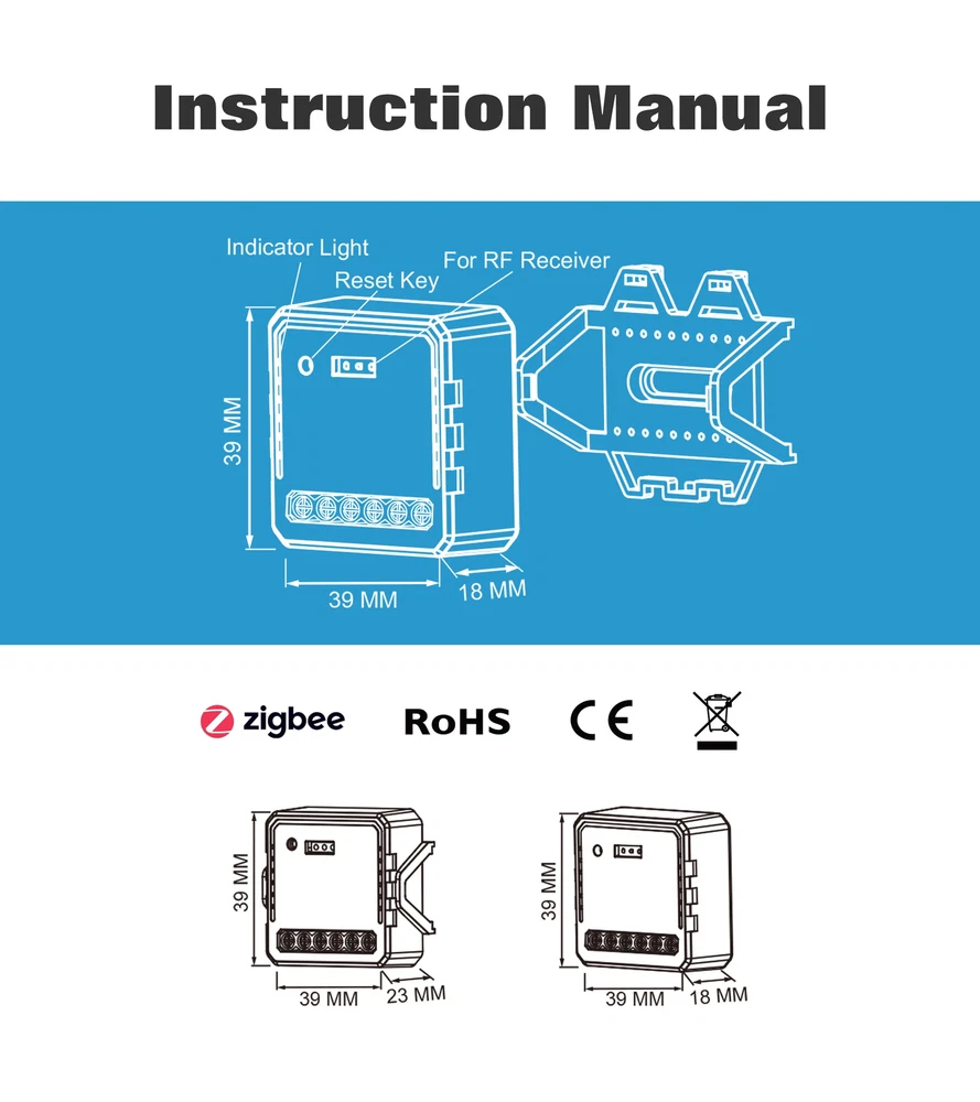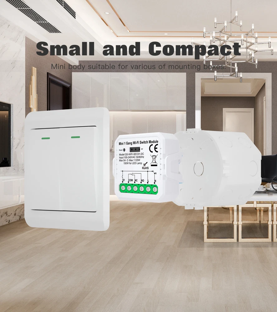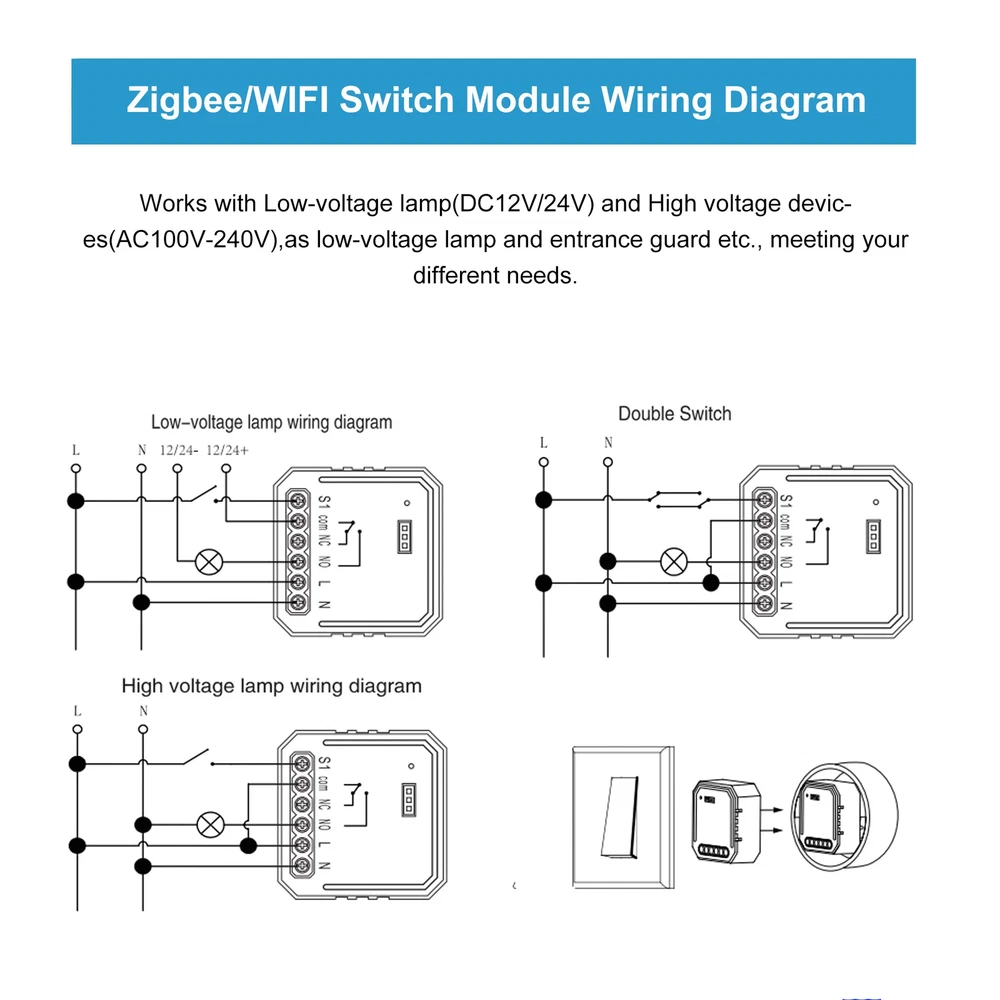 NotePlease pay attention to the wiring diagram and the description in the manual, and use the correct wiring method. If you don't know how to connect, please contact us. Feature: Works both low-voltage and high-voltage according to your different needs. Neutral wire is required. APP Remote Control: Turn on/off the devices effortlessly from anywhere after connected the module to TuyaSmart/Smart Life APP. Convenient Voice Control: Just need simple voice commands to trigger the dry contact through Alexa/Google Home Assistant/Alice,turn on/off the device effortlessly and more conveniently.Enjoy your smart life. Timer Schedule: With flexible timer setting, you can trigger connected devices on time while saving energy. Relay Status Function: With Relay Status Function, you won't have to worry about power outages as you can set on/off/remember the last status of the smart dry contact as relay status. Professional Certificates: Trust in our professional certifications and high-quality products to provide peace of mind and ensure safety. Sharing Function: Share the device to your family and friends,enjoying smart life together SPECIFICATION: Product Type: Smart Switch Module DC Relay: NO,NC Working Voltage: AC100-240V 50/60Hz;DC12V/24V Max. Load: LED 150W, 5A Operation Temp.: -10℃~ +40℃ Working Humidity: ≤90% WIFI Protocol : IEEE 802.11b/g/n Operation Frequency: 2.412GHz-2.484GHz Operation Range: <100m Dims (WxDxH): 39.2x39.2x18 mm IP Rating: IP20 Certificates: CE ROHS APP: TuyaSmart/ Smart Life Voice: Alexa/Google Home Assistant/Alice Warm Tips: 1.The switch module terminal reserves the access of manual override function for the end-user to switch on/off. Switch on/off for permanent on/off function. Notes: 1) Both the adjustment on App and switch can overwrite each other, the last adjustment remains in memory. 2) The App control is synchronized with the manual switch. 2.Installation must be carried out by a qualified electrician in accordance with local regulations. 3.If you choose Tuya ZigBee devices,please use Tuya ZigBee hub as a center. 4.If you have any question after you received the parcel ,please feel free to contact to our online after-sales,we will help you solve the problem. Q&A What's Dry Contact Module? The dry contact module is a versatile electrical switch that responds to external signals, controlling other electrical equipment. With no need to worry about directions or polarity during installation, simply ensure the correct signal current and voltage levels are maintained. Why Choose Dry Contact Module? Compatible with mechanical reset switch and rocker switch,suitable for various mounting boxes.