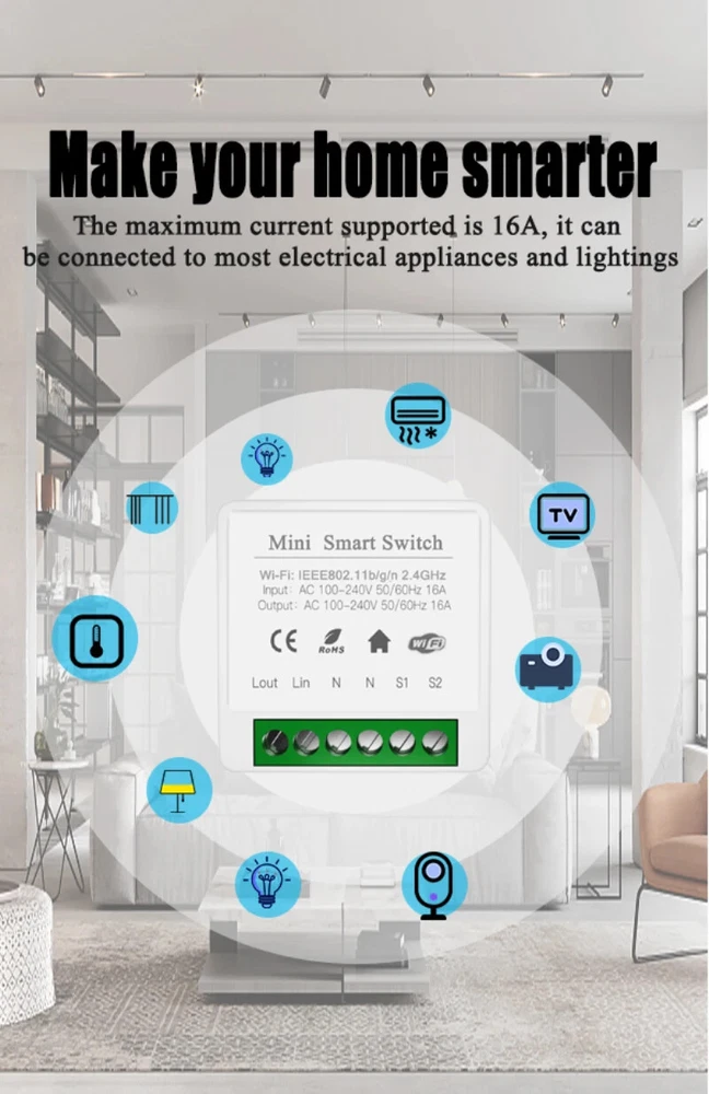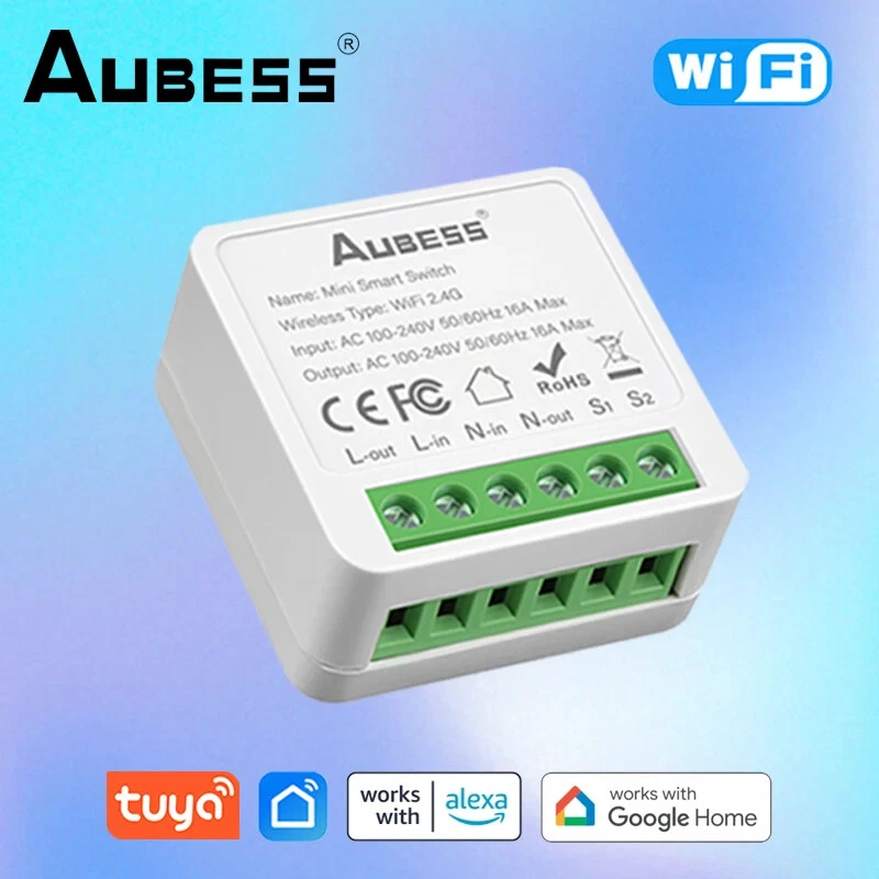 AUBESS Tuya Smart Home Gadgets Mini WiFi Smart Switch Light Switch Relay Module Voice Control For Alexa Alice Google Assistant Description: 1. Refit non-smart appliances or equipment into smart devices. Such as refitting a desk lamp into a smart desk lamp, and mobile phone can control the switch of the light. To turn the downlight into a smart downlight, you only need to connect a smart switch module to the switch, and then Alexa/Google assistant can control the light switch. 2. Mobile APP control. Control the device's power on and off, timing, countdown and other functions through the mobile phone. As long as the mobile phone has a network, the switch module at home can be controlled globally. 3. Voice control. Support voice assistants such as Tmall Genie, Alexa, Google Home, and realize functions such as switches; "Alexa, turn on the kitchen lights." You can turn on the lights in one sentence and enjoy a convenient smart life. 4. Timing. You can control the switch, timing, countdown and other functions of the device through your mobile phone. This can be ordered: turn off the lights in the living room after 2 hours. 18:15 Turn off the oven. Turn on the boiler at 21:00. You can also time the device when you are not at home. (APP: Smart Life/TUYA Smart) 5. Group control. The lights can be grouped to achieve unified control (simultaneous switching, timing, etc.); 6. The Internet of Everything. Through settings, it can be linked with other smart scenes to make life smarter; for example, set the home scene: automatically turn on the living room lights, TV, and air conditioner. 7. Sharing and security. The main account can be shared with other family members, and the functions and settings are completely retained and copied; security: once the main account adds a light, the light will be and other users can no longer find and add; it needs to be actively shared before others can use it it. 8. Bluetooth fast matching. Turn on Bluetooth, the phone will quickly find the device, speed up the connection, and stabilize the connection. 9.State memory. Resume the power after the power failure, without worrying about the change of the equipment state, and maintain the state before the power failure. It was in the open state before the power was cut off, and the open state is automatically restored when the power is turned on again. (Can be set to open, close, power off memory mode) 10. Three wiring methods.(2-way/1-way/non switch) Can be directly connected to the device without connecting a switch. It can also be connected behind the switch to support single control switch and dual control switch. It can be directly installed in the switch box to the switch module. It can also be installed on the dual-control switch without affecting the use of the dual-control switch. 11.WiFi connection, no gateway required. DIY, the connection method is simple, everyone can DIY the device and turn the non-smart device into a smart device. Specifications: Color:white Output:AC 100-240V 50/60Hz Input:AC 100-240V 50/60Hz Wi-Fi:IEEE 802.11b/g/n Material:PCV-0 Certified product:CE ROHS Maximum current:16A Package Included: 1*mini smart switch module,1*Manual