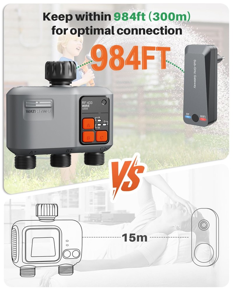 WiFi Sprinkler Timer 3 Zone with 984 Feet RF Gateway, 3 Outlet Smart Water Timer for Garden Hose with Rain Delay/Manual/Automatic,WiFi Water Hose Timers for Garden & Lawns 984 feet (300 M) Ultra-long Distance Connection, Wider and More Stable Coverage: The Wifi water timer uses advanced RF technology, the gateway and the water timer is up to 984 feet (300 meters), easily cover large areas of gardens and courtyards.Allows for true remote operation and easy garden irrigation management. APP Remote Control & Voice Control, Easier Garden Management: Add the WiFi sprinkler timer to the WiFi gateway (2.4GHz WiFi only) via the "Smart Life" APP, you can remotely control the watering plan (watering frequency, duration) anytime and anywhere. It also supports Alexa and Google voice control, making it easy to manage your garden with just your voice. 3 Outlet Independent Control, Easy Control Different Areas: WiFi hose timer with 3 independent irrigation valves. Each valve can be individually programmed. Through different outlets, different watering plans can be set up separately to meet the irrigation needs of different areas such as lawns and gardens. 3 Irrigation Modes for Precision Watering & Water Savings: The water timer for garden hose has a timed irrigation mode and a spray mode. In irrigation mode, up to 5 watering procedures can be customized per outlet and the duration can be adjusted. The spray mode allows flexible adjustment of runtime and interval time. Both modes support weekly cycle frequencies. Help you fully save water bills. Rain Delay & Irrigation Record, Smarter Management: This smart hose timer 2 Outlet has a rain delay function and supports 1-7 day watering delays to avoid waste during rainfall. Have a separate watering log page that details the start time, duration and end time of each watering. Manual Mode, Flexible Operation is More Convenient: The WiFi hose timer also supports manual mode, which allows more flexibility to use the control button to start or stop watering at any time. Emergency watering can be quickly started in special circumstances to ensure plant safety. Extensibility & Waterproof, Built a Smart Irrigation System: This WiFi water timer for garden hose can be expanded to connect with multiple smart timers (no more than 4 recommended), easily covering a larger area of the garden; IP55 waterproof, durable, stable operation even in bad weather outdoors, ideal for building a smart garden irrigation system.