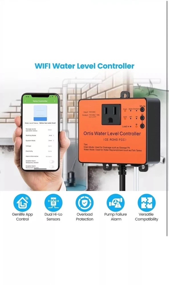 Open box New item! EFFORTLESS PUMP MONITORING: Effortlessly monitor your basement cesspool with the Genilife App Pump Control. No more rushing downstairs – control your pump from anywhere. Manage water intake, drainage, check levels, and select modes with ease. PREVENT PUMP DAMAGE: Prevent pump damage with continuous monitoring and pump failure alarms. Avoid costly repairs and protect against water damage. Identify issues like dry running, faulty float switches, clogs, or damaged parts promptly. KEEP YOUR SPACE DRY: Keep your space dry with push notification alerts for power outages or pump failures. Ensure your sewage pump system runs reliably, safeguarding your basement from water damage. DURABLE HI-LO SENSORS: The Ortis pump controller features durable hi-lo sensors with patented 10-year water level detection. Made from corrosion-resistant 304 stainless steel, these sensors ensure optimal performance and reliability. With no moving parts in the pit, extend your pump's service life. COMPATIBLE WITH VARIOUS PUMPS: Compatible with various pumps and pits (>2Hp, 20A), the controller installs easily without plumbing alterations.