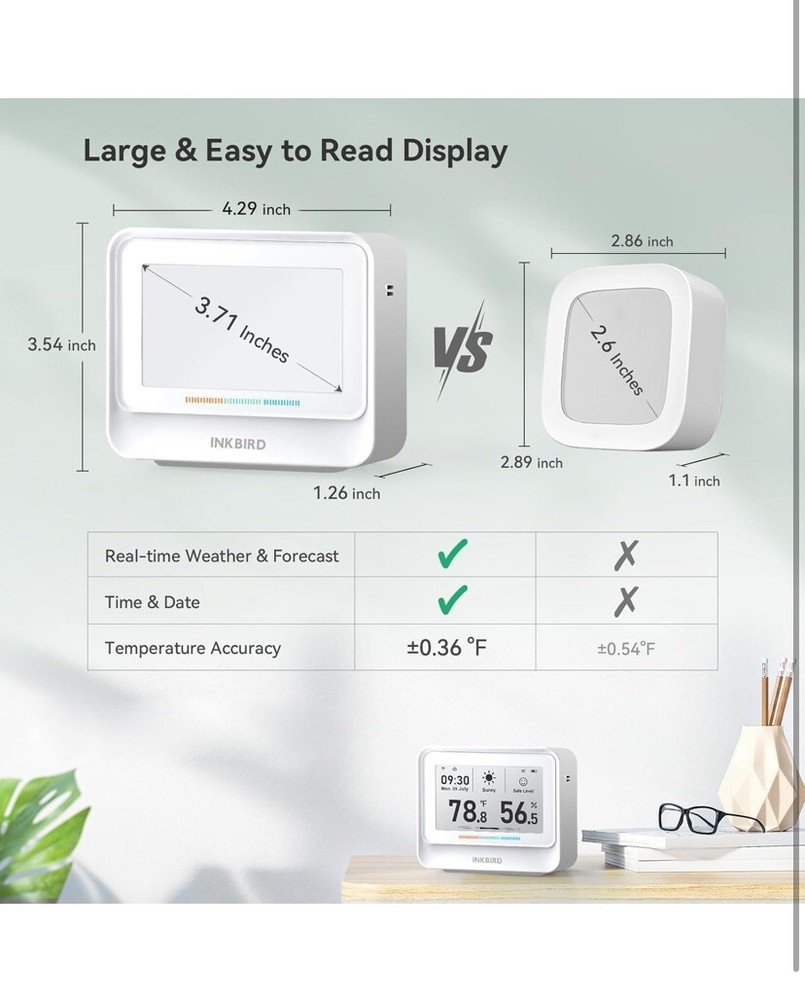 Multifunctional WiFi Thermometer Hygrometer】: It's a temperature and humidity monitor with a comfort color bar, but also displays time, date, and week, and supports weather forecast and environmental assessment for colds. 【Real-Time Weather and Forecast】: The smart weather station will automatically sync weather data, get real-time weather information and check tomorrow's weather forecast at any time. 【Large & Easy to Read Display】: This WiFi temperature sensor has an ultra-big electronic ink display screen of 3.71 inches; Features high contrast, ultra-wide viewing angle, and is easy to read. 【WiFi Remote Monitoring】: Connect this remote temperature monitor to a 2.4GHz WiFi, you can view temp and humidity anytime anywhere on the INKBIRD app. Free data storage and export for up to 2 years. 【High Precision Sensor】: The WiFi temperature monitor uses an advanced Swiss-made Sensirion sensor that quickly refreshes data every 2 seconds. Temperature accuracy: ±0.36°F/±0.2°C; Humidity accuracy: ±1.8%RH. 【Long Battery Life】: The built-in 2000mAh rechargeable battery the temperature and humidity sensor can work continuously for 12 months after a full charge. Longer battery life makes the indoor thermometer for room temperature more environmentally friendly and convenient. Perfect for bedroom, wine cellars, basements, etc.