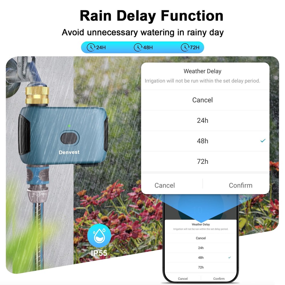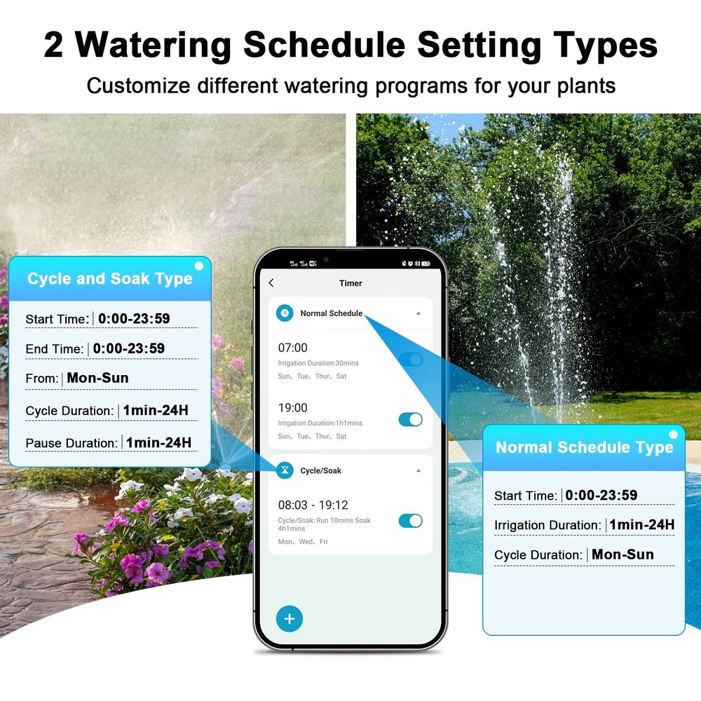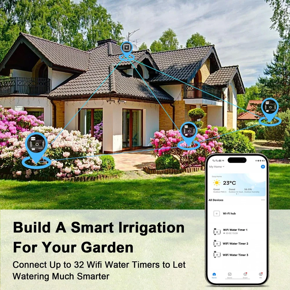 Hose Timer ,1 Outlet 【Easy App Control】: Adding the WiFi Sprinkle Timer and WiFi hub to Smart Life APP to connect the water timer with 2.4Ghz WiFi, you can manage watering programs by the App anytime and anywhere and check watering history. No need to worry about forgetting watering your plants anymore. 【Long-Lasting Durability】The Sprinkler timer is designed with heavy-duty construction and made of IP55 Waterproof anti-UV coating and anti-rust ABS platisct materials. Battery compartment has built in sealing strip to effectively prevent water from entering. Support 4* AAA 1.5 Alkaline batteries(excluded), Sustainable use for 1 year. 【Smart Voice Control】: Insoma outdoor sprinkle timer is compatible with Alex and Google Assistant, allowing you to turn the watering timer on and off using simple voice commands. Enjoy the hands-free convenience of controlling the watering system with your voice. 【Bluetooth Control Function】: Besides controlling by WiFi hub, the WiFi sprinkler timer can also be controlled by Smart Life APP via Bluetooth. Even if there is a power outage in your house and the WiFi hub can’t work, you can still set up and manage watering programs on the App via Bluetooth. The maximum Bluetooth working range is 60-70ft in the open area without obstruction. 【2 Irrigation Modes】: Under normal schedule, the hose timer run on its own and water at a specific time. Customize its start time, irrigation duration, and watering weekly day to meet your different watering needs. Under the cycle/soak watering mode, the faucet timer will cycle watering within the preset start and end times automatically. When watering schedules are set, the irrigation timer will take over the control of the lawn and garden. 【Manual Watering & Weather Delay】: In manual mode, water as desired at any given moment, choosing a customized time ranging from 1 minute up to 24 hours, and don't worry about disrupting preset schedules! With weather delay function, you can pause programmed schedules for 24h, 48h or 72h, then it resumes automatically. 【Extended Irrigation System】: One WiFi hub can control up to 32 WiFi water timers , building a smart irrigation system for your garden. And one WiFi water hose timer can set up to 20 watering schedules (10 normal schedules and 10 cycle/soak schedules ), meeting your different watering demands. Also, you can add family members to the App and share home irrigation management. 【Waterproof & Low Power Consumption】- Made of IP55 waterproof, anti-UV coating and anti-rust materials, added the seal ring in the battery cover to isolate moisture which is perfect for outdoor using. As it needs a low power consumption, the battery life is more than 6 months. When the battery is lower than 20%, the app will alert and remind you to change the battery.